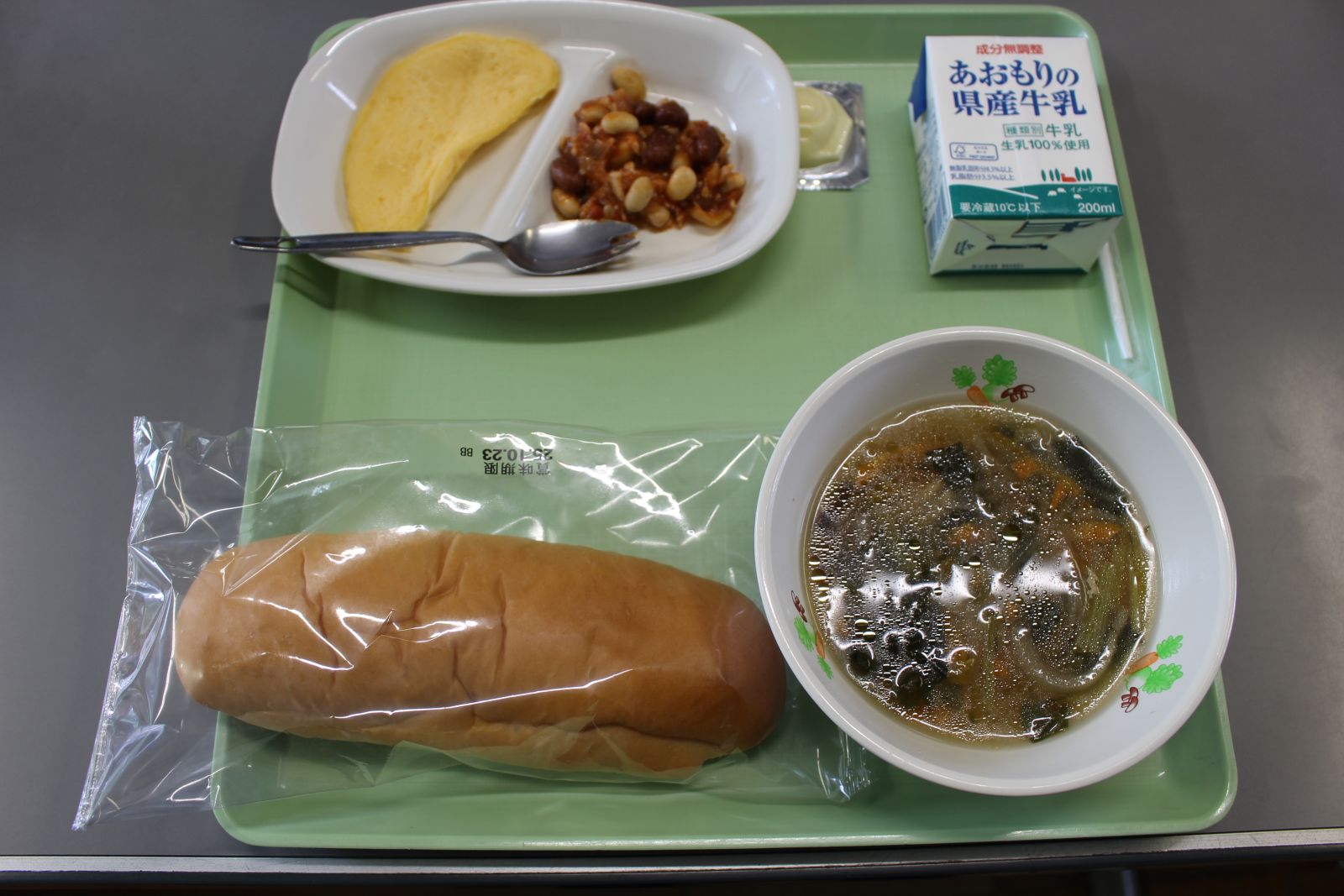 本日の献立は、コッペパン、牛乳、こまつなスープ、オムレツ、鶏肉と豆のイタリア風煮、かたぬきチーズです。 2週間に一度のパンの日です。