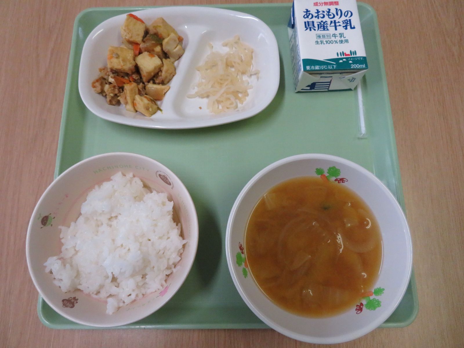 ご飯,牛乳,かぼちゃの味噌汁,生揚げのカレー炒め,たくあん漬け,リンゴ