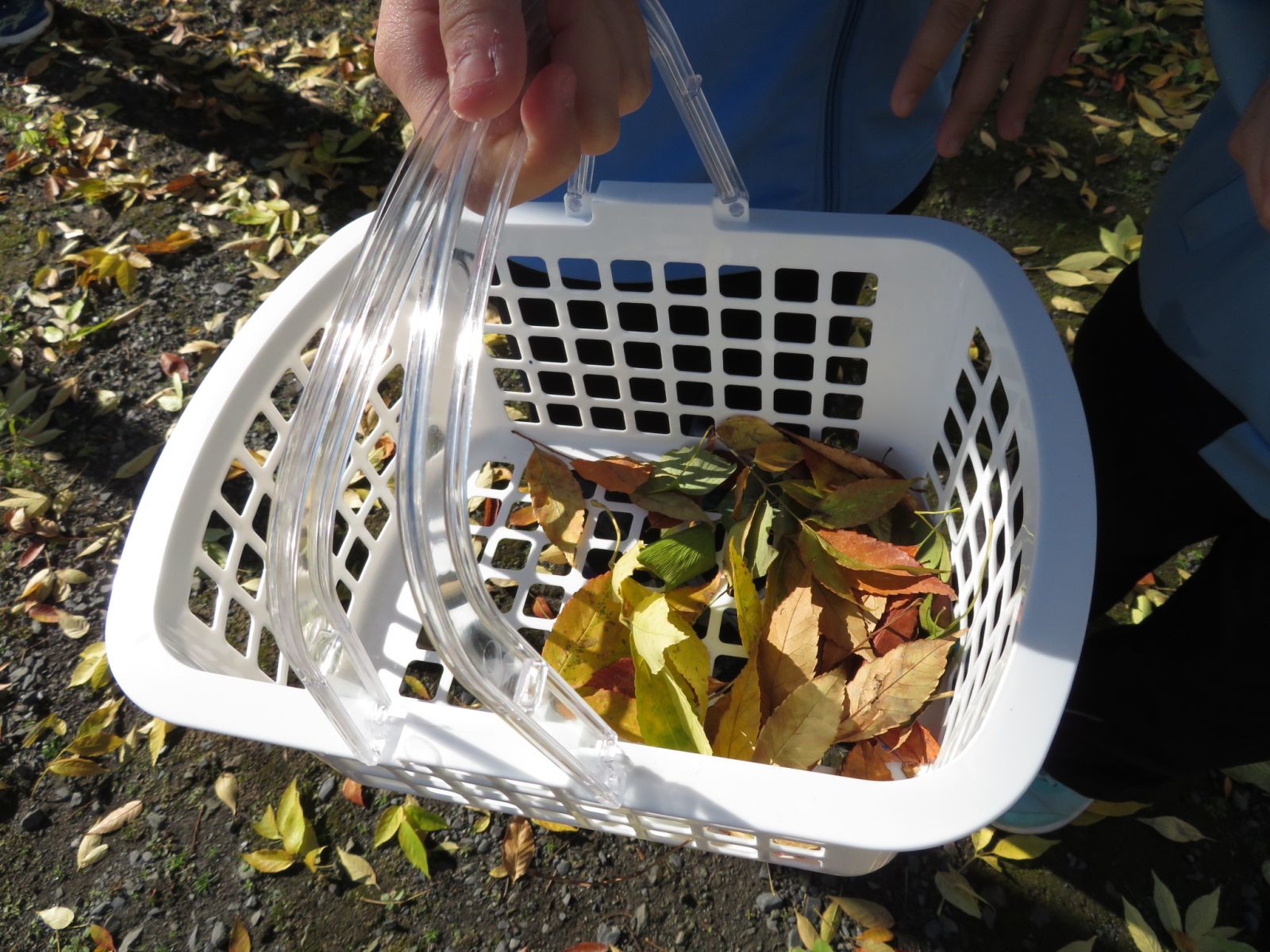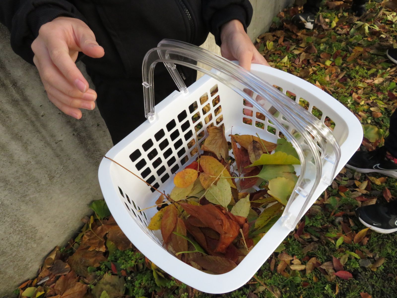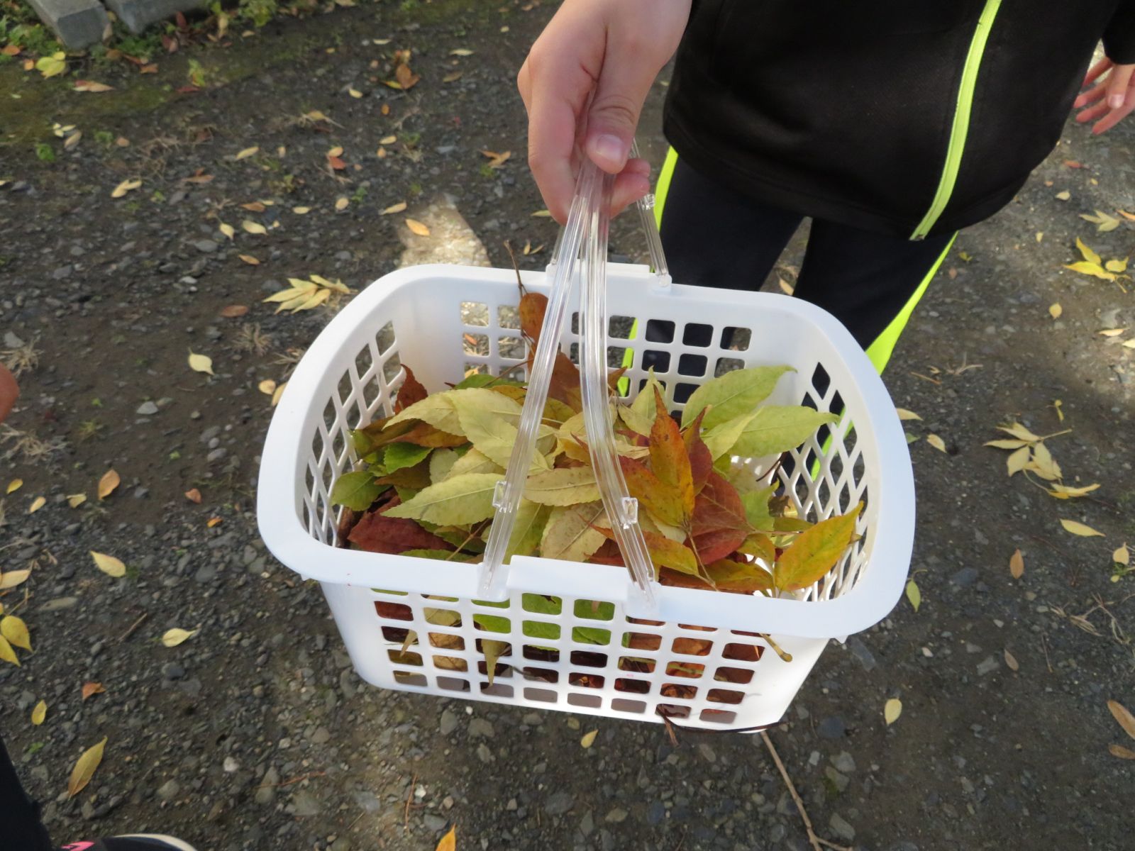 2時間目の4年生の様子です。グループごとに落ち葉を集めています。