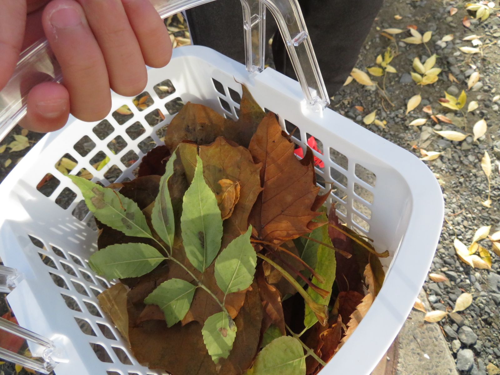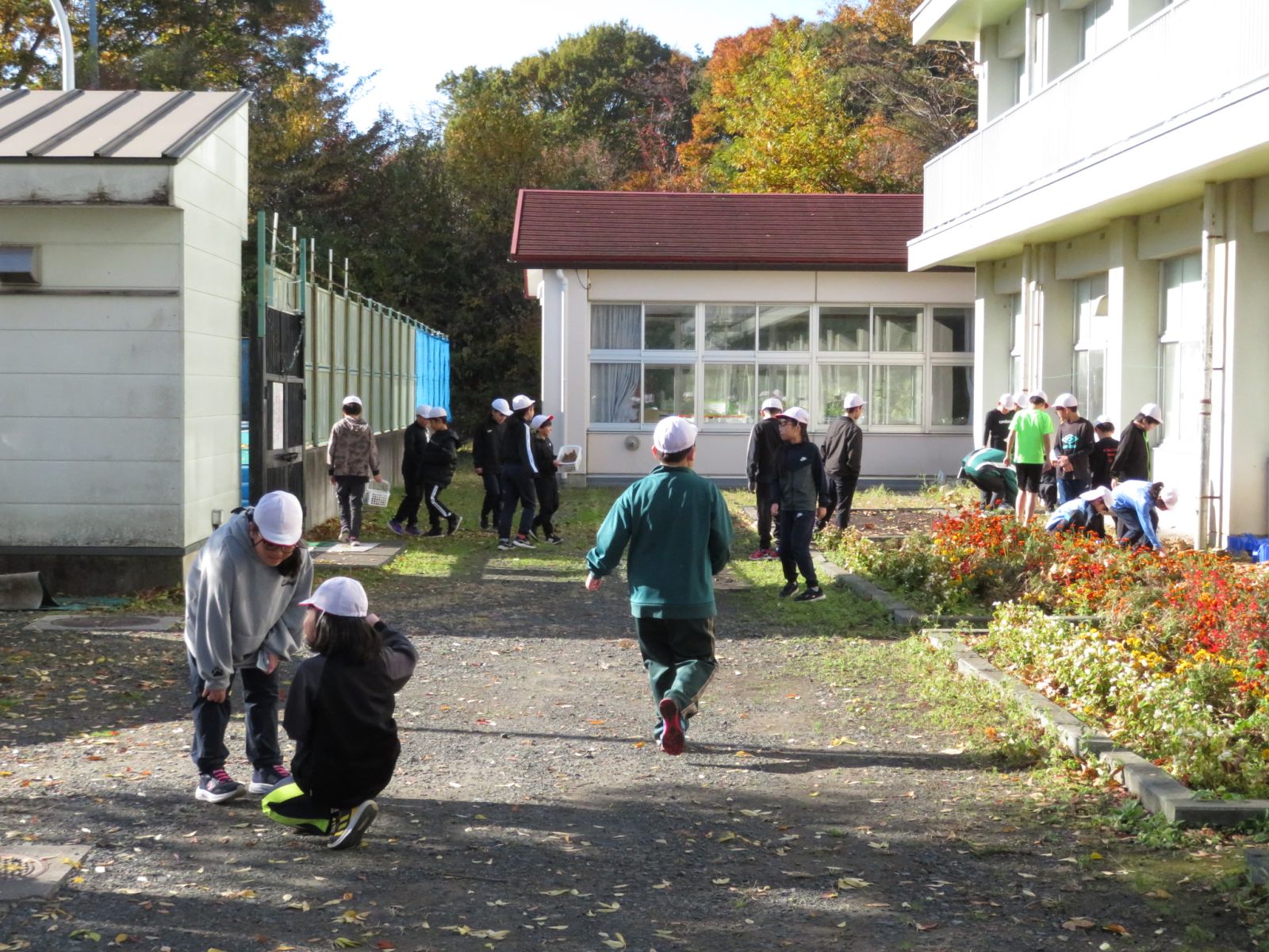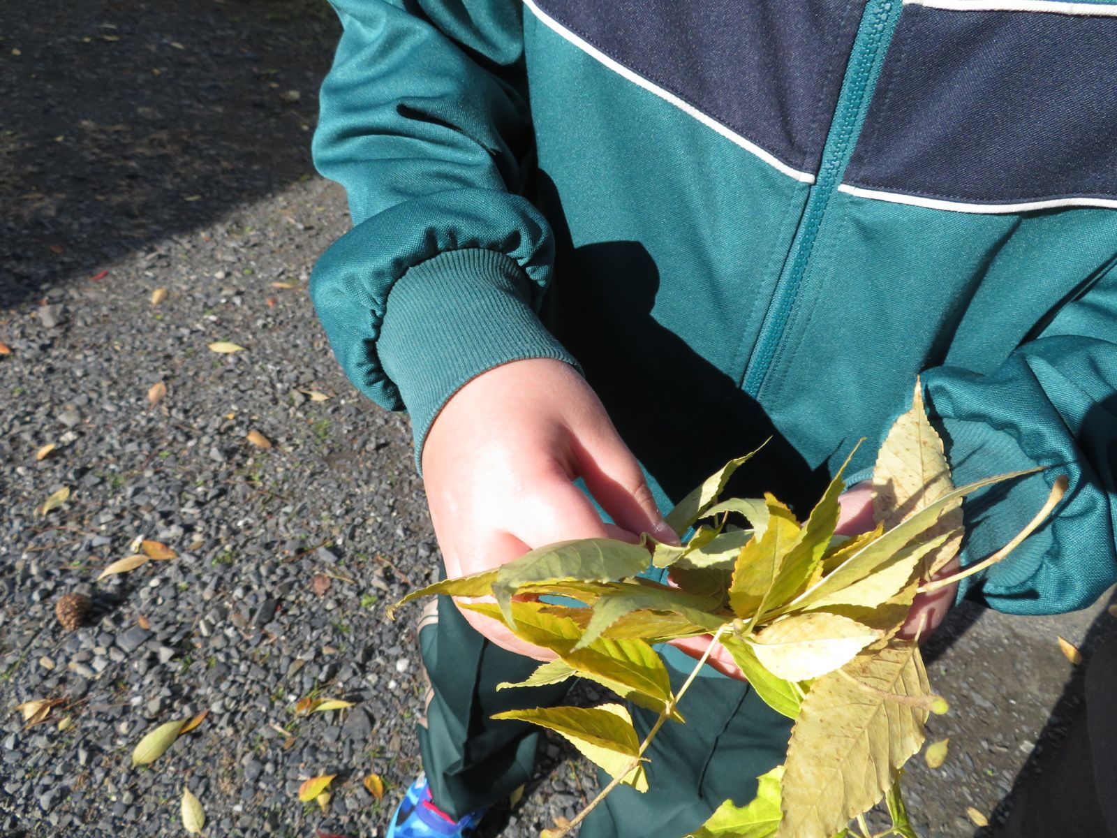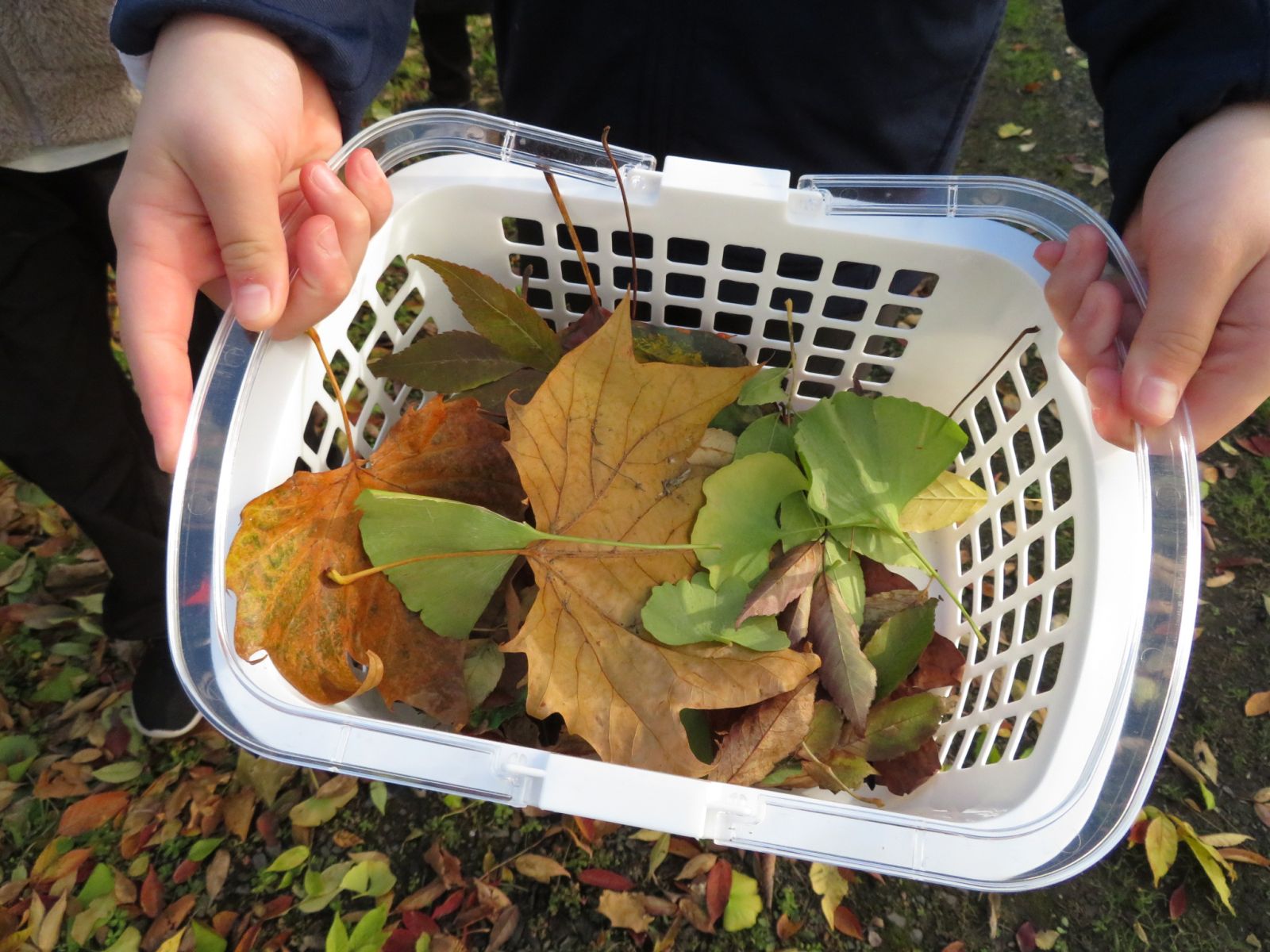 2時間目の4年生の様子です。グループごとに落ち葉を集めています。
