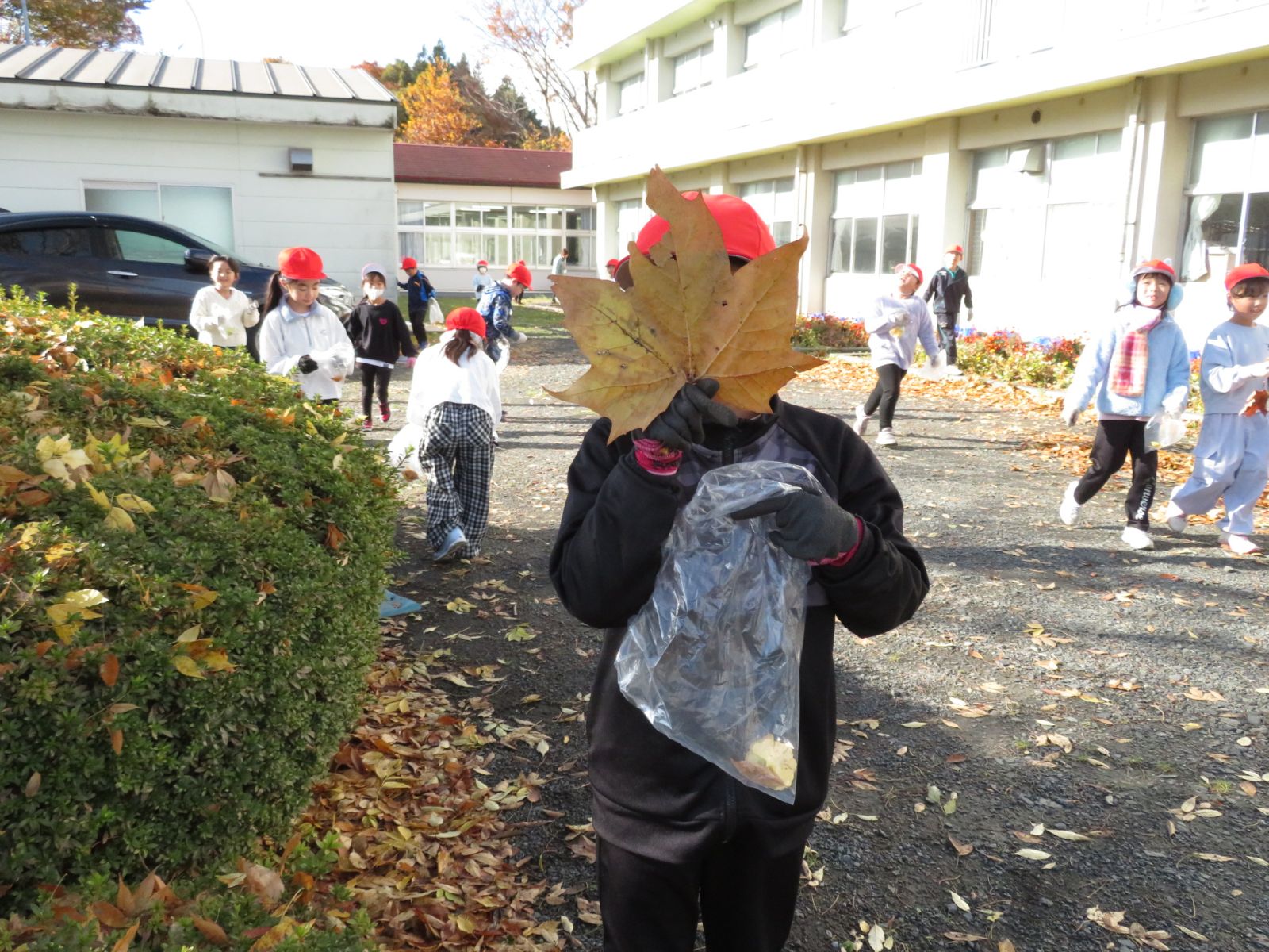 学校の近くの落ち葉も集めました。きれいな落ち葉がたくさんあります。