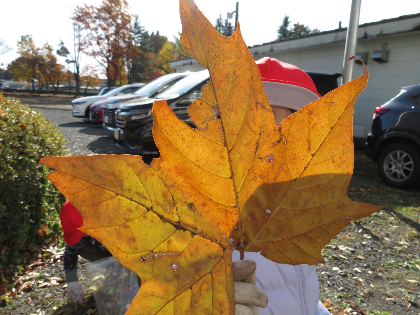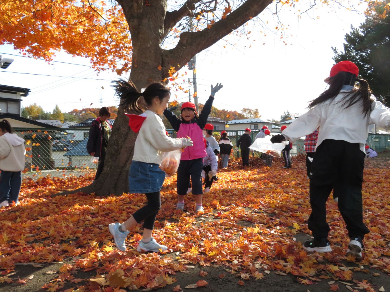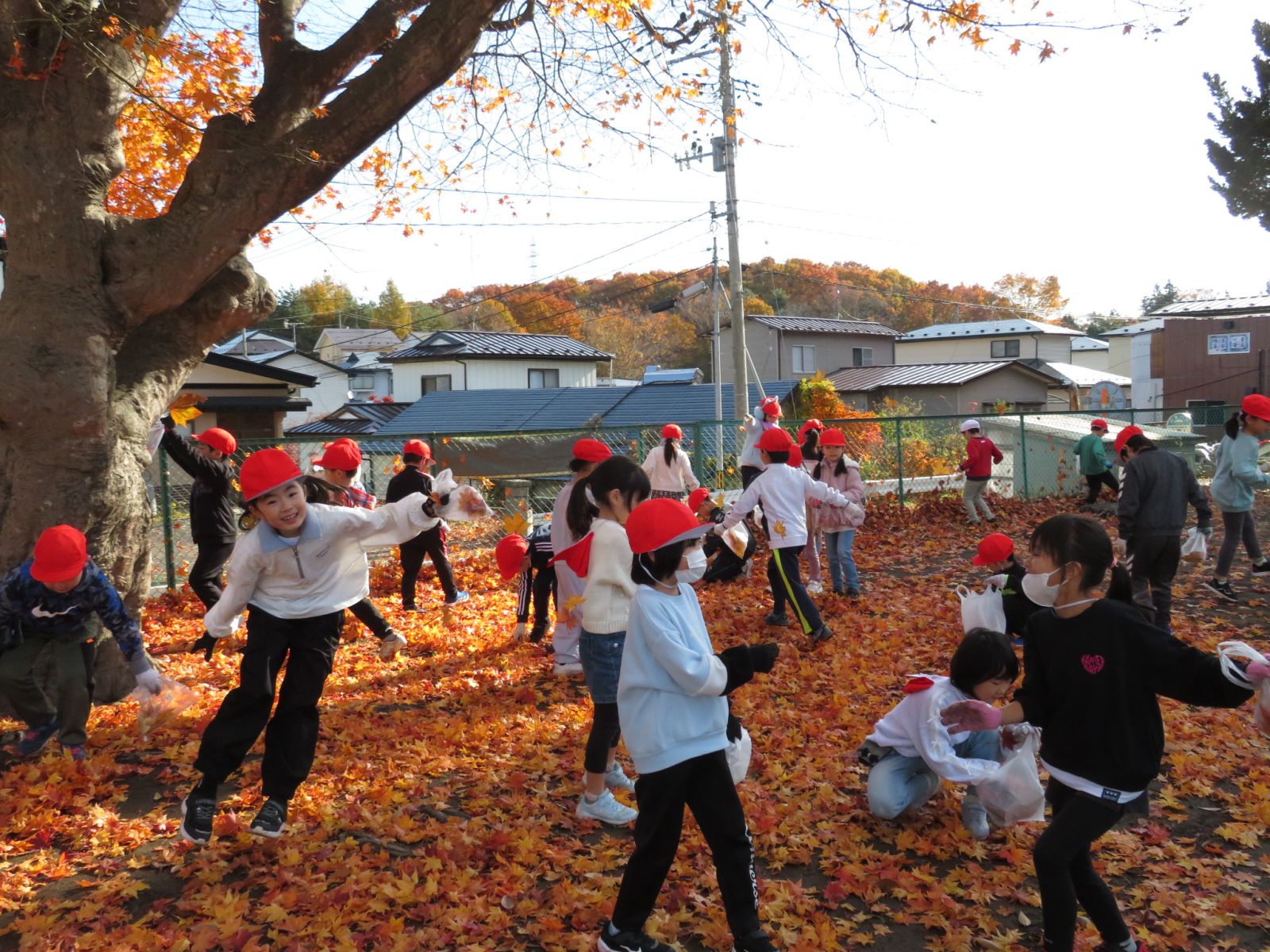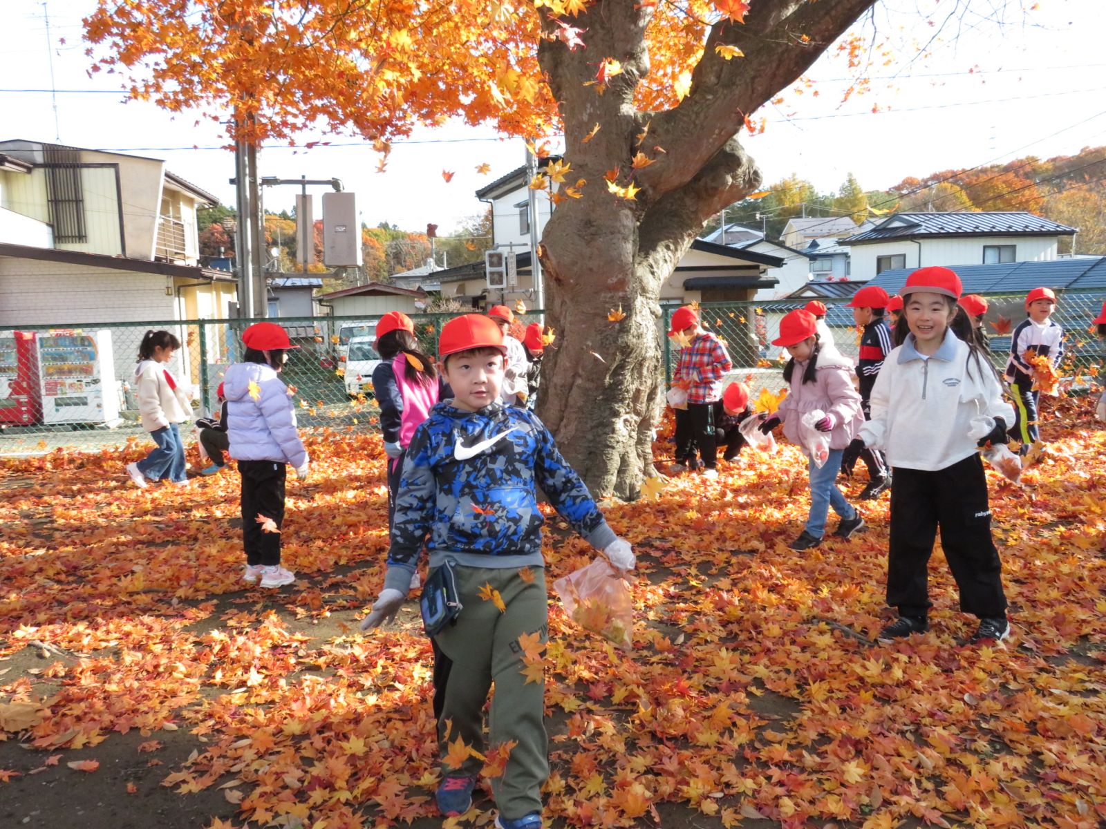 が落ちてきれいなじゅうたんのようになっています。みんなで一生けん命にそのモミジの葉を集めました。きれいな葉を見つけてはみんな大喜びです。秋がどんどん深まっています。