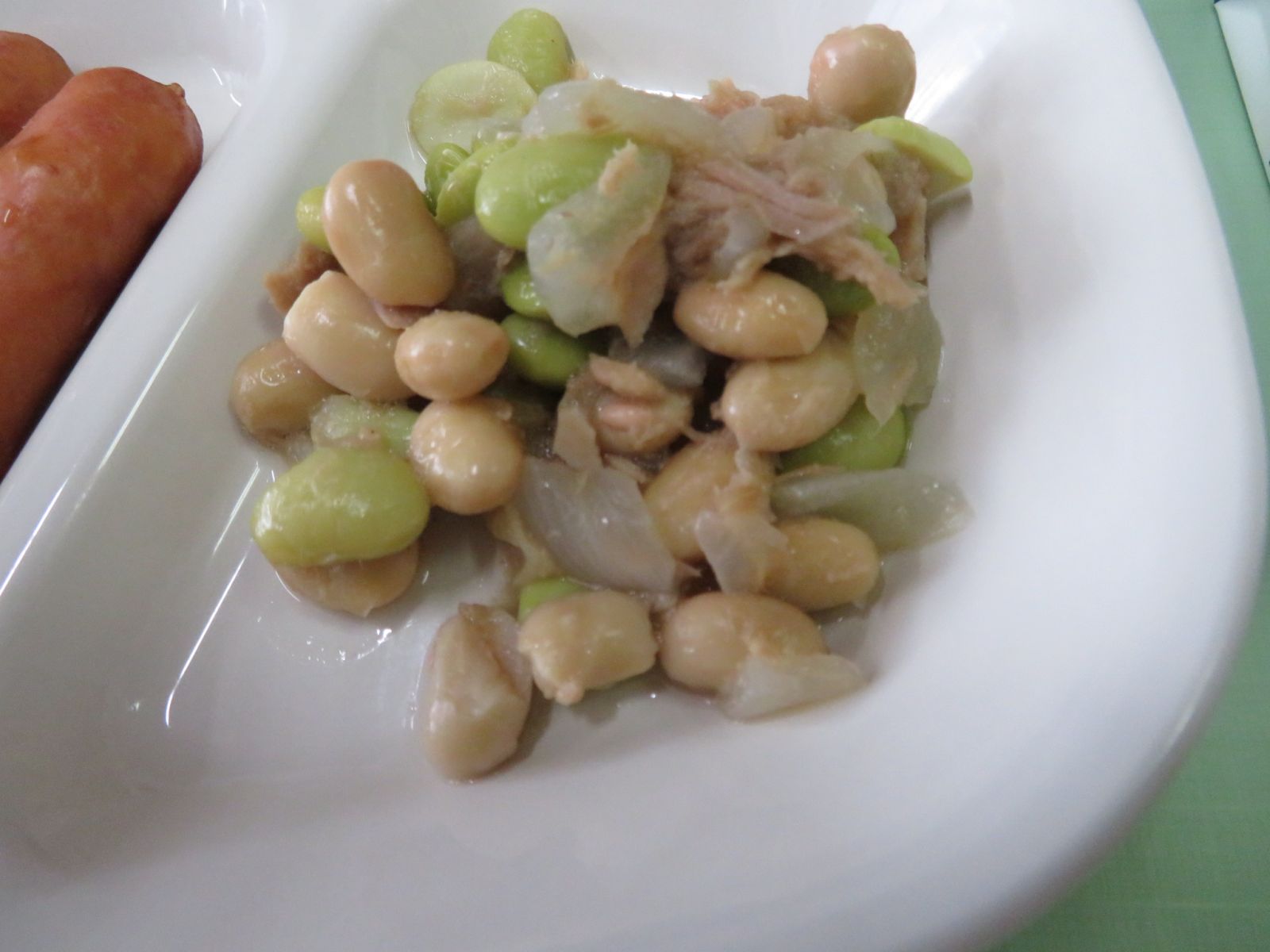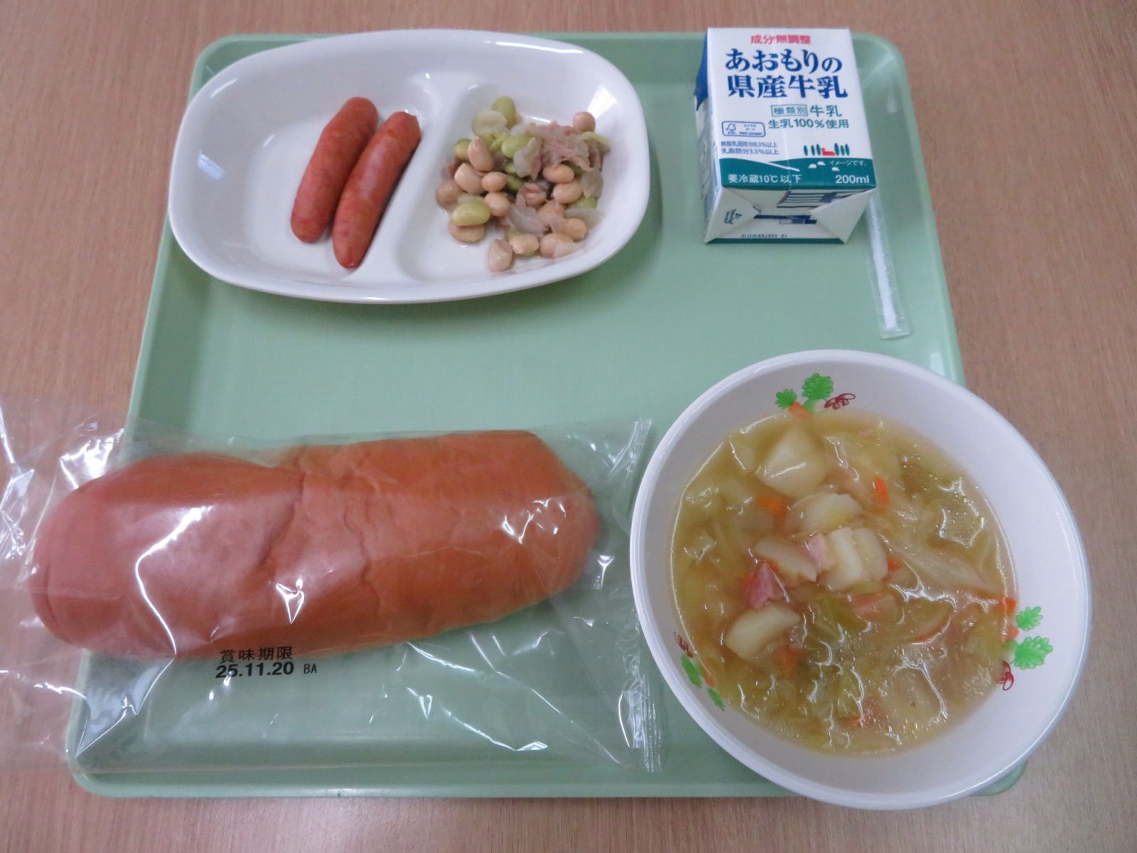 コッペパン(1・2年生は丸パン),牛乳,野菜スープ,ボイルドウインナー,ビーンズソテー