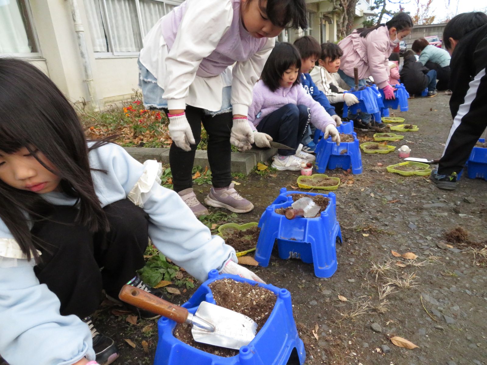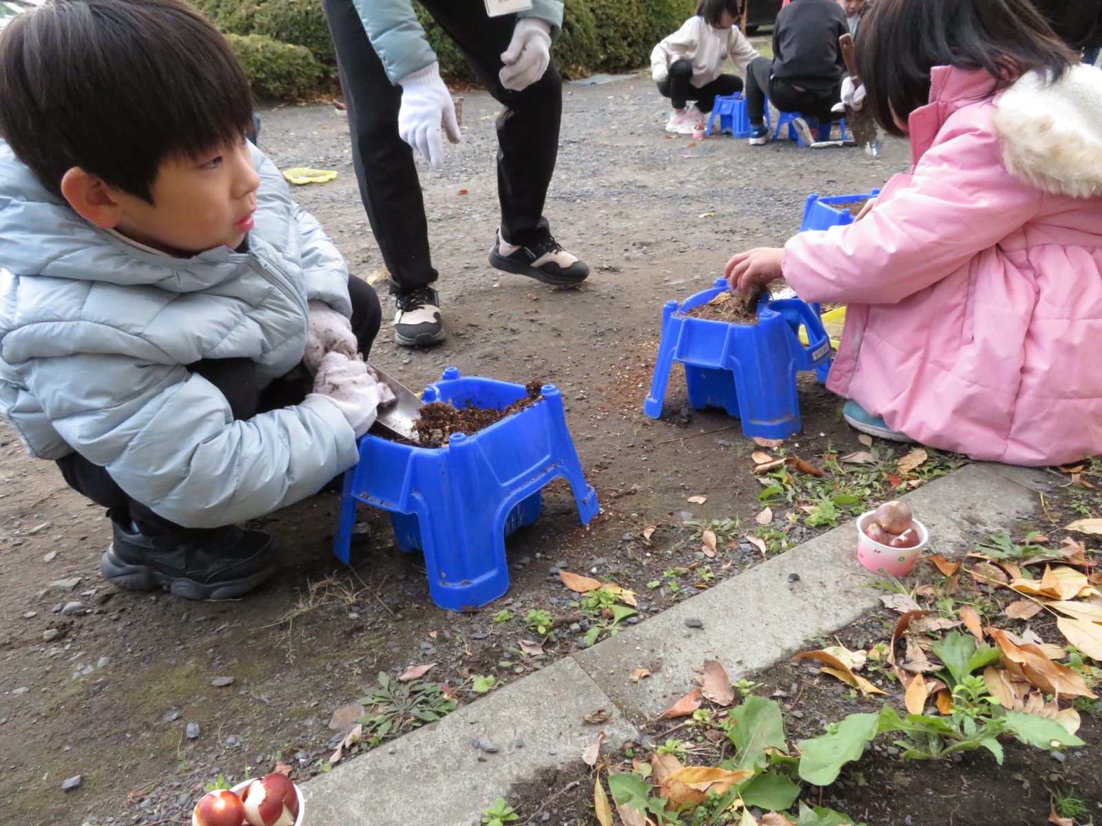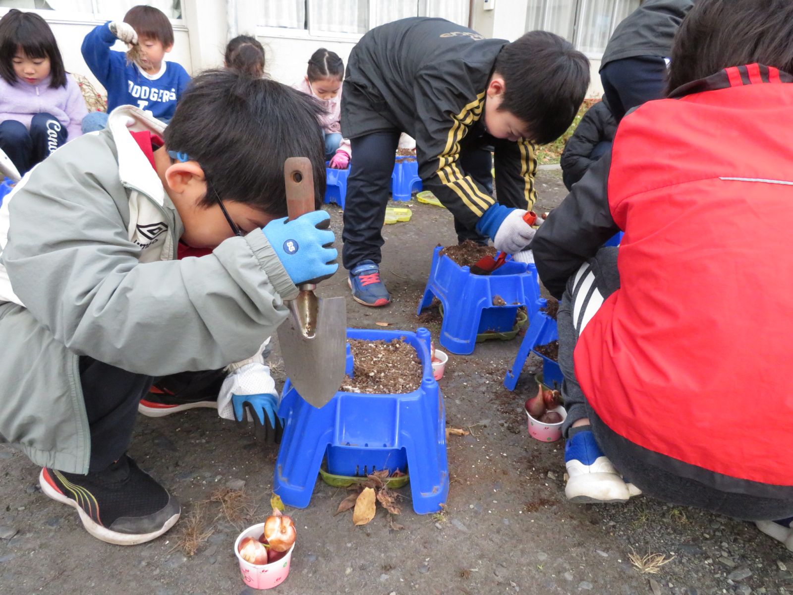 を自分の鉢へ植えています。「とんがっているほうが上だよ。」,「土をかぶせるんだよ。」などとお友だちと協力しながら植えていました。春にチューリップの花が咲くのが今からとても楽しみですね。