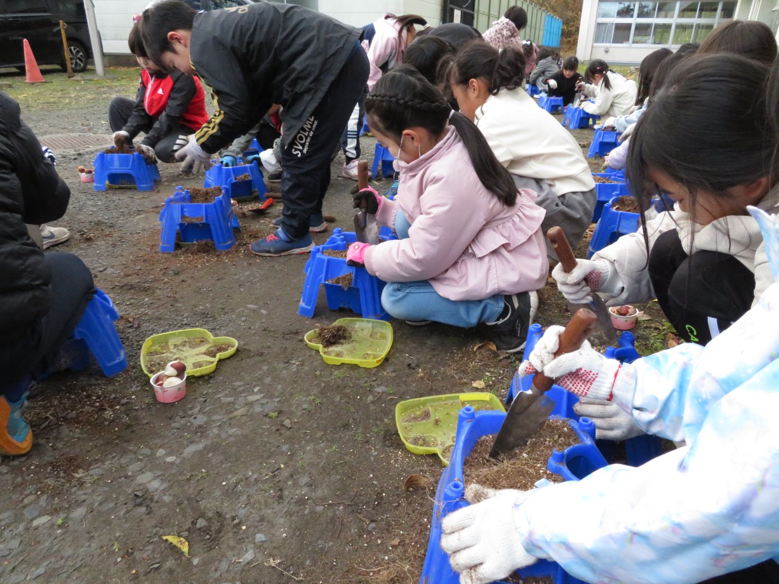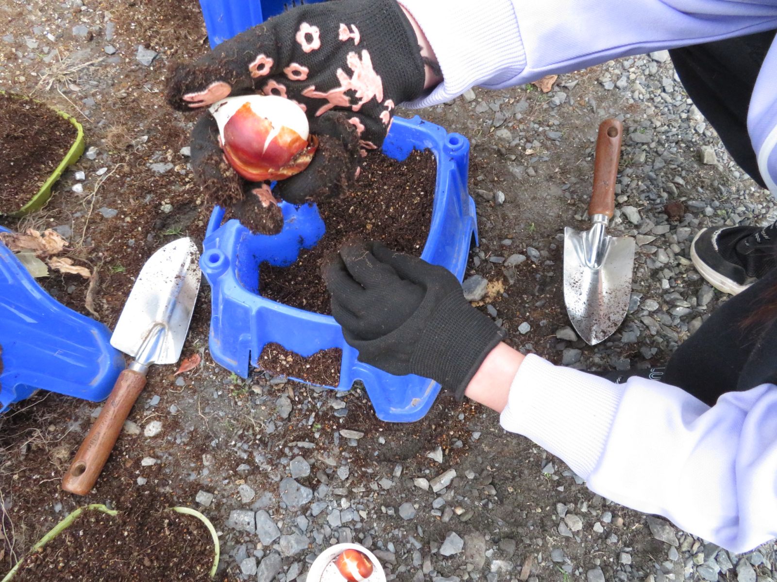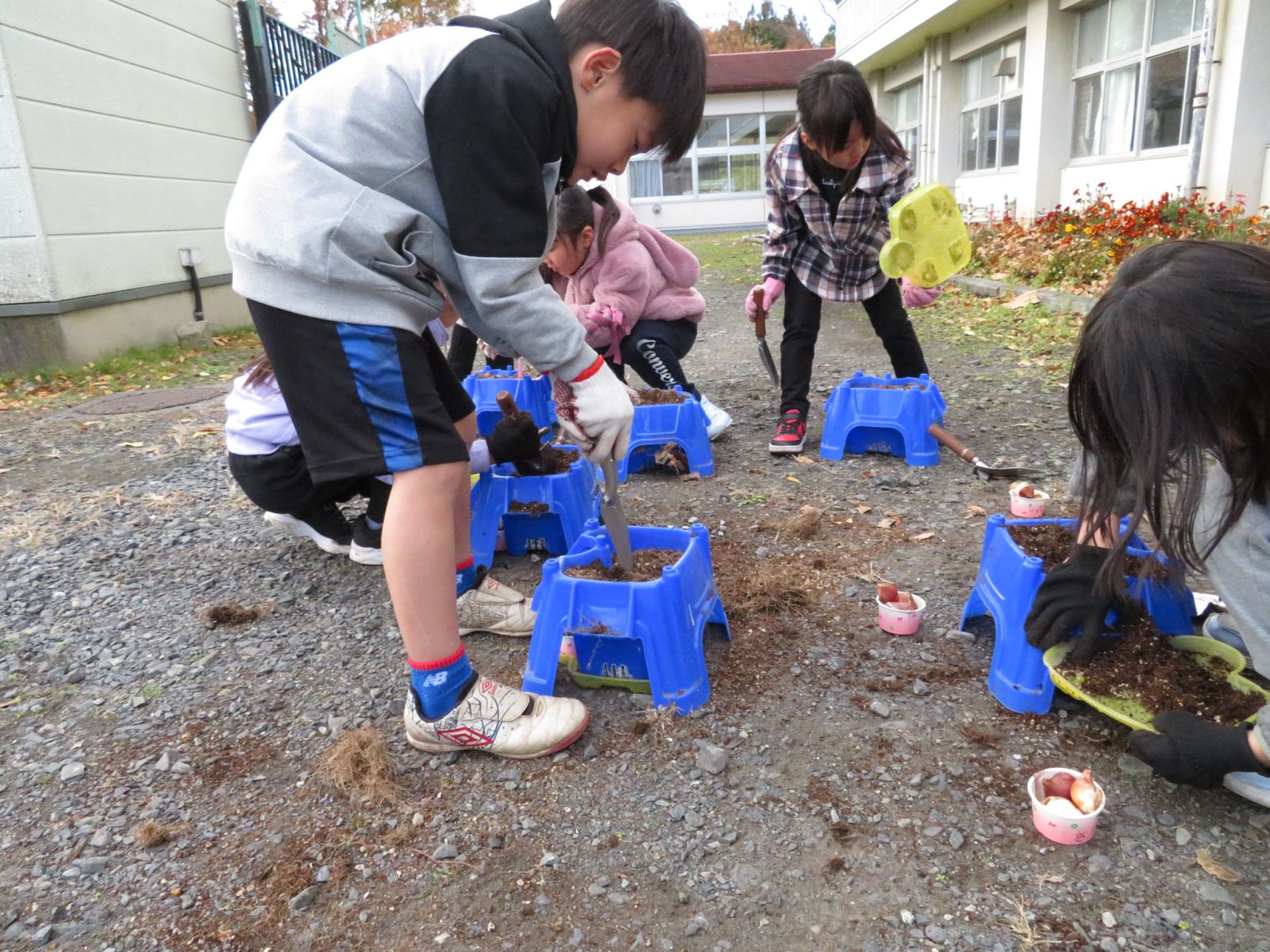 を自分の鉢へ植えています。「とんがっているほうが上だよ。」,「土をかぶせるんだよ。」などとお友だちと協力しながら植えていました。春にチューリップの花が咲くのが今からとても楽しみですね。
