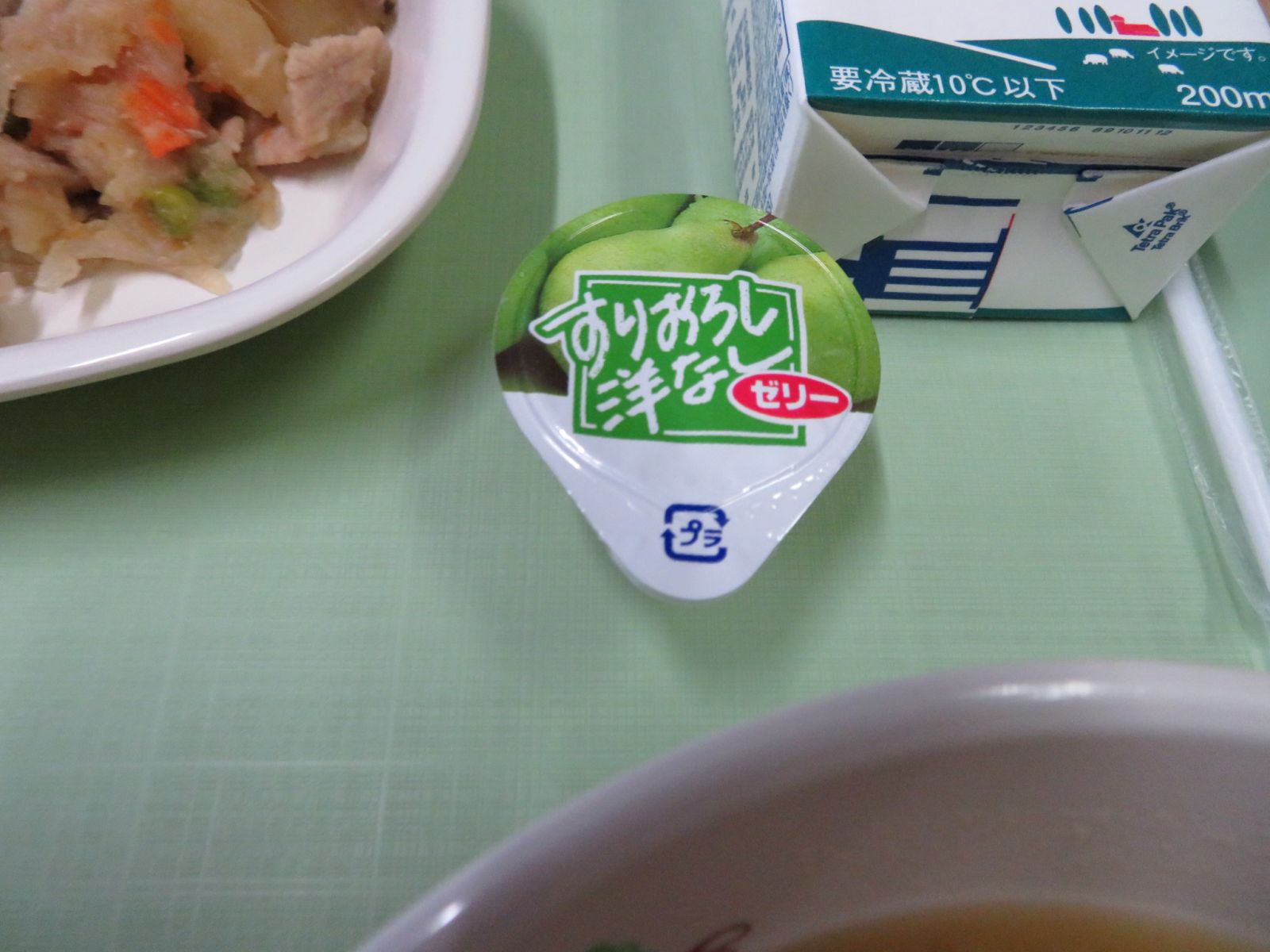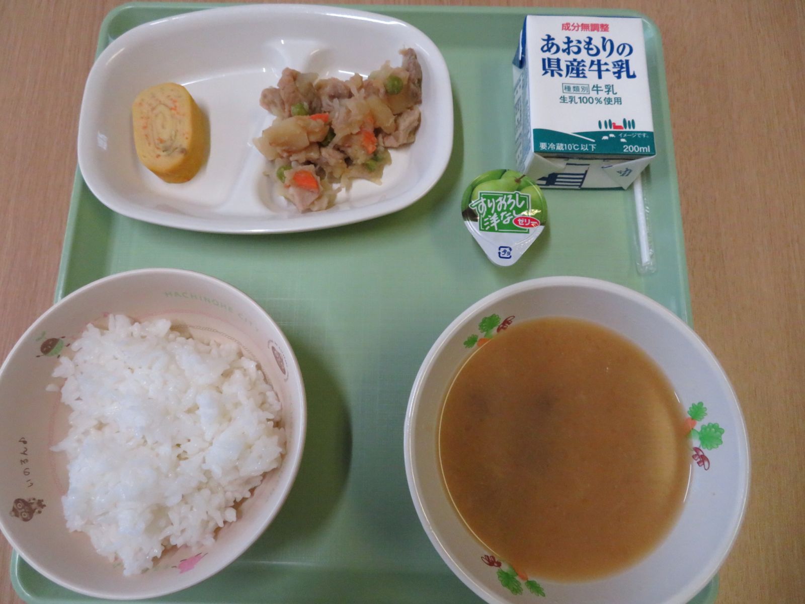 ご飯,牛乳,なめこと豆腐の味噌汁,肉じゃが,磯華たまご巻き,ミニ洋梨ゼリー