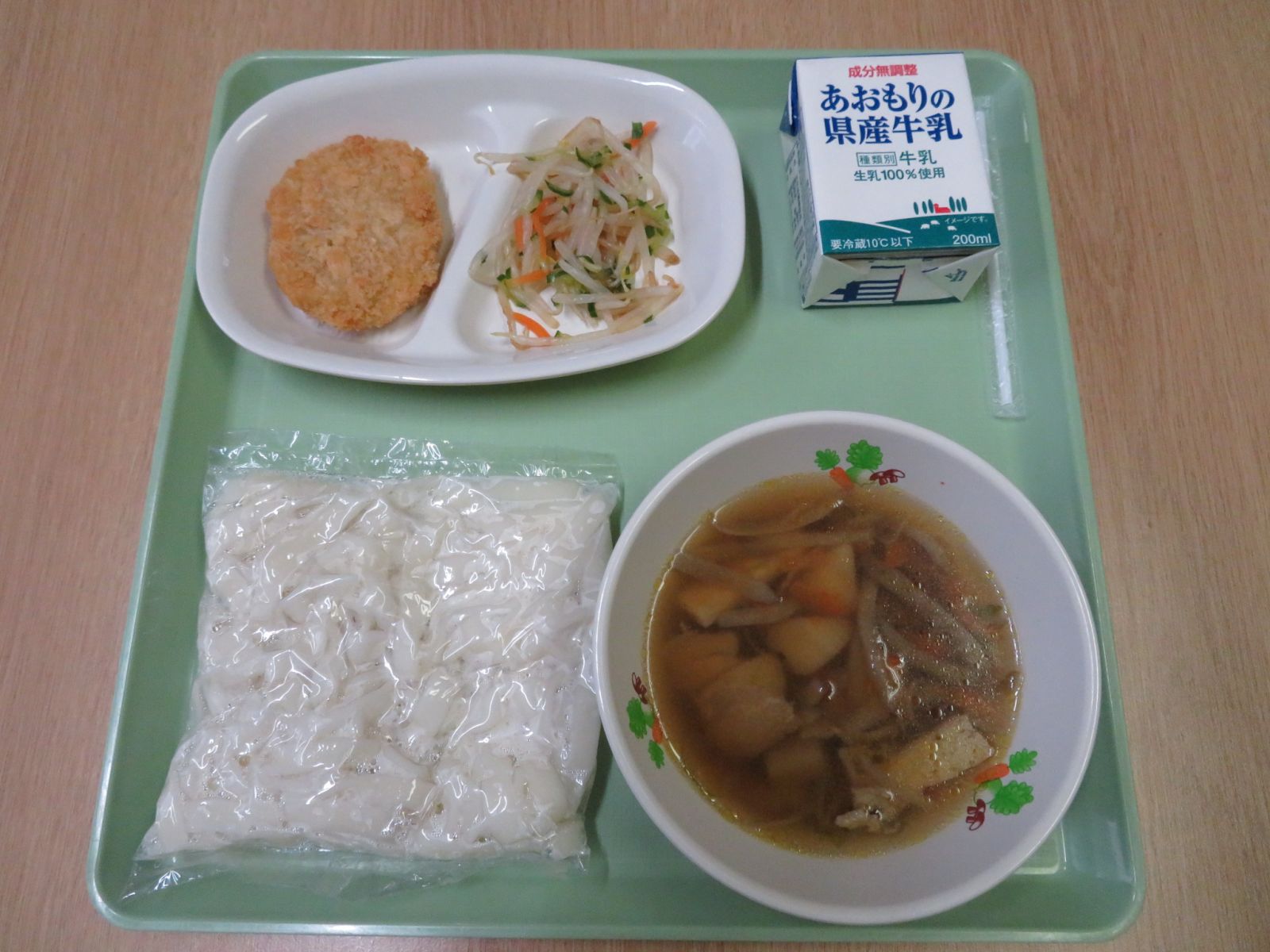 けんちんきし麺,牛乳,かぼちゃコロッケ,キュウリともやしのサラダ(バンバンジードレッシング)
