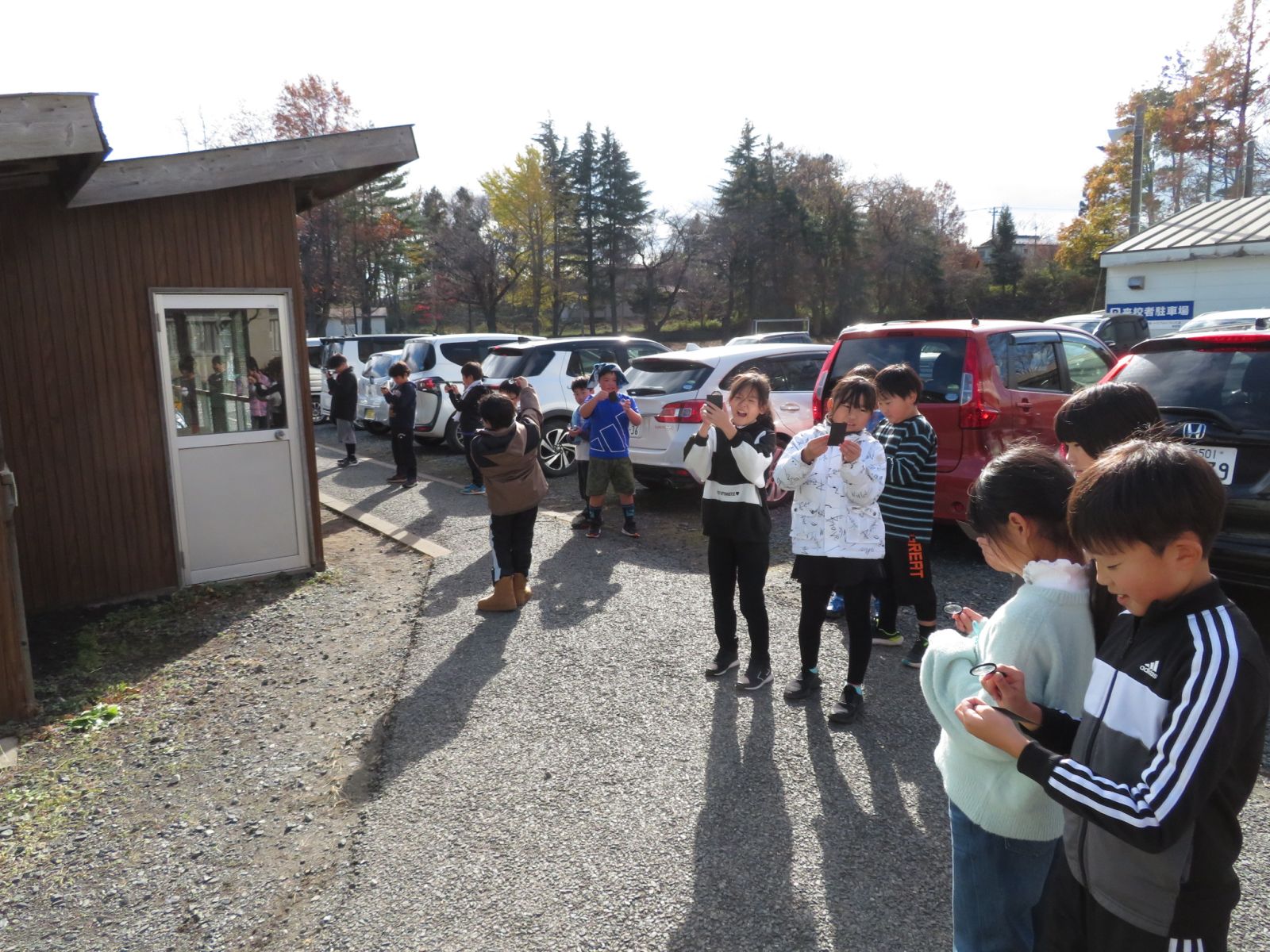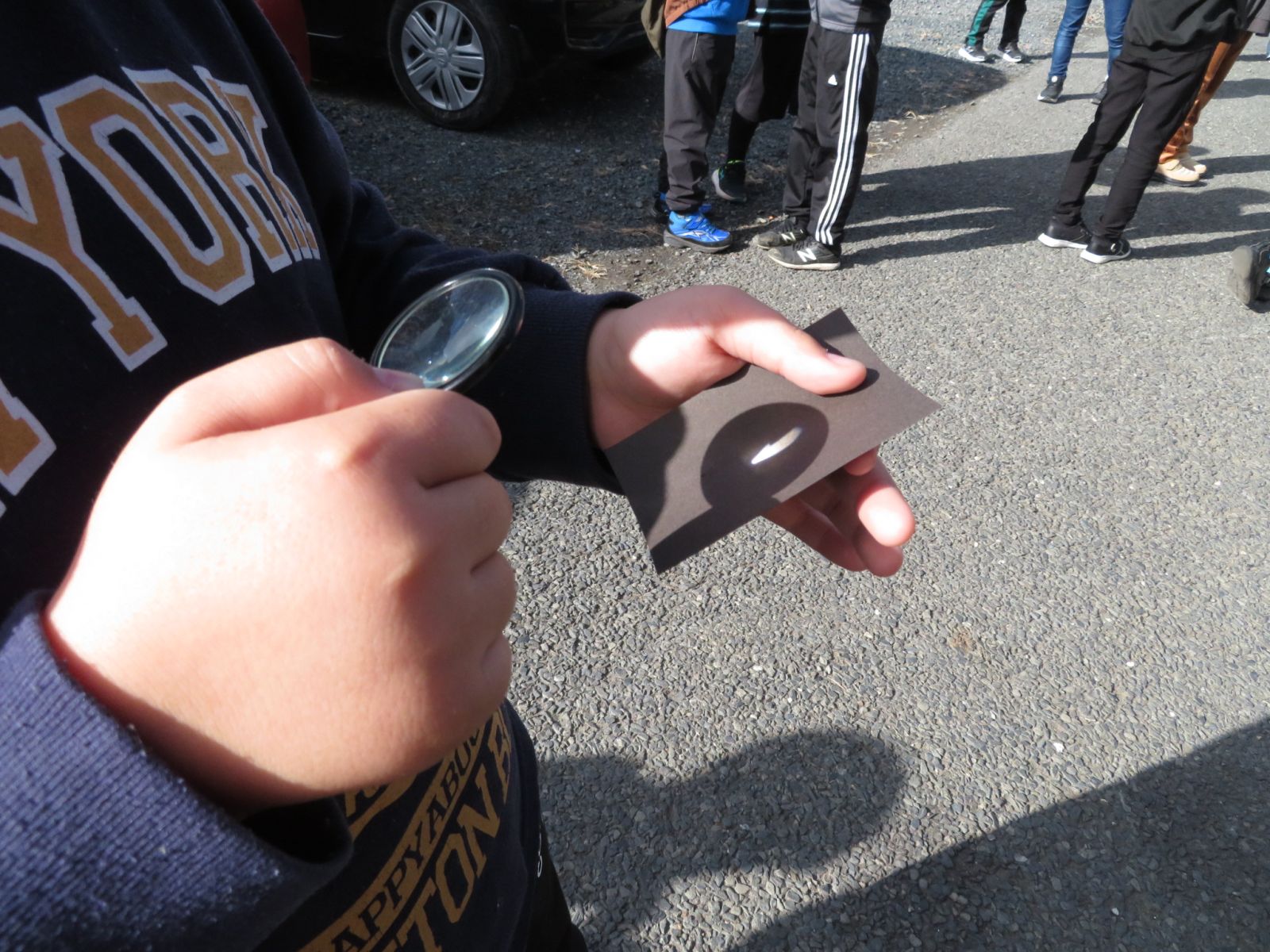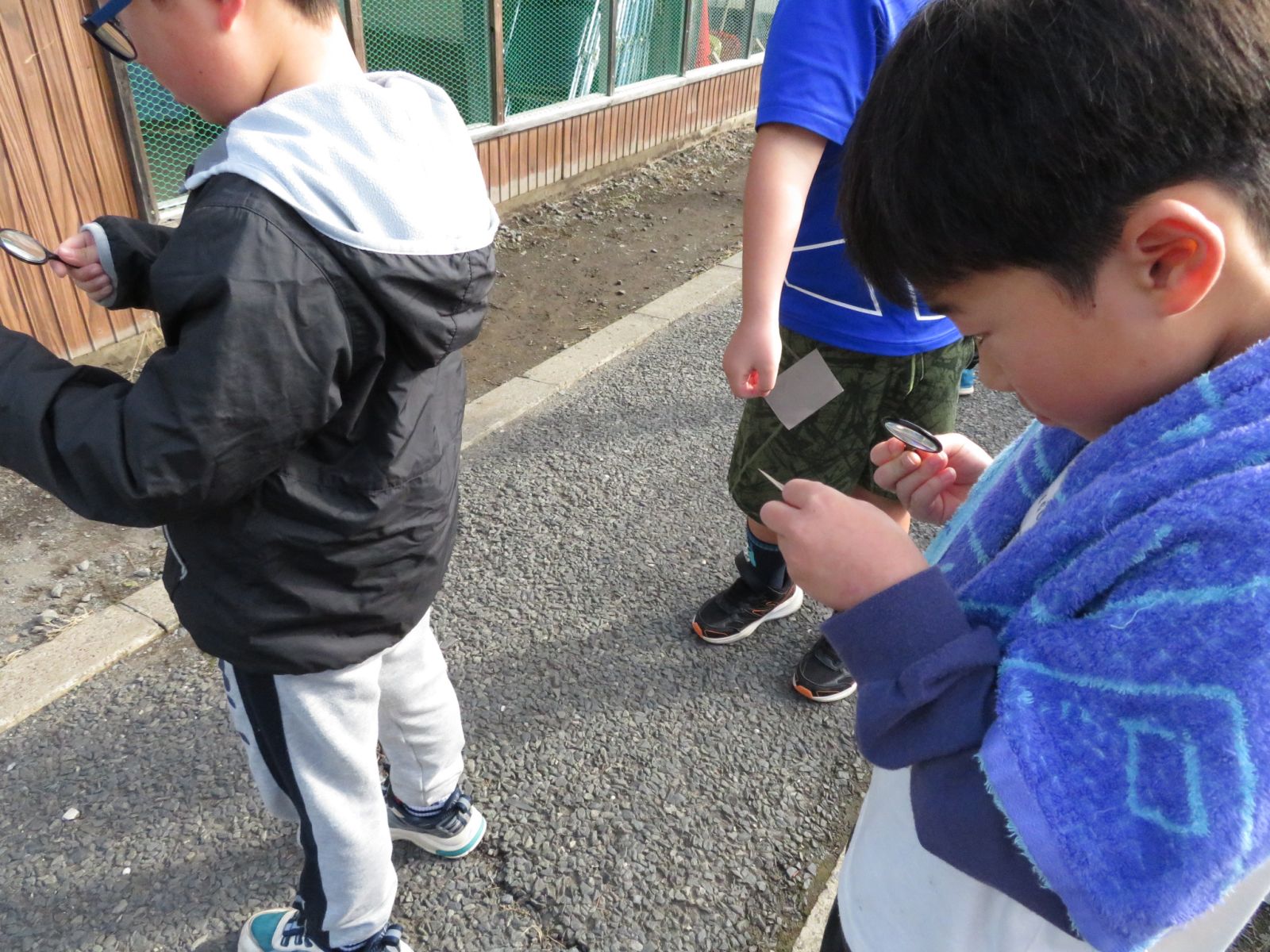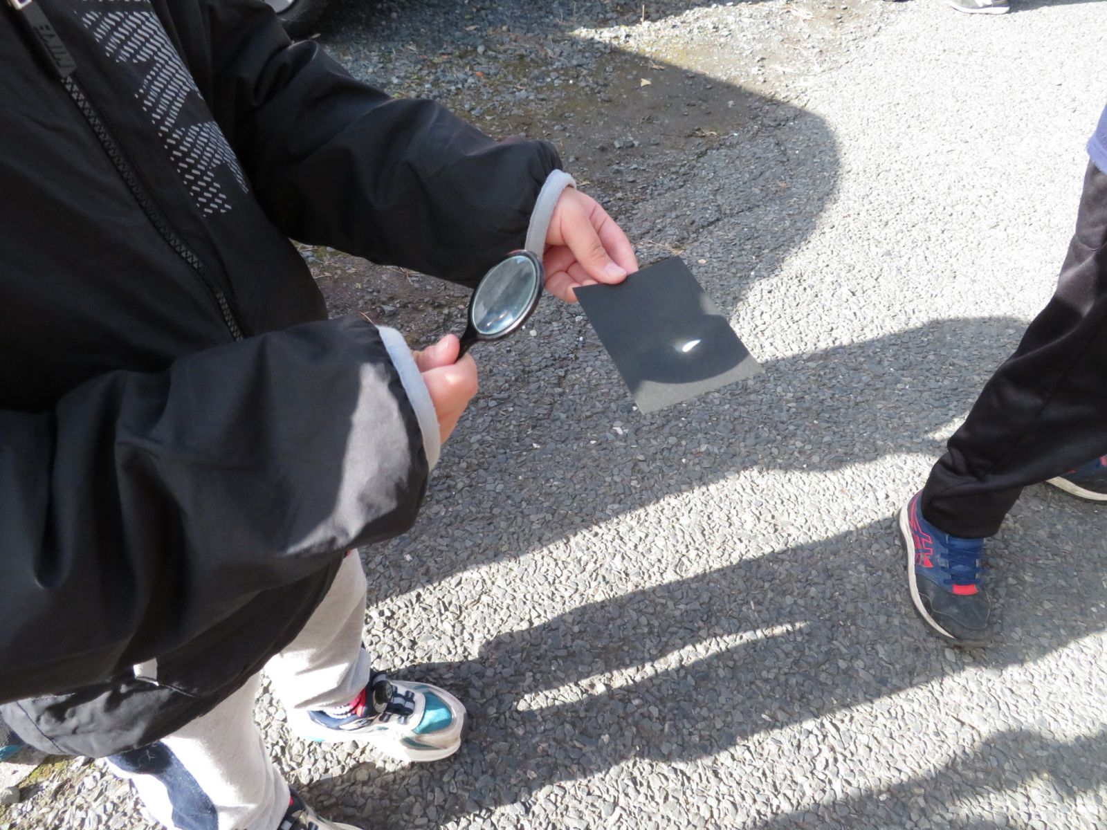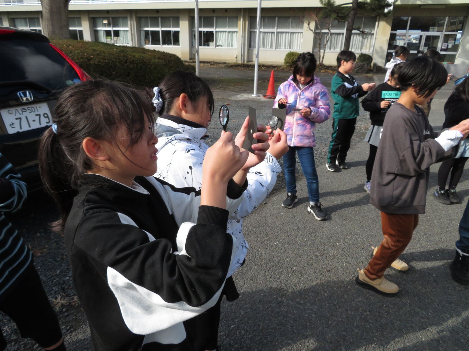 で日光を一か所に集めています。今日は太陽が雲にかくれたり出てきたりしていましたが,太陽が出てくるとすばやく実験に取りかかっていました。スケートのつかれも感じさせず元気に活動している3年生です。