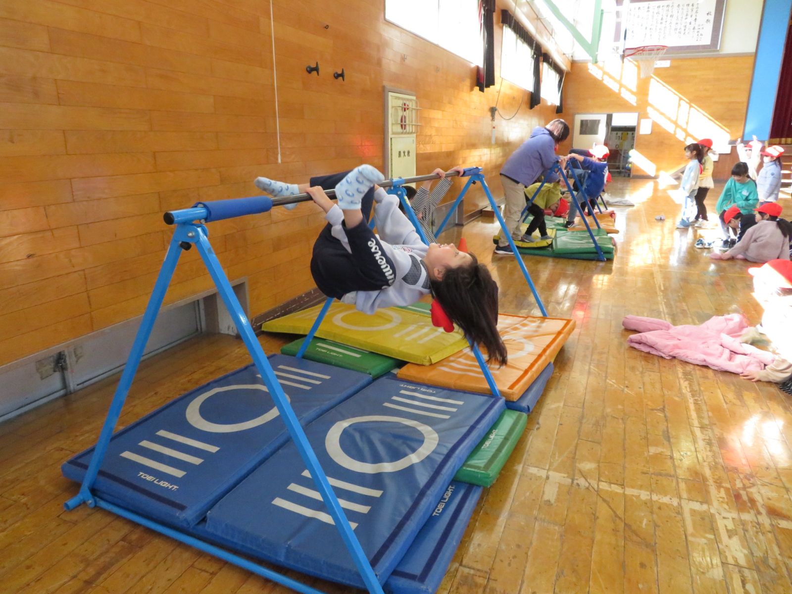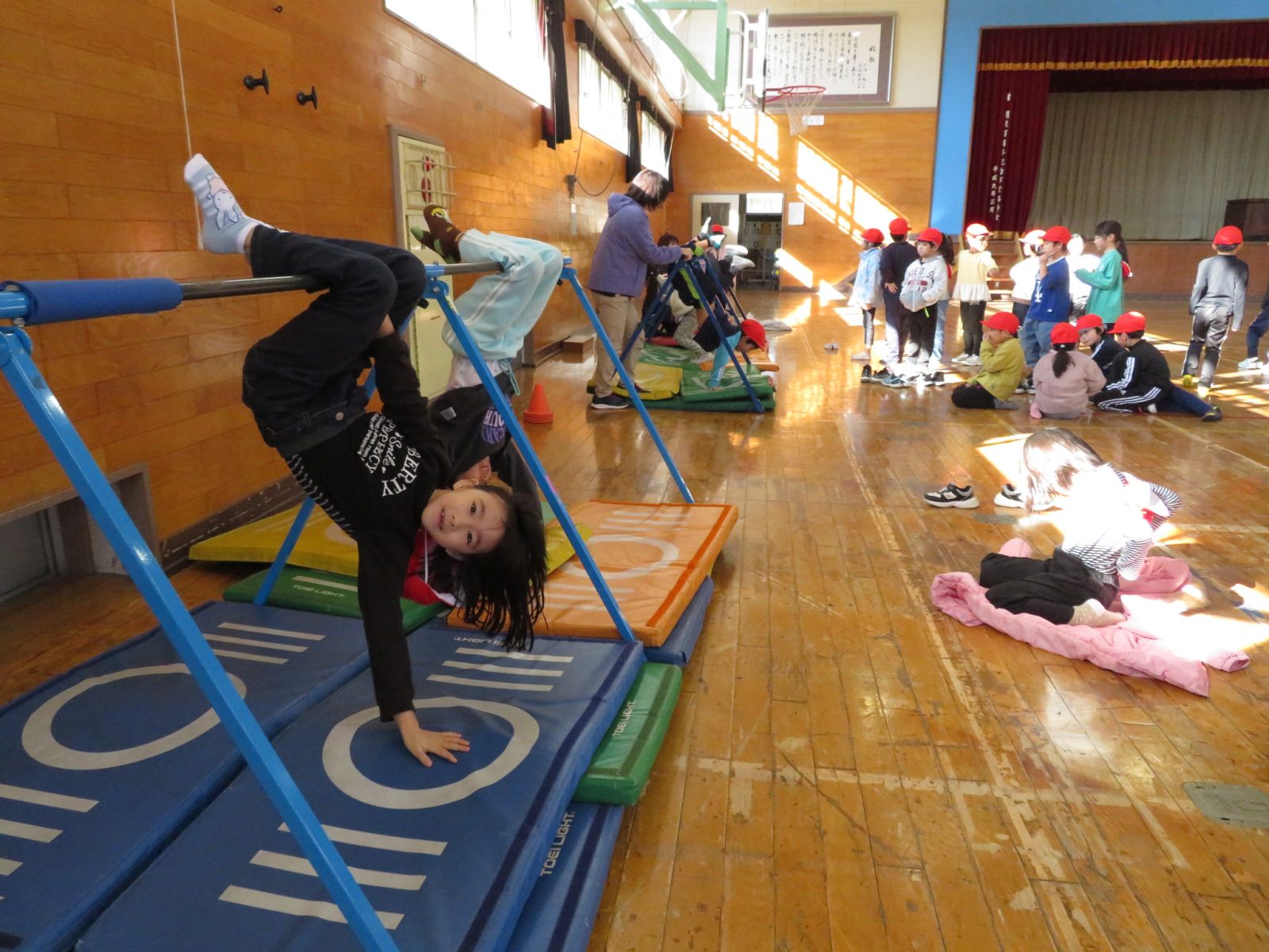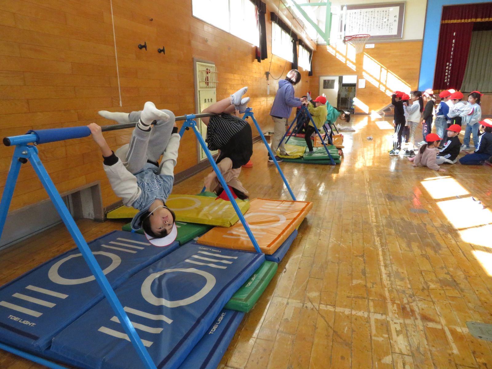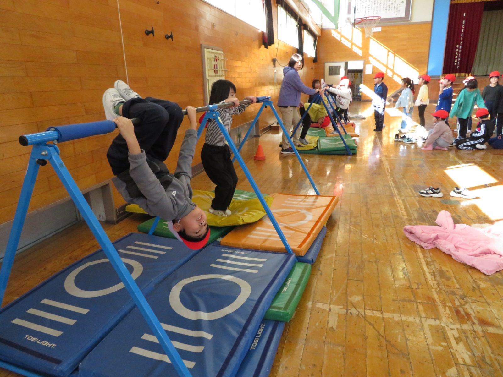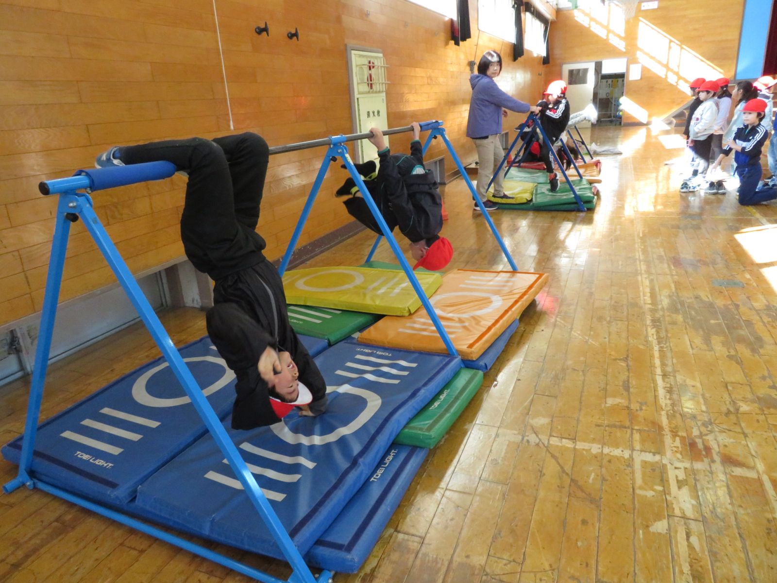などいろいろな技に挑戦しています。さかさまになって自由自在に体を動かしている子も見られます。どんどん上達していますよ。みんながんばってね!