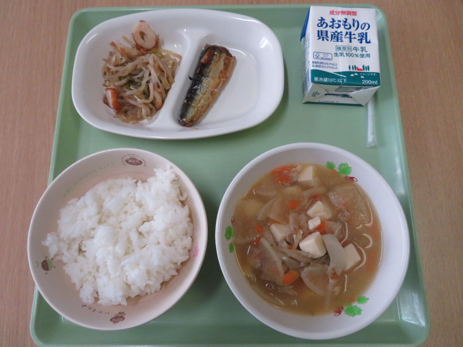 ご飯,牛乳,のっぺい汁,イワシごま味噌煮,もやしとちくわの炒め物