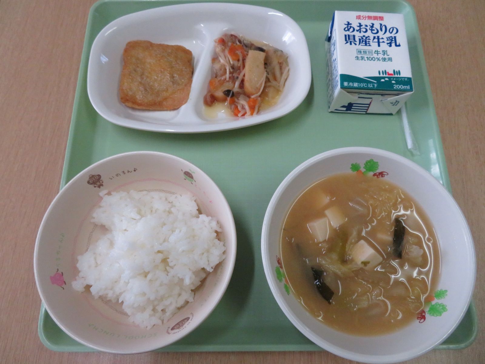 ご飯,牛乳,白菜と豆腐の味噌汁,ごぼう入り信田煮,きのこのおかか煮
