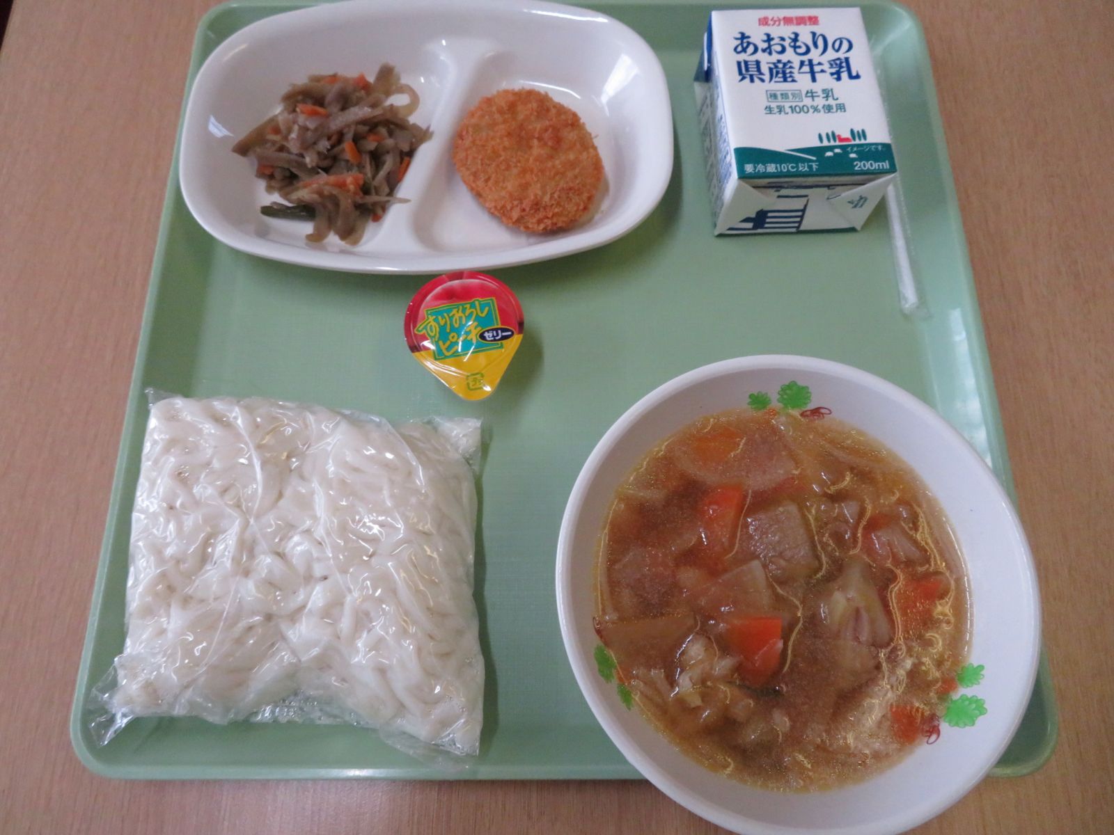 ちゃんこうどん,牛乳,野菜メンチカツ,五目きんぴら,ミニピーチゼリー