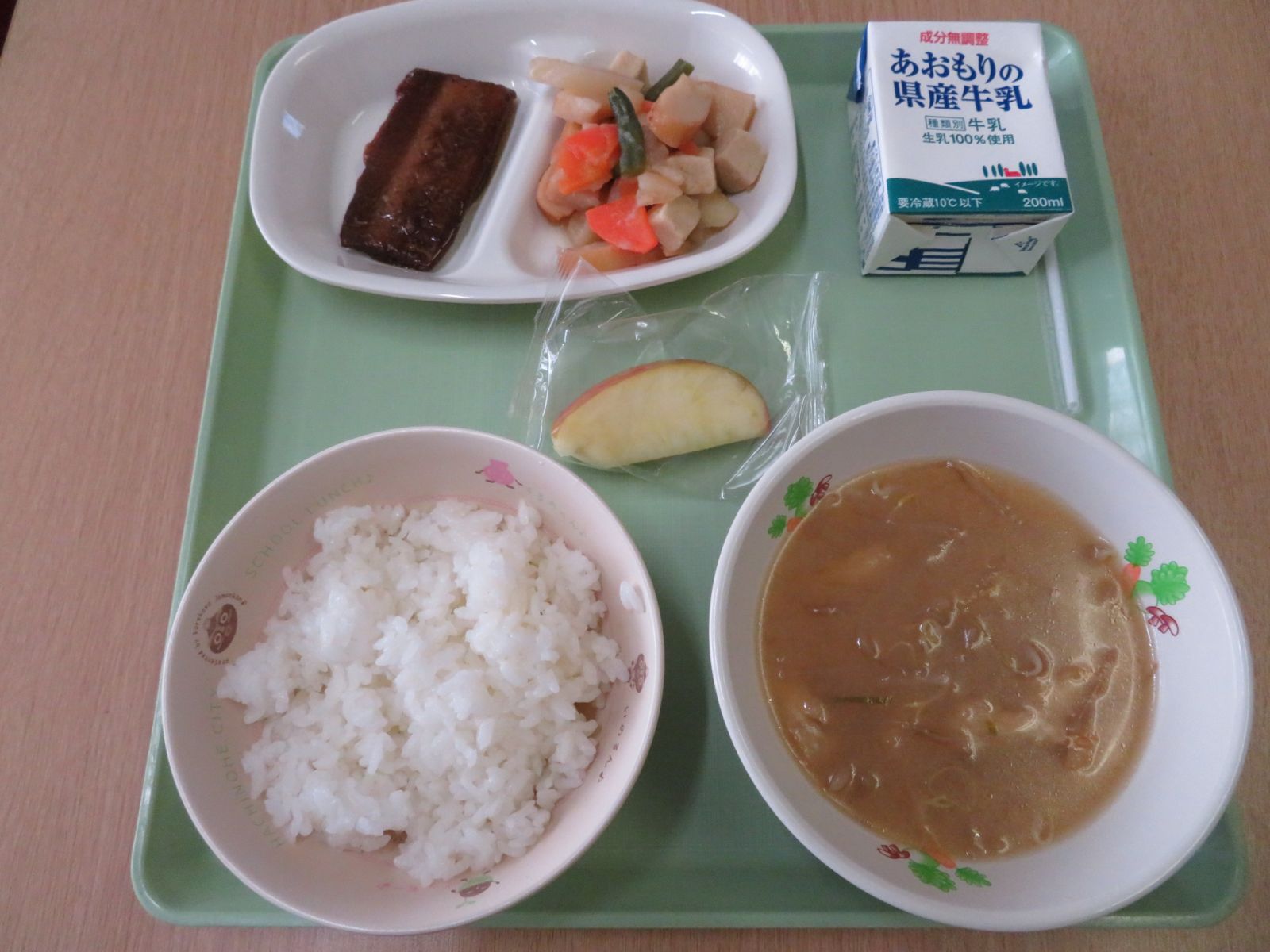 ご飯,牛乳,もやしと油揚げの味噌汁,野菜のうま煮,ニシン照り焼き,リンゴ