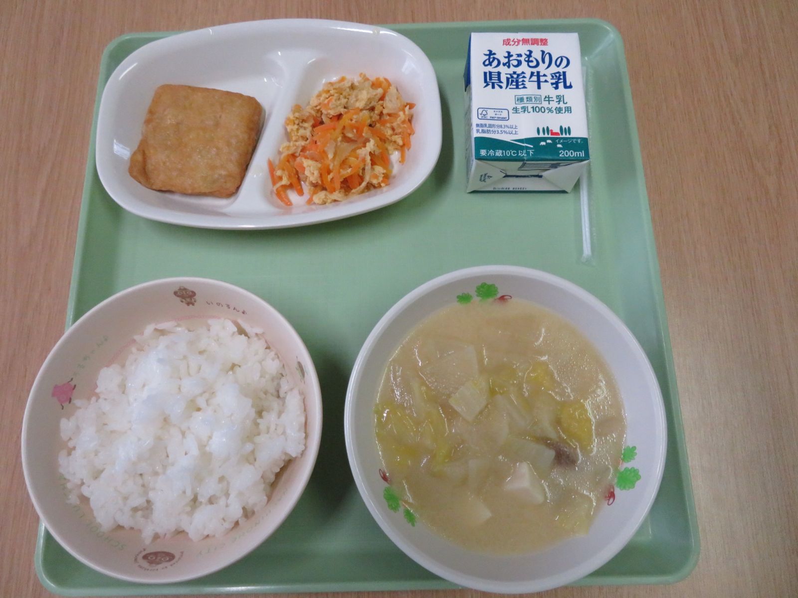 今日の給食は,ご飯,牛乳,初雪汁,根菜入り信田煮,にんじんしりしり(沖縄県の郷土料理)でした。初雪汁には,エノキタケや白菜,大根が入っていて豆乳で初雪のように真っ白なメニューでした。とてもおいしくて体があたたまりました。
