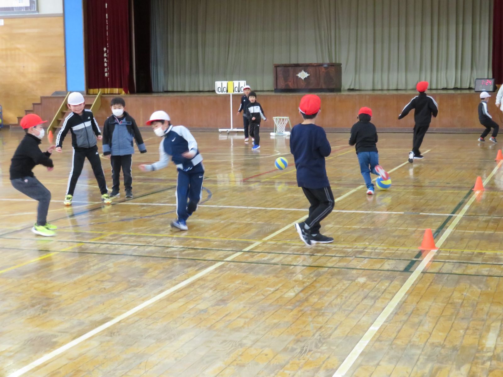 をがんばっています。サッカーは的にボールが当たったら点数になるルールです。楽しみながら体をいっぱい動かしていました。