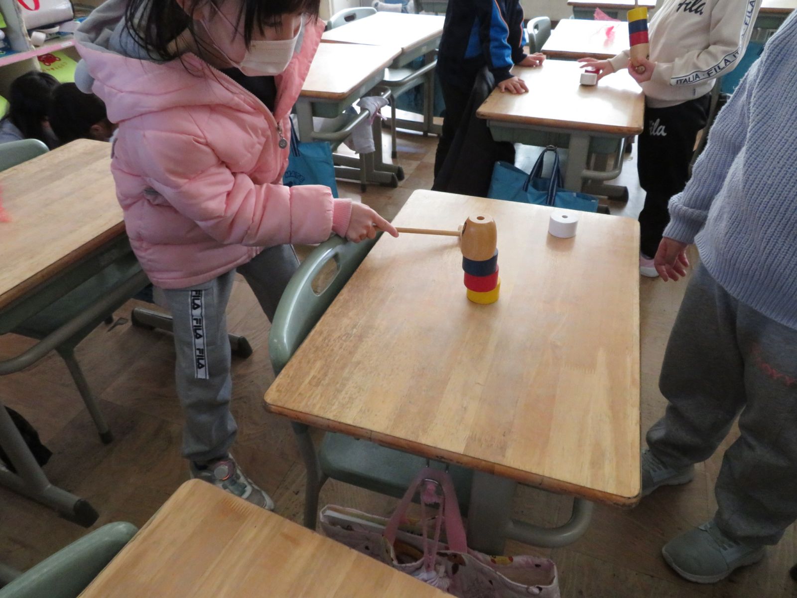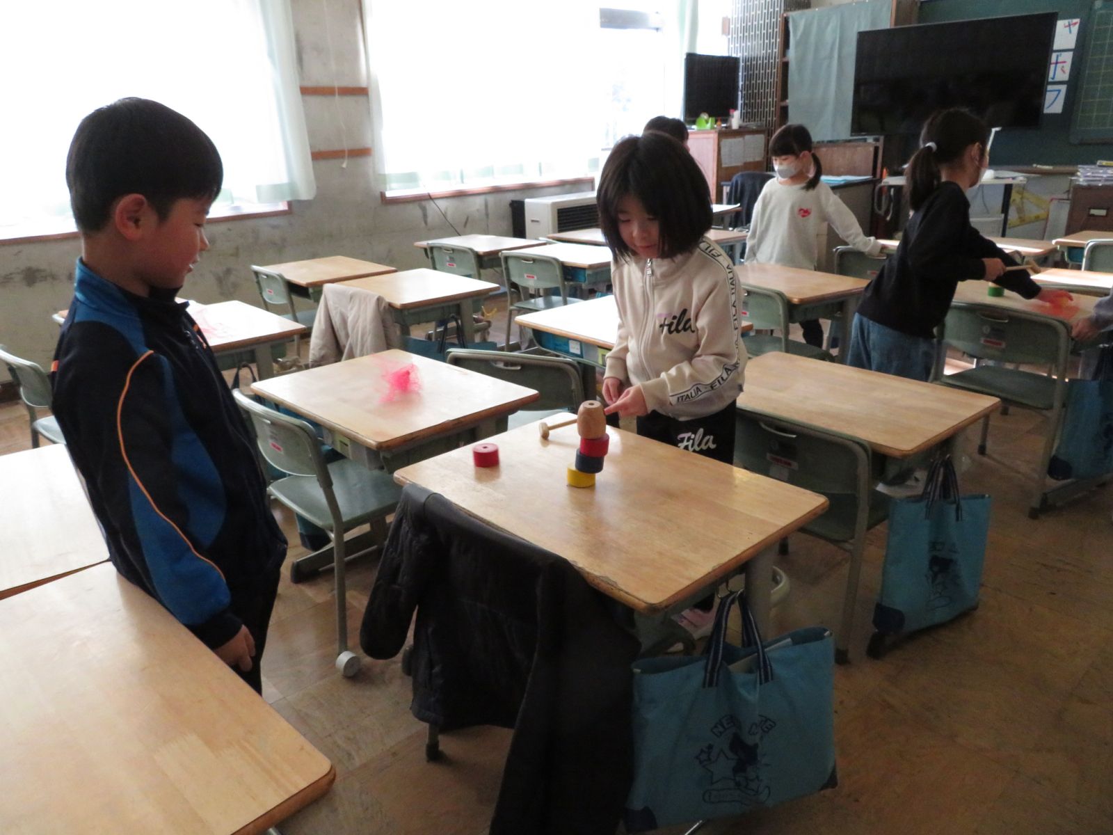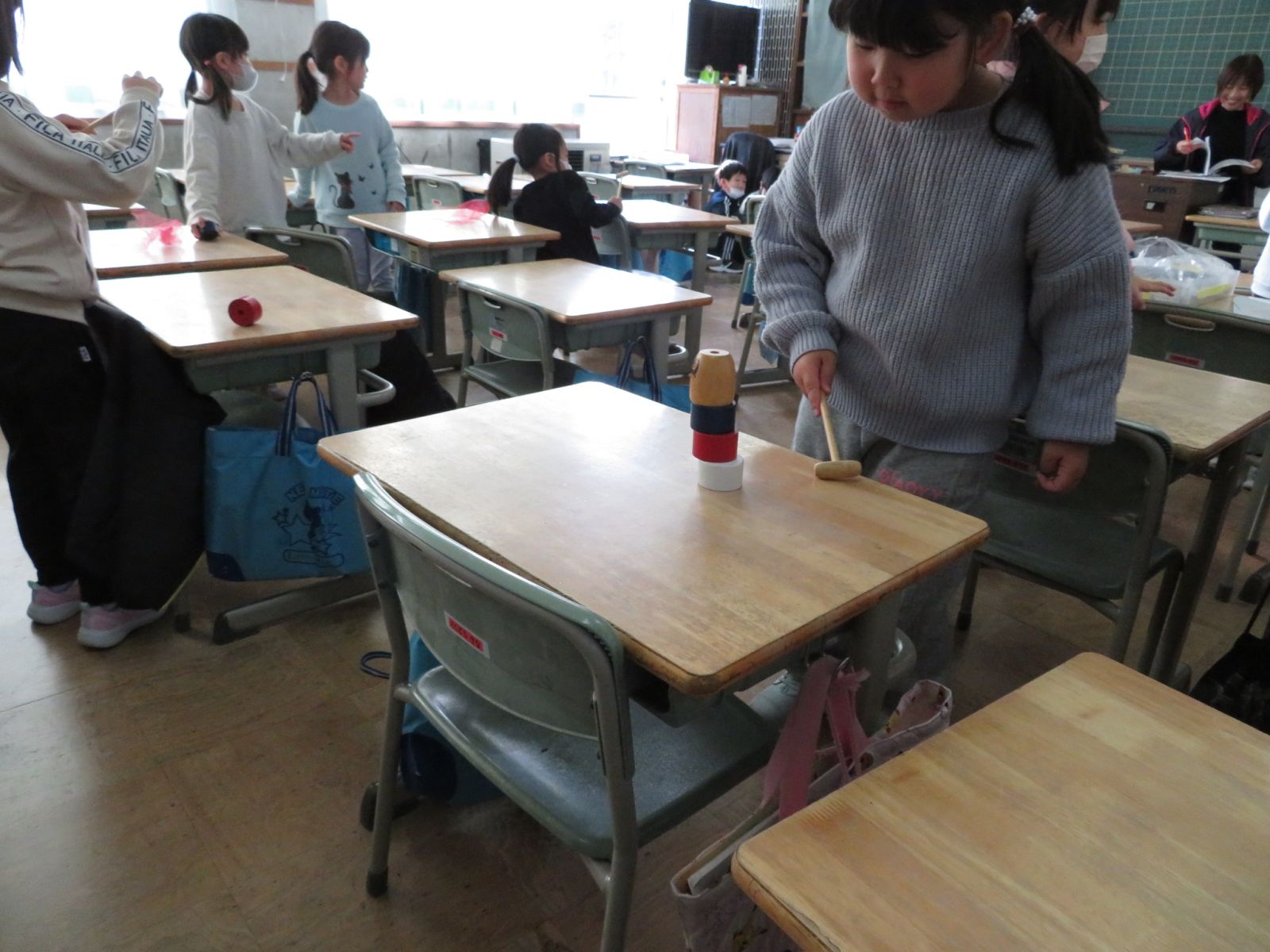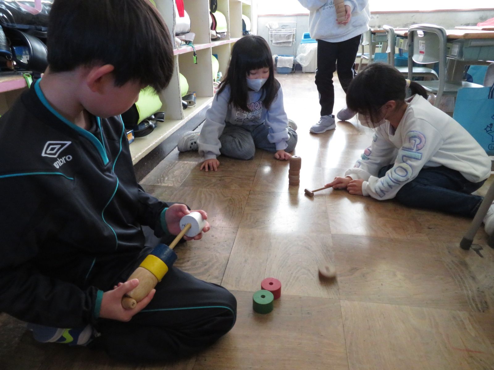 1年生の教室から楽しそうな声が聞こえてきました。みんなでだるま落としの練習をしています。あざやかな手さばきでじょうずにだるまを落としています。楽しみながら昔からの遊びに親しんでいました。