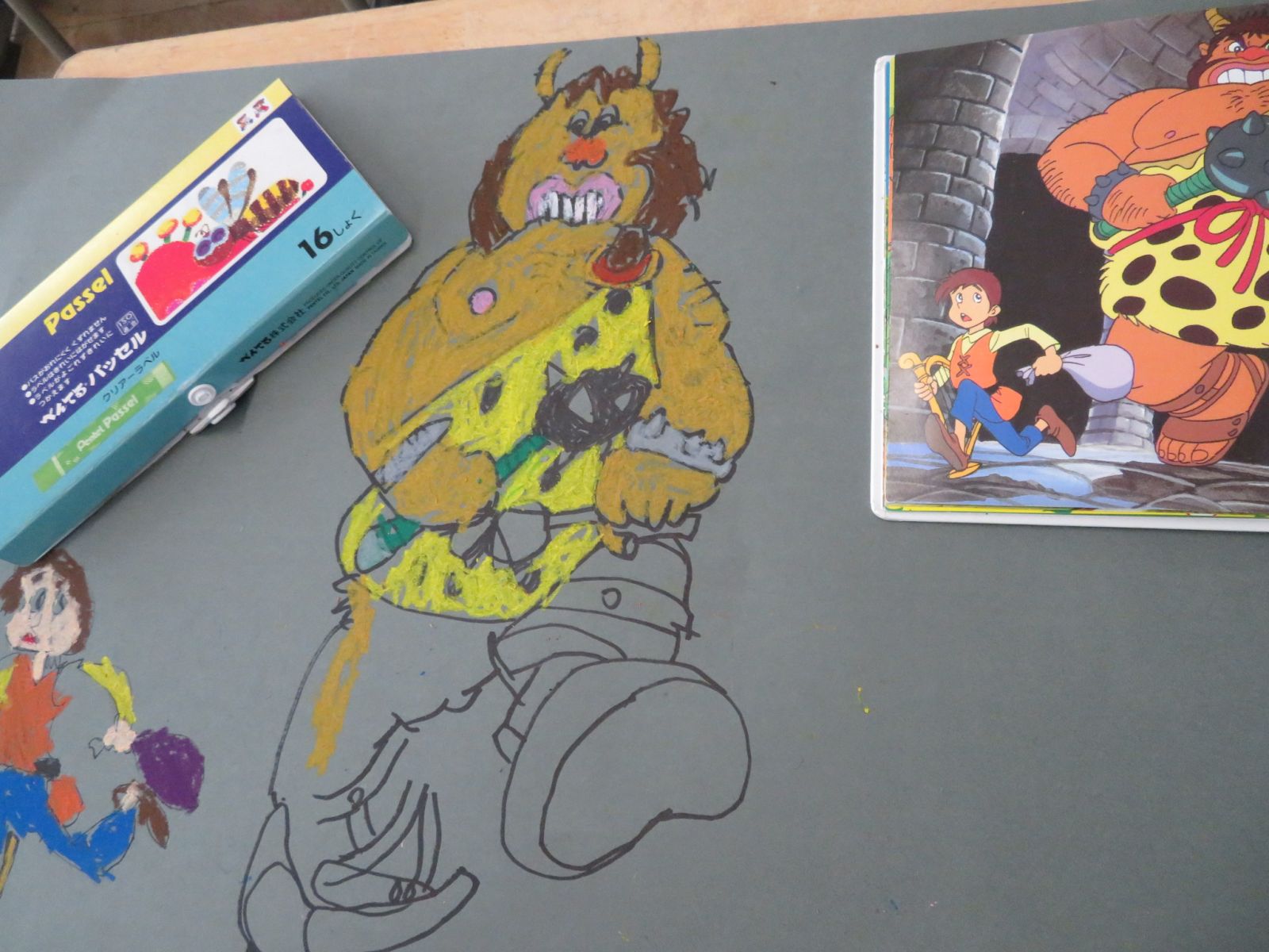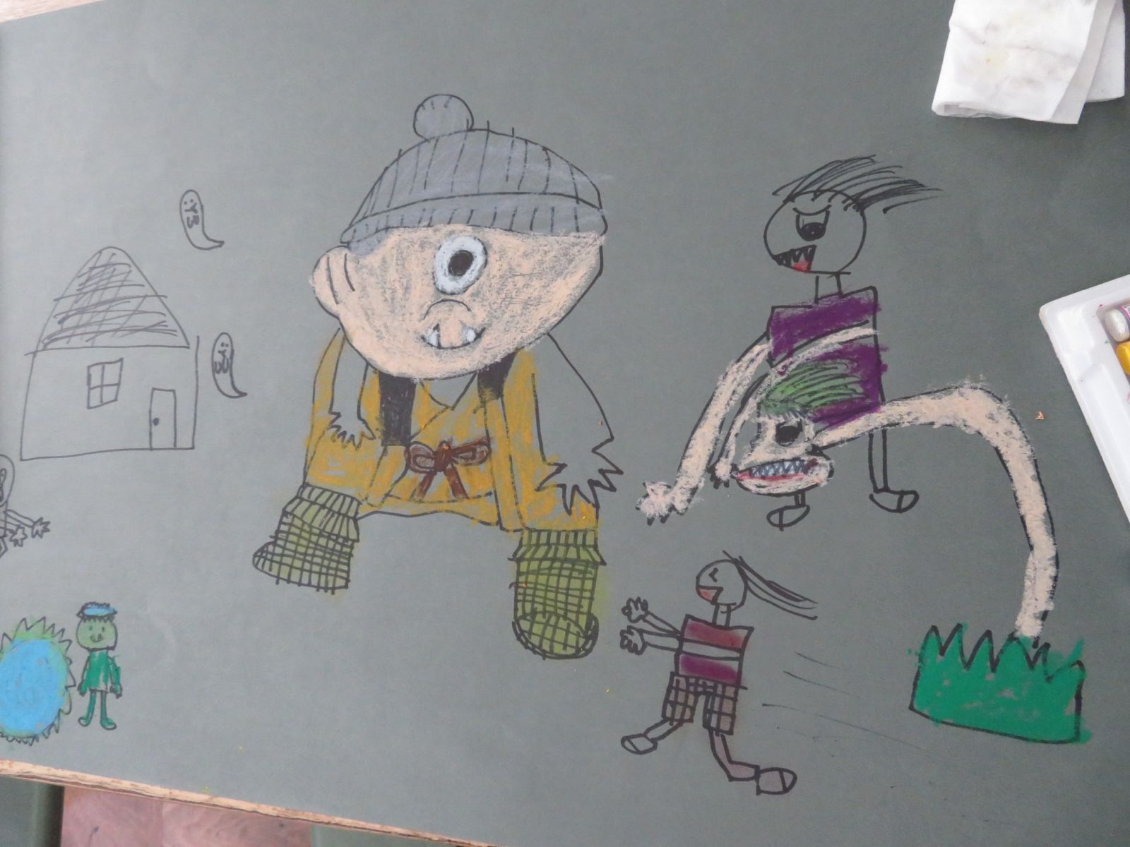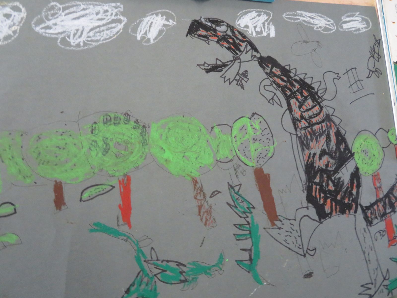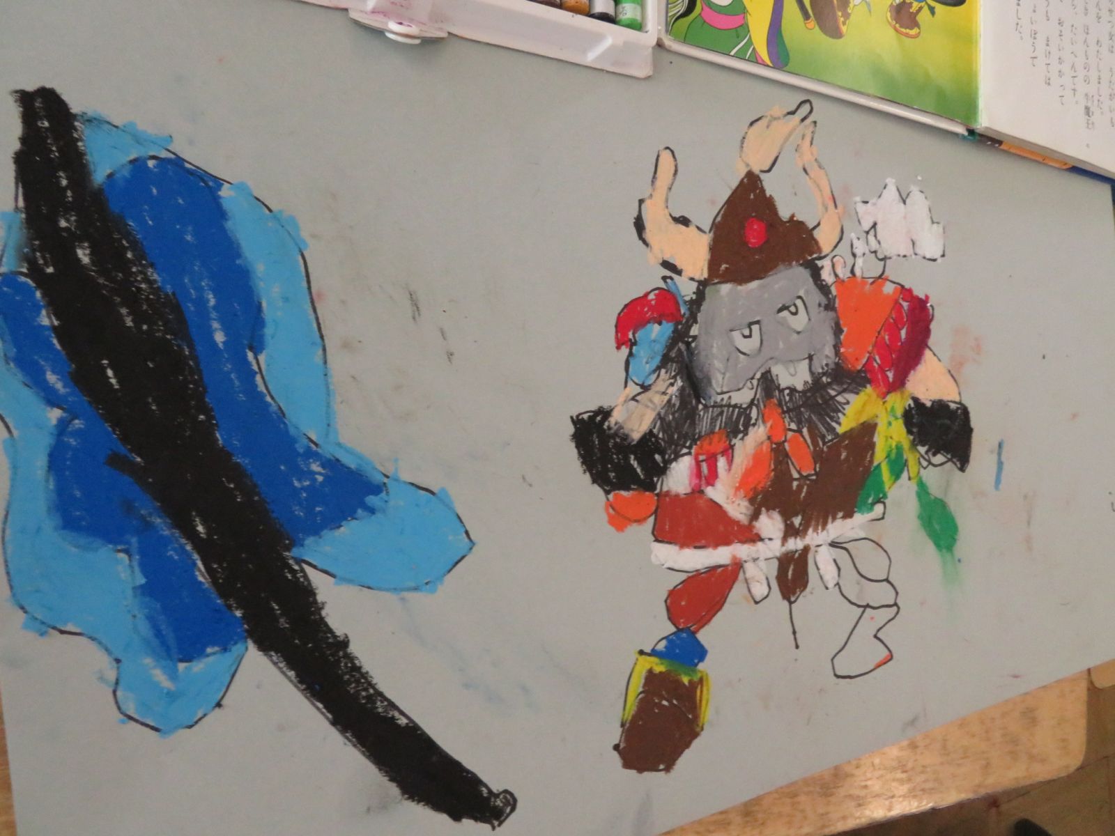 をかいています。とても迫力があってダイナミックな作品ばかりです。いろいろな色を使って,伸び伸びと作品をかいていますね。とてもじょうずですね!