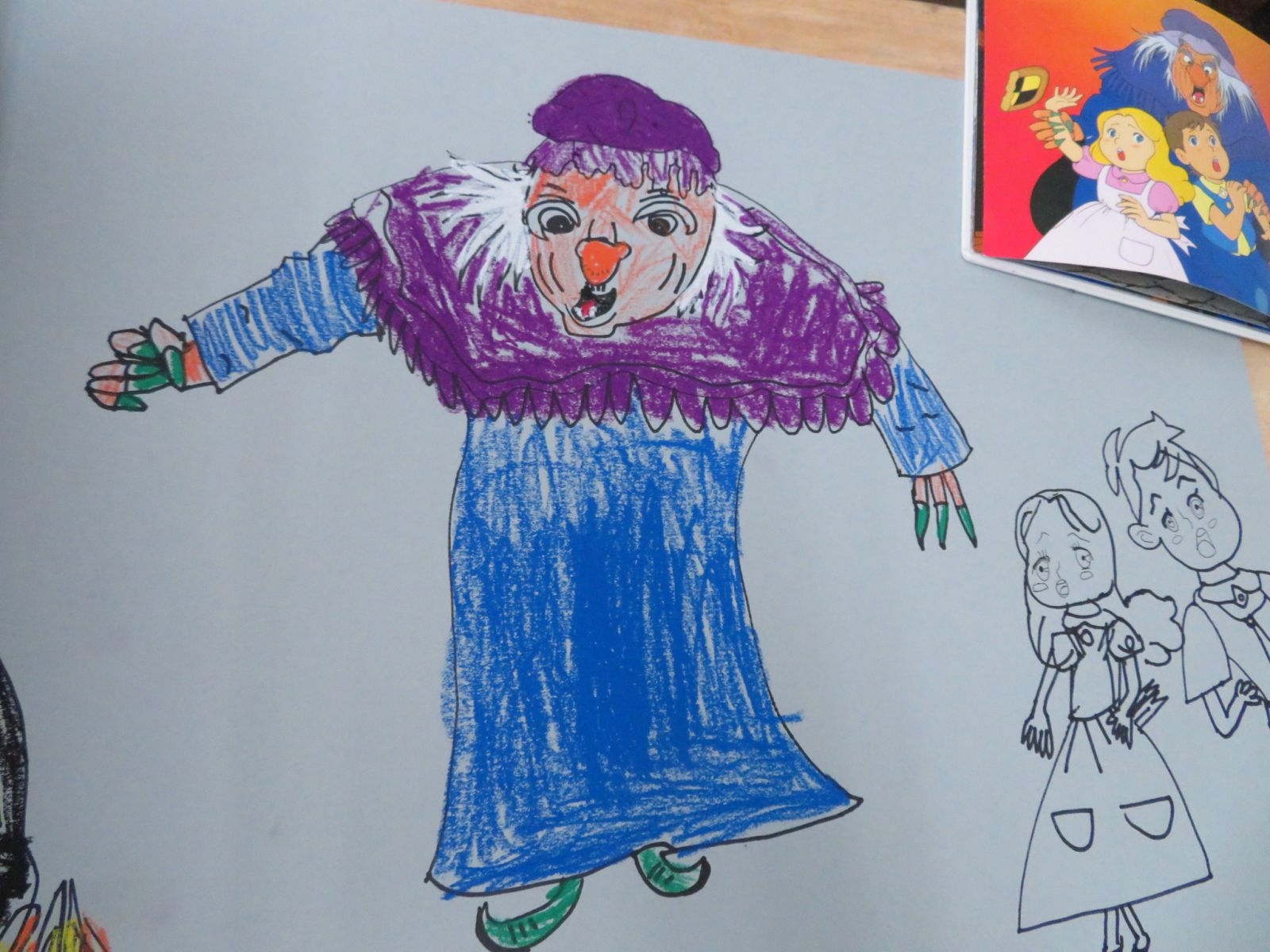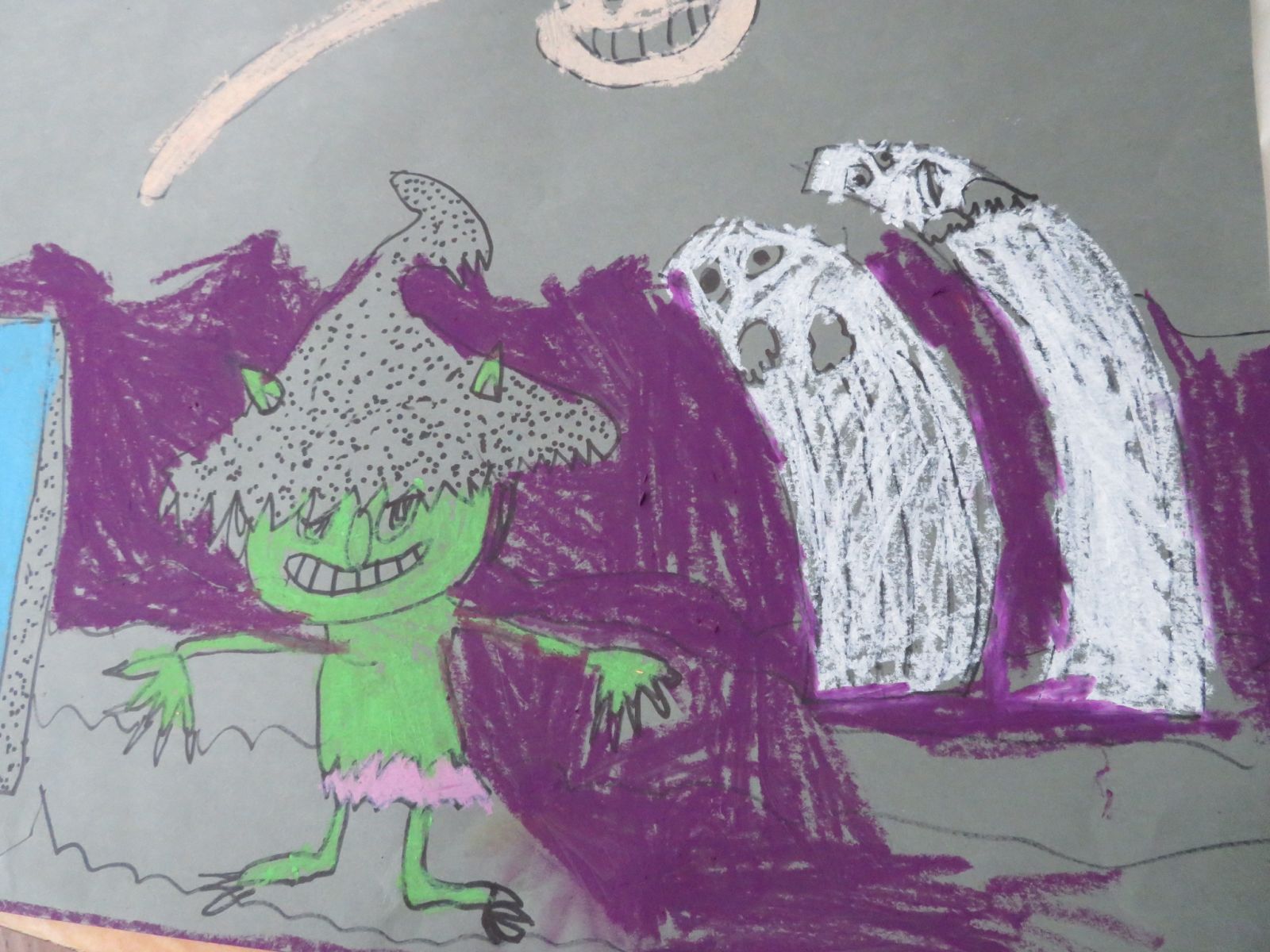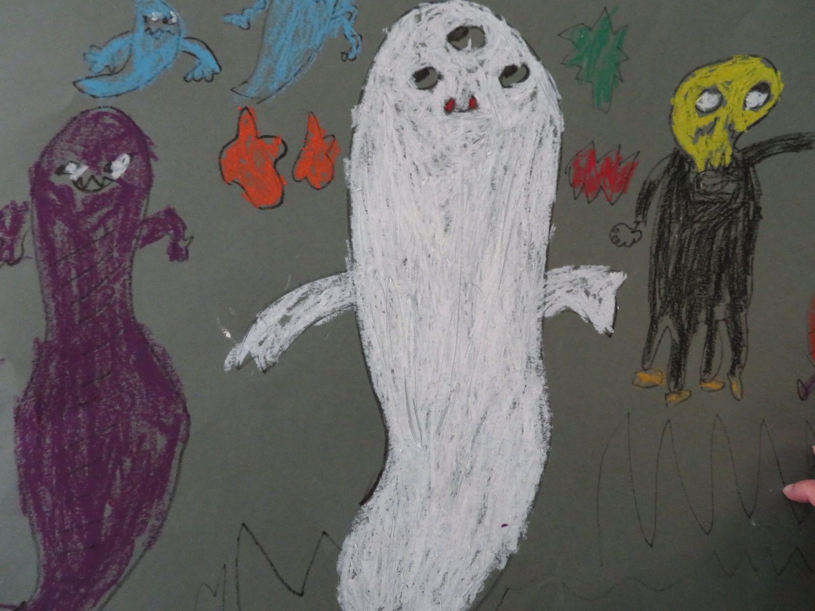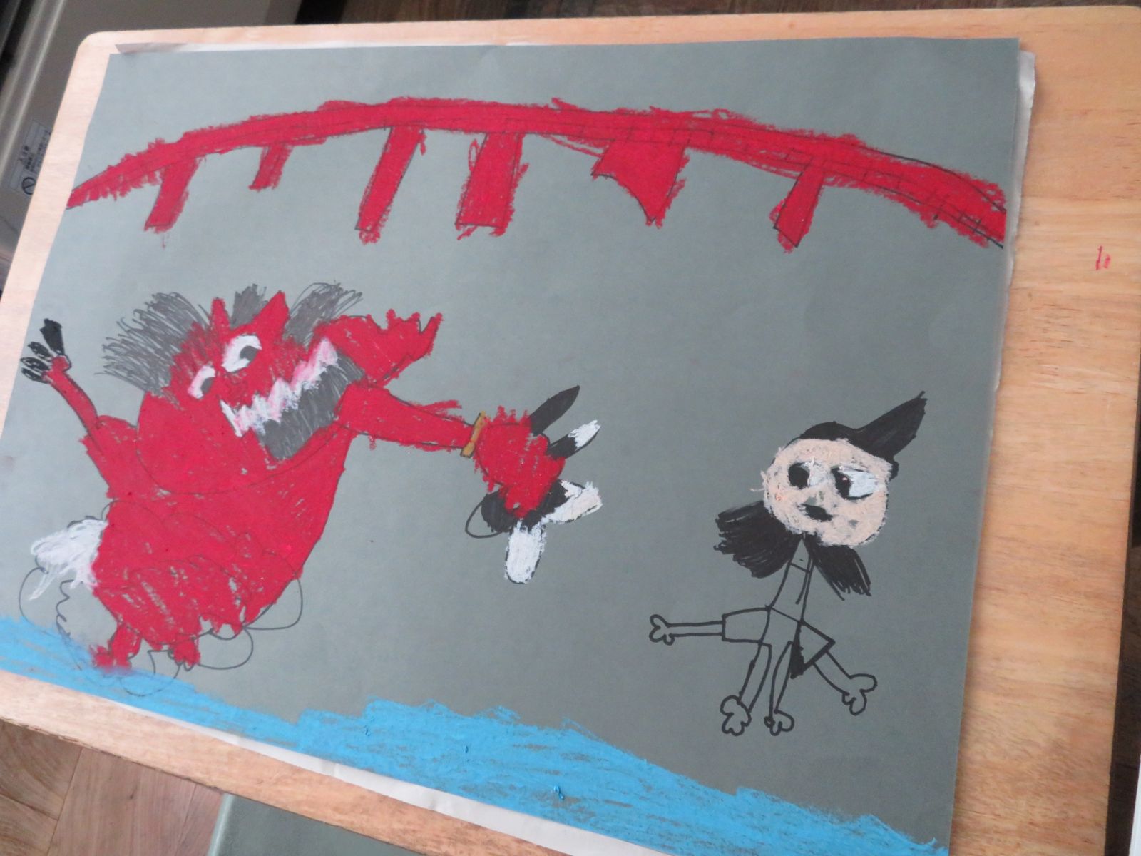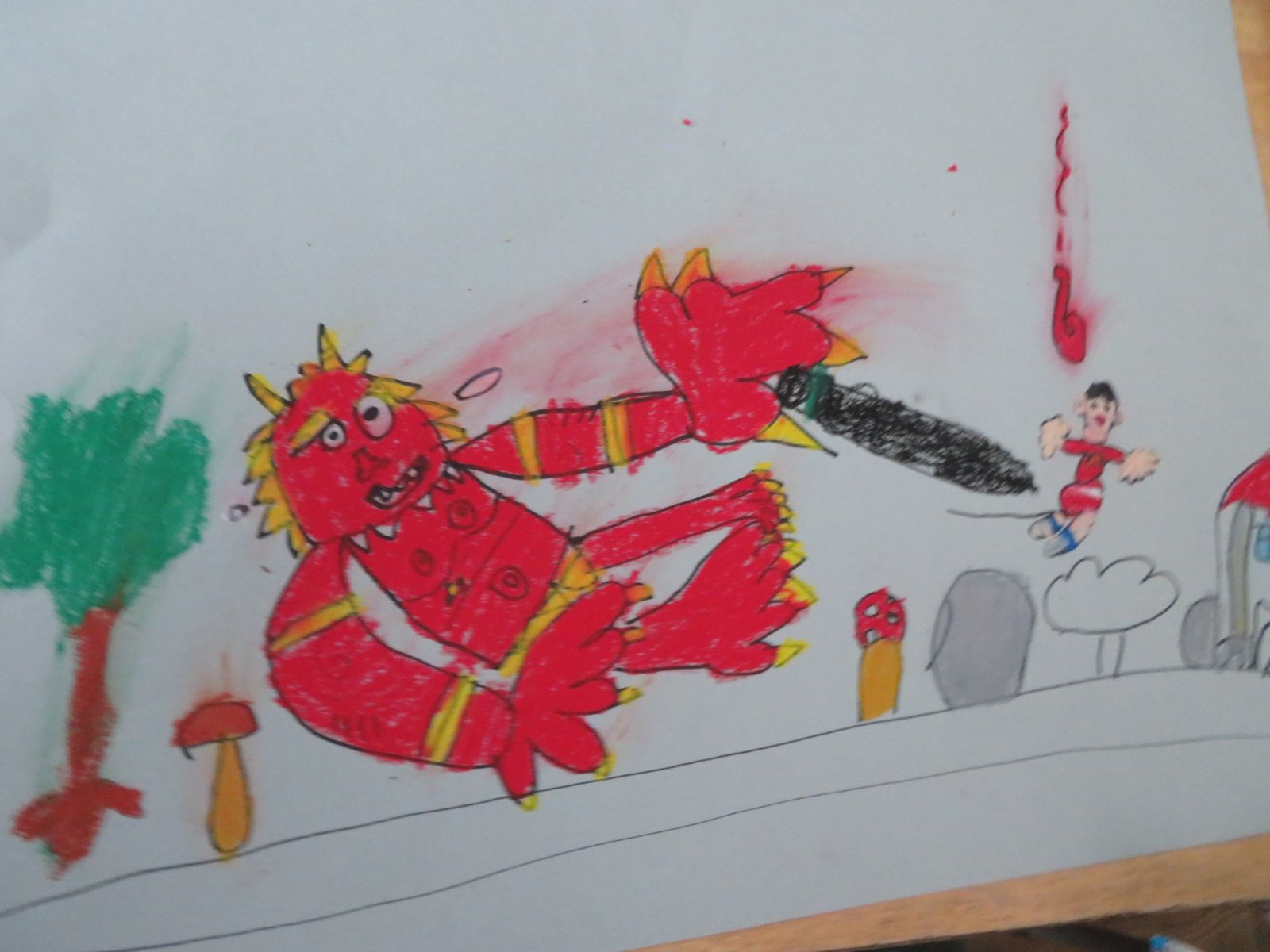 をかいています。とても迫力があってダイナミックな作品ばかりです。いろいろな色を使って,伸び伸びと作品をかいていますね。とてもじょうずですね!