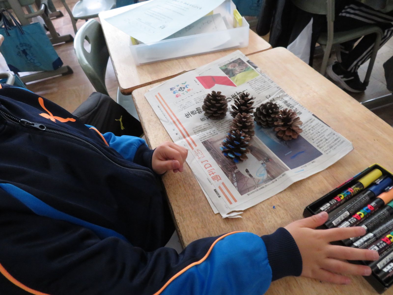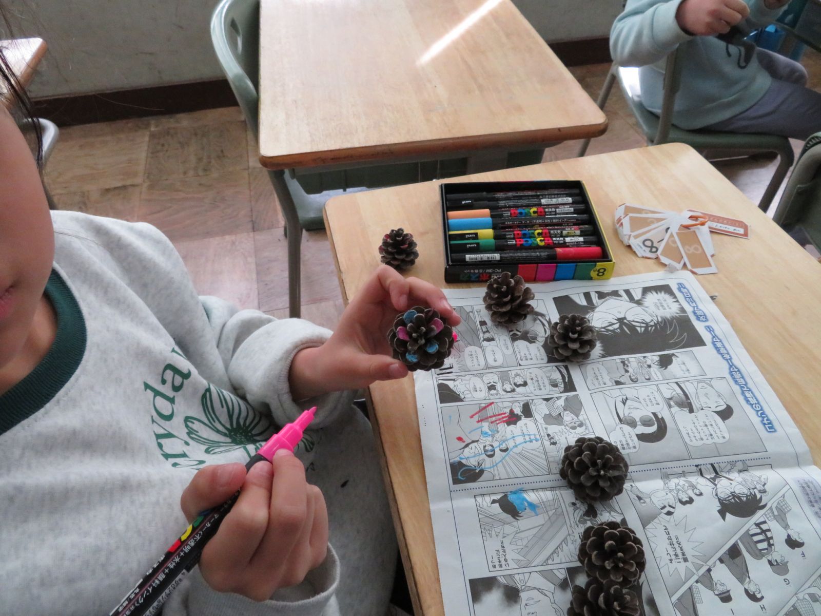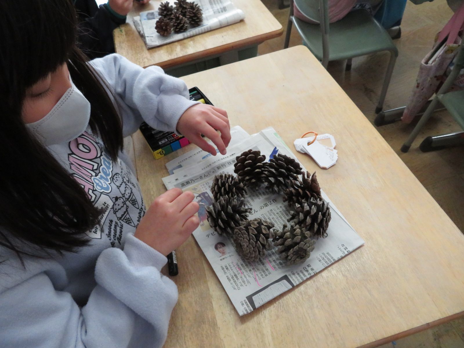 が始まりました。今日は松ぼっくりにペンで色を塗っています。すてきなリースがたくさんできあがりそうですね。完成を楽しみにしています。みんながんばってね!