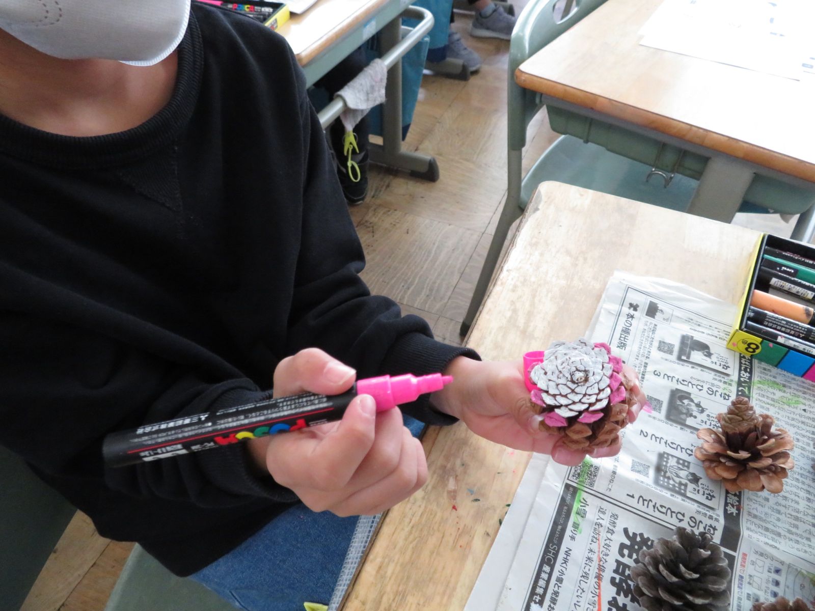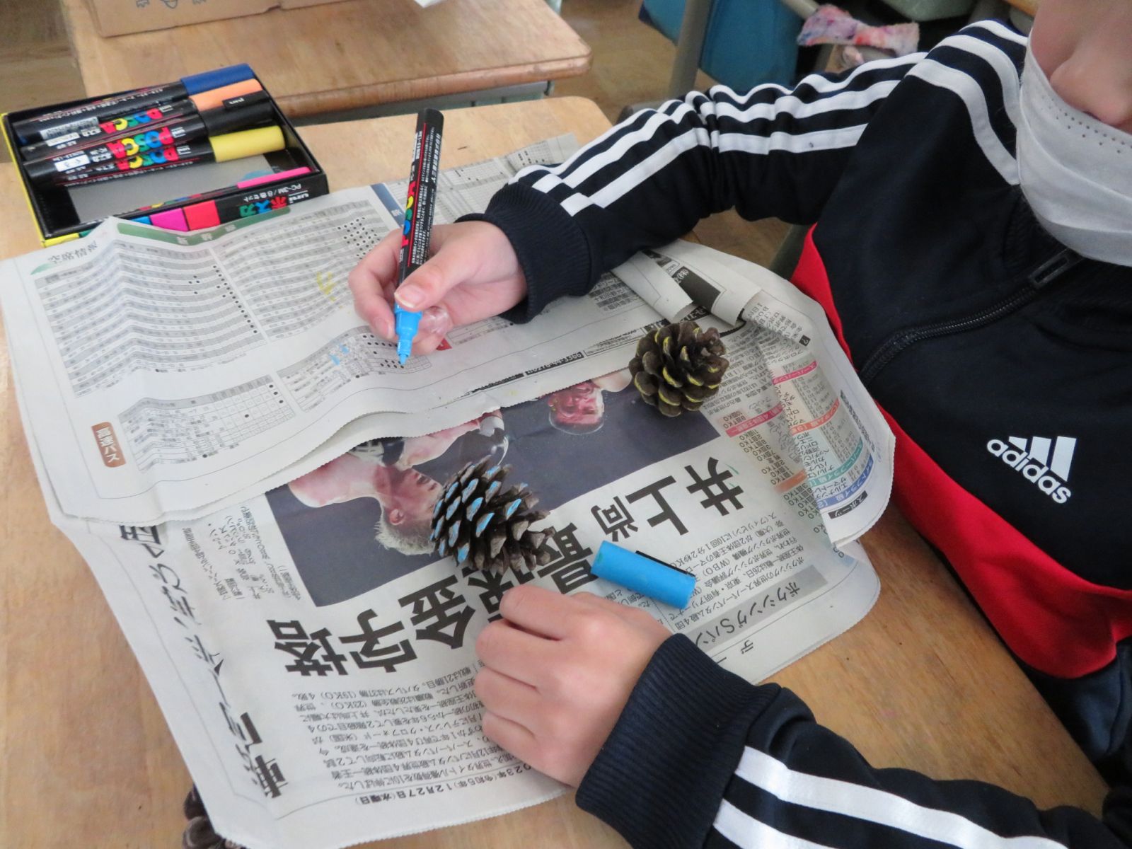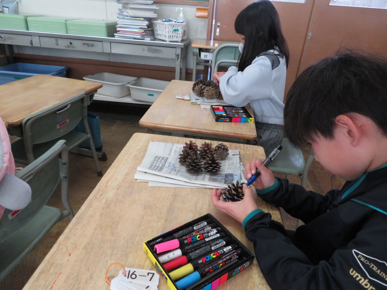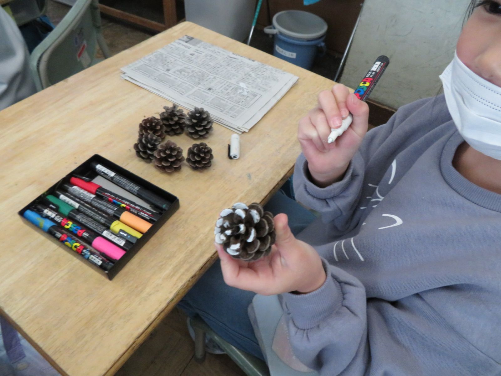 が始まりました。今日は松ぼっくりにペンで色を塗っています。すてきなリースがたくさんできあがりそうですね。完成を楽しみにしています。みんながんばってね!