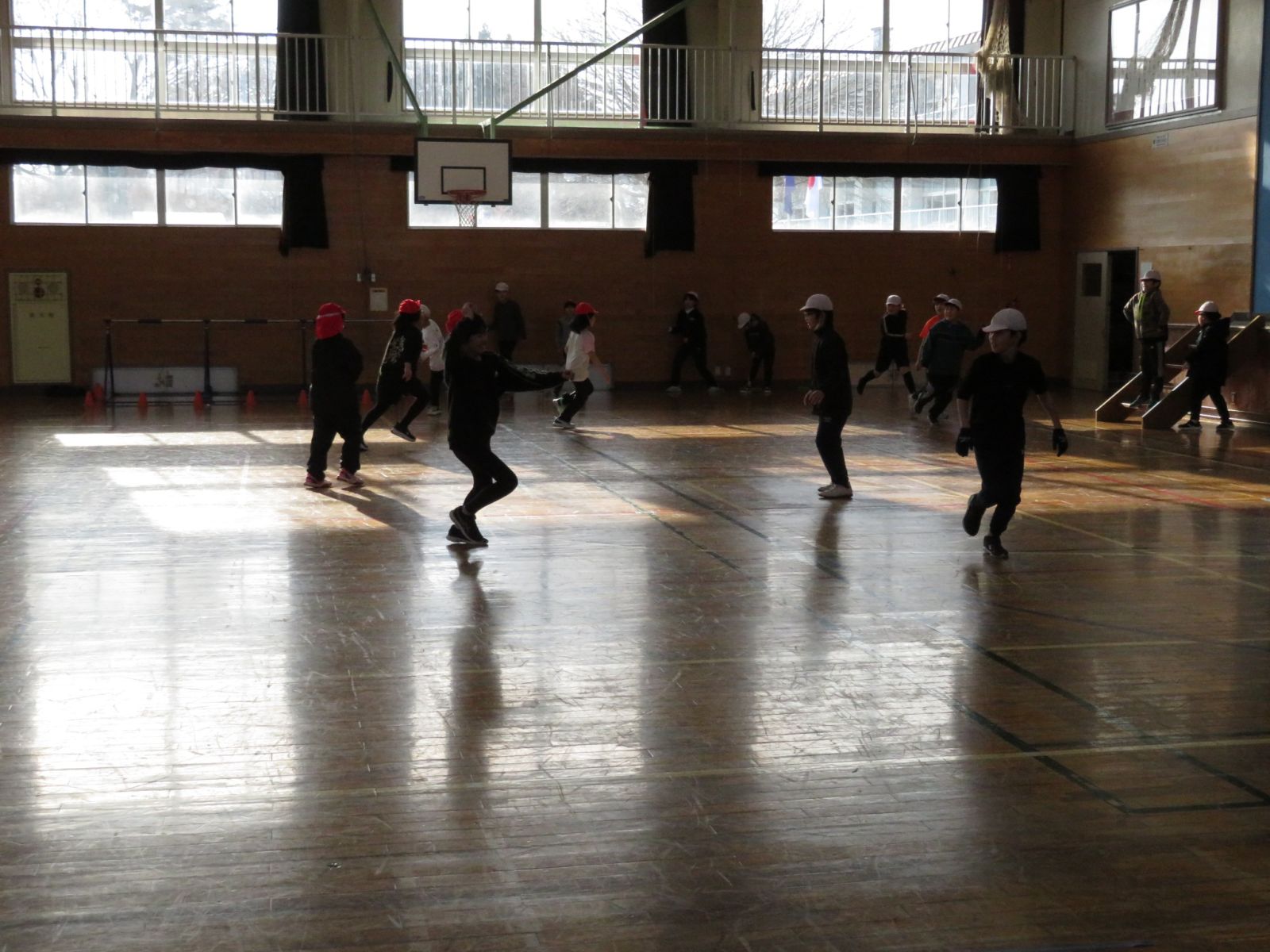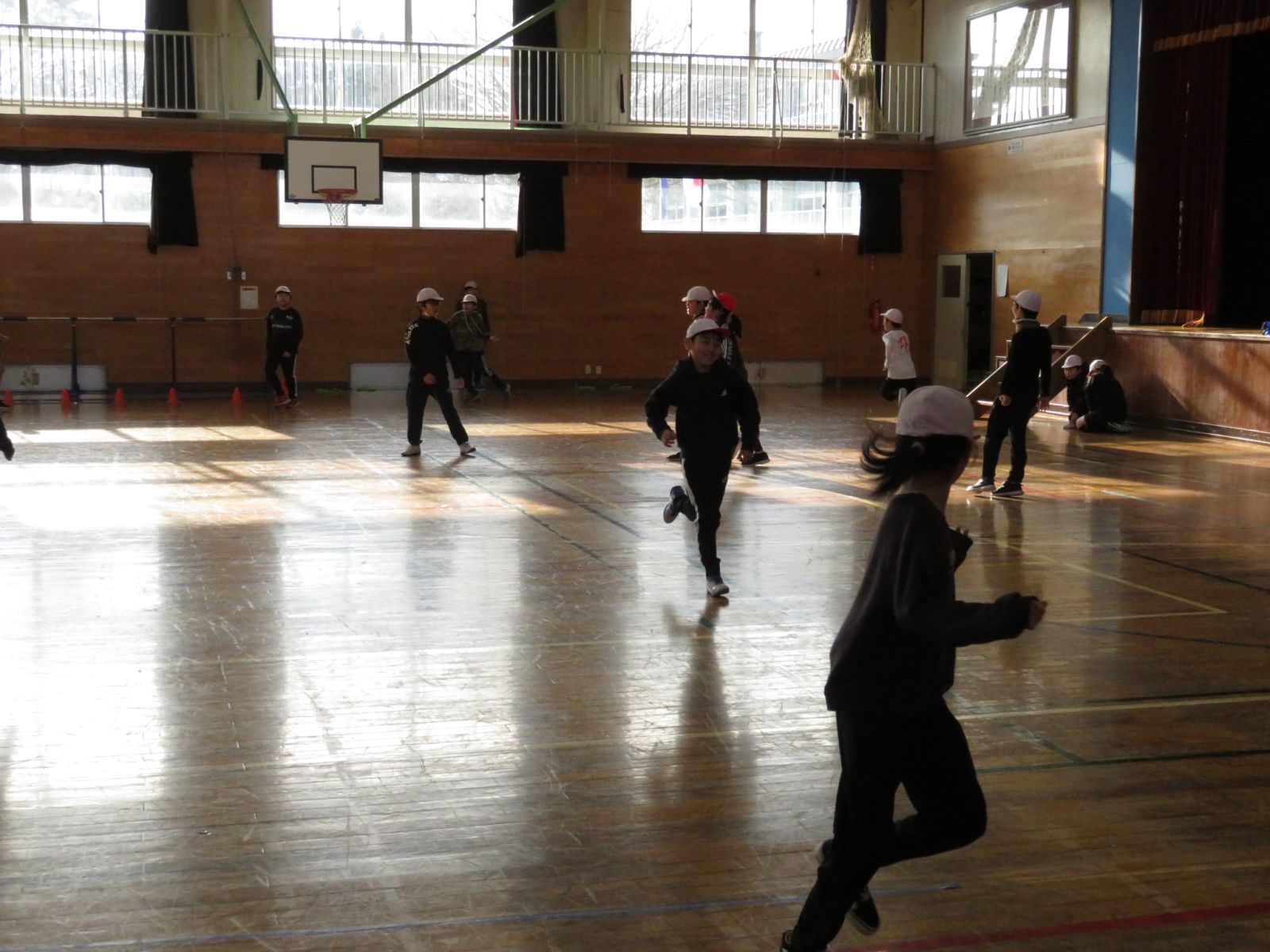 という運動を楽しんでいます。「ピンク!」など元気な声が体育館に響いていました。今日は日中かなりあたたかくなり,体育館や校庭で運動している子が多く見られます。