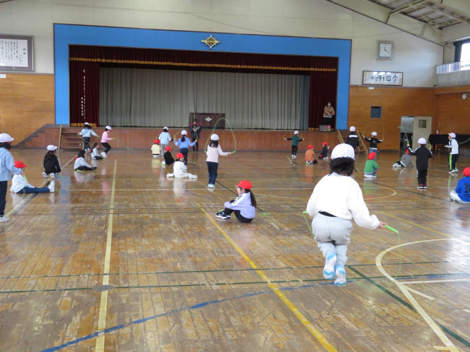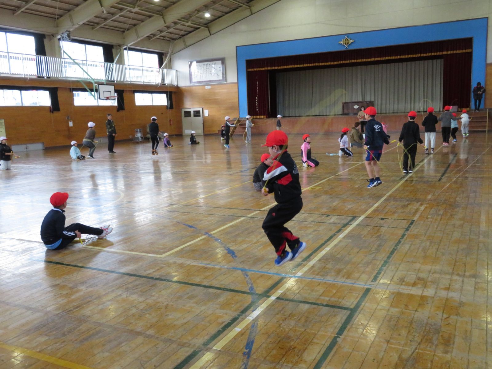 制限時間の中で,2年生は①交差跳び,②あや跳び,③後ろまわし,④前まわしの順番で跳びます。(ひっかかったら次の技に進みます。)1年生は①後ろまわし,②前まわしの順番で跳びます。「がんばれ!」「がんばれ!」という大声援が体育館いっぱいに響き,子どもたちのエネルギー全開でした。