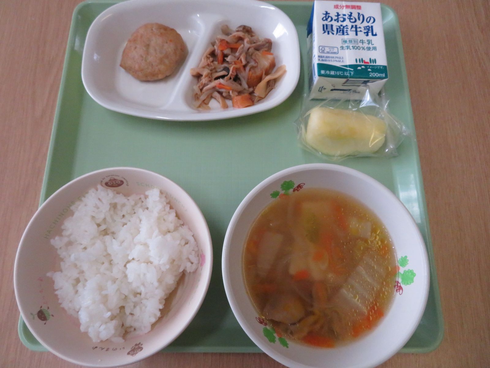 今日の給食は,ご飯,牛乳,ワンタンスープ,豆腐ハンバーグ,きのこのおかか煮,リンゴでした。午前中に校内なわとび記録会があり,子どもたちは,自分の競技だけでなく友達への応援もがんばっていました。給食をしっかり食べてエネルギーチャージしましょう。
