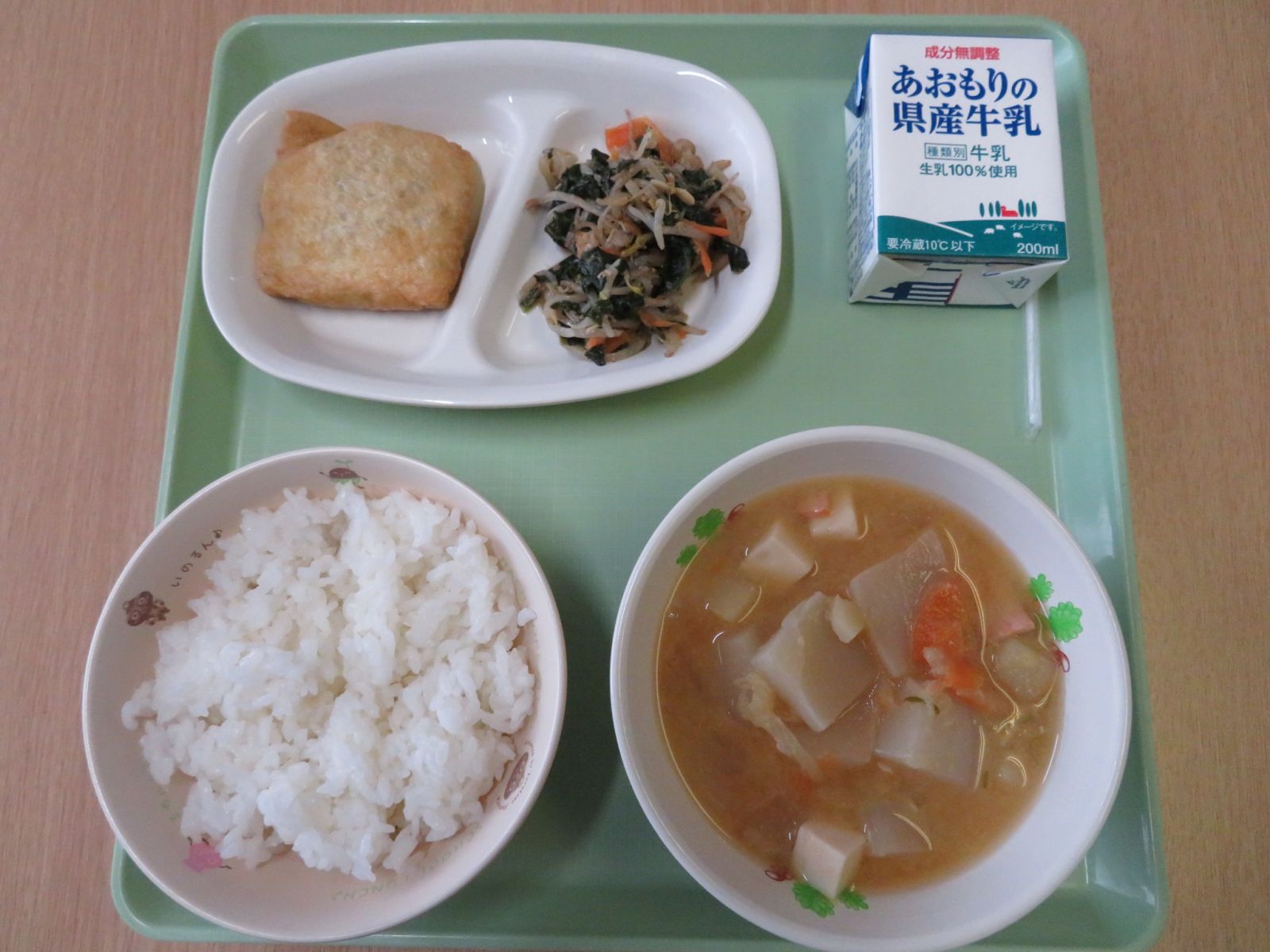 ご飯,牛乳,石狩汁,信田煮,ほうれん草のごま炒め