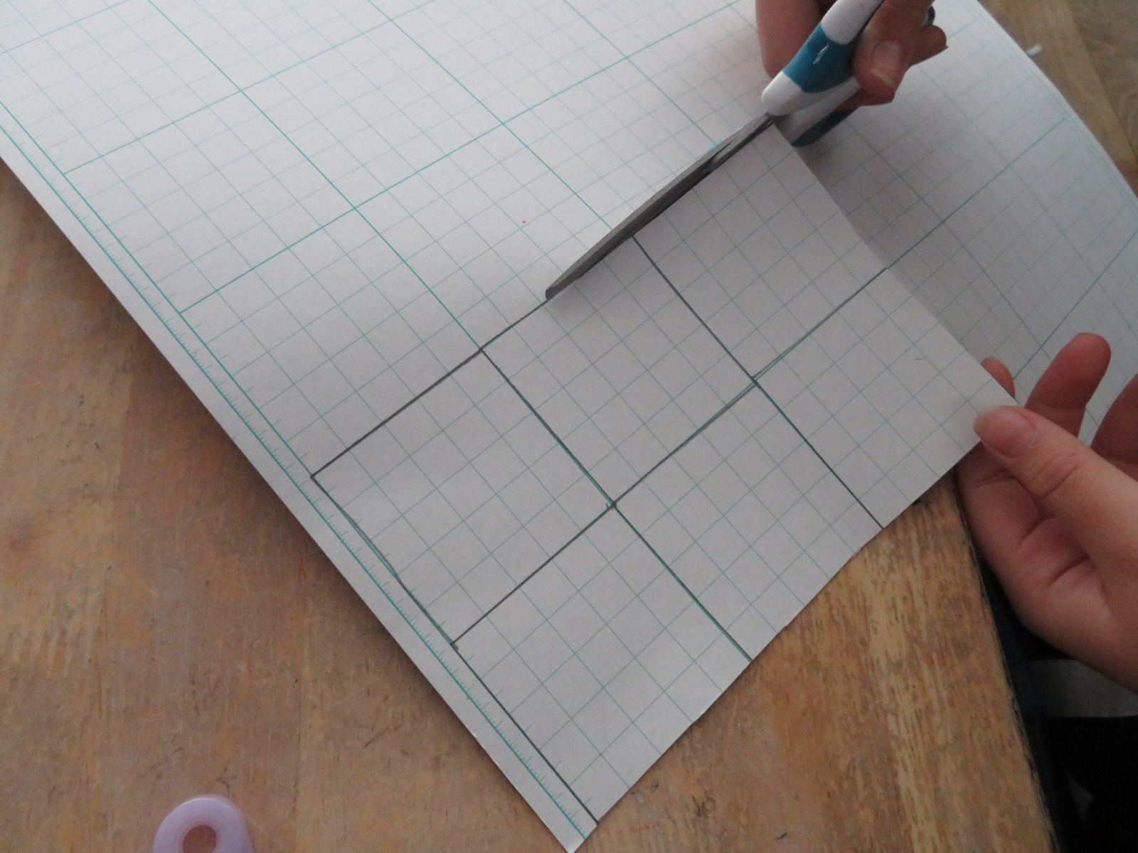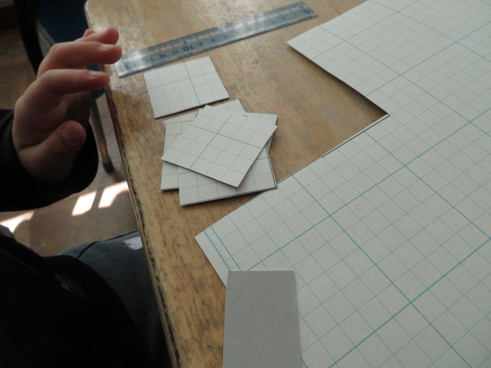 3時間目の2年生の算数の様子です。方眼紙を切って