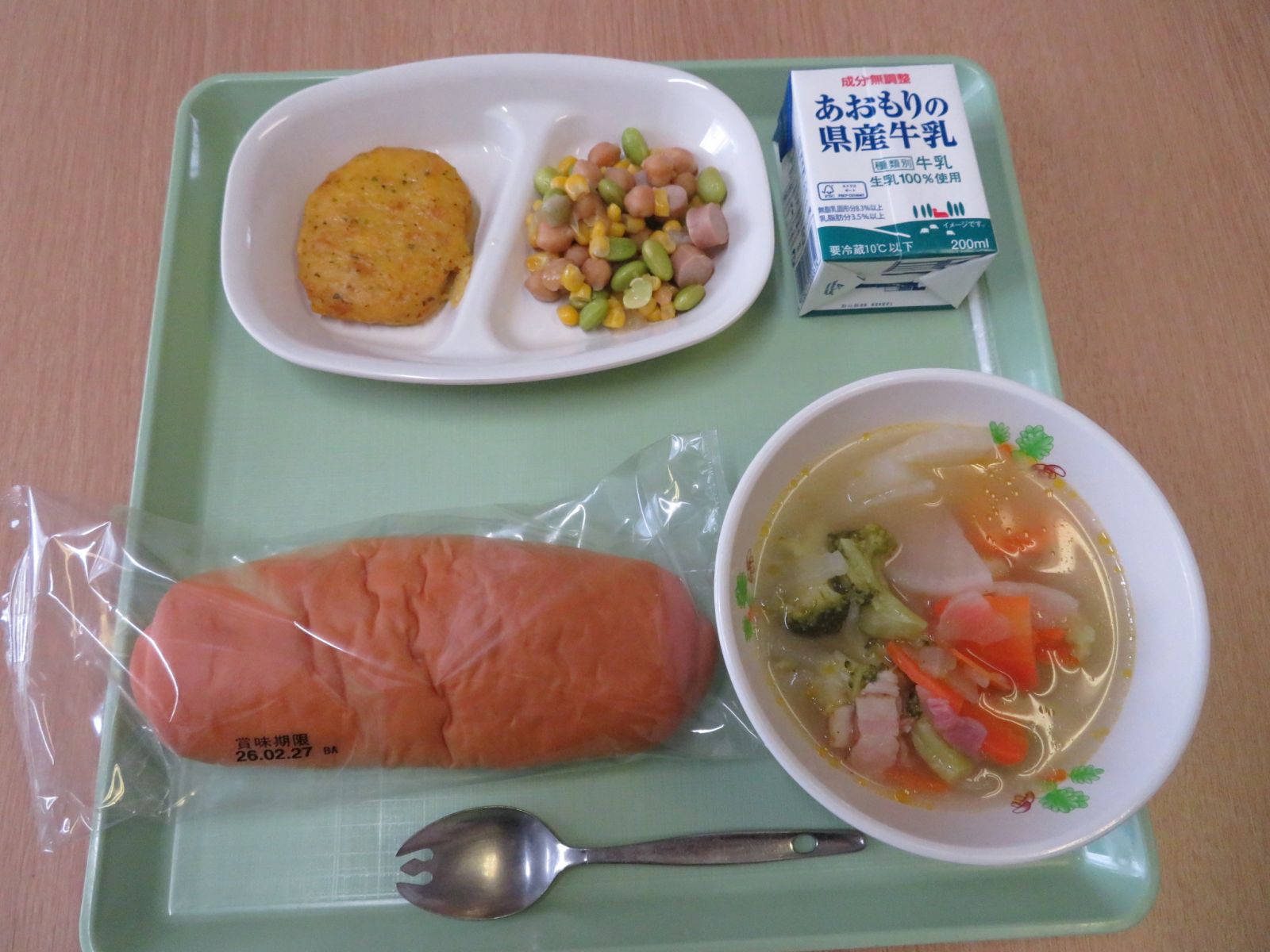 コッペパン(1・2年生は丸パン),牛乳,ポトフ,チキンピカタ,ガルバンゾー(ひよこ豆)とコーンのソテー