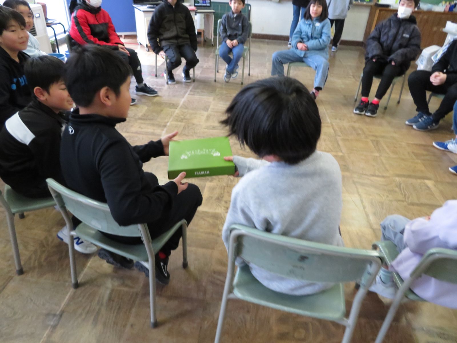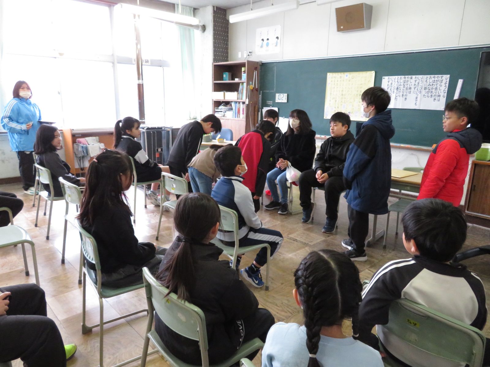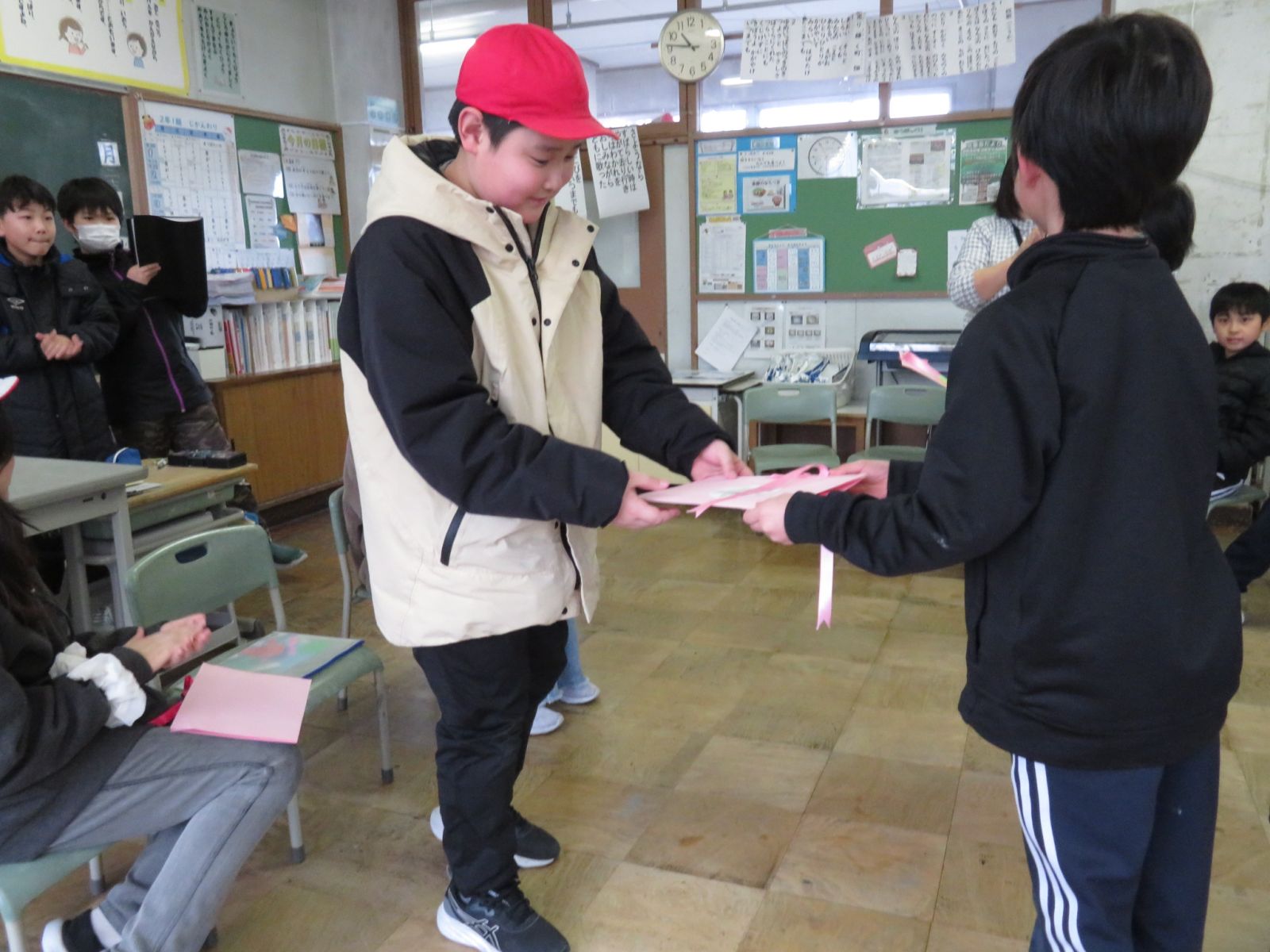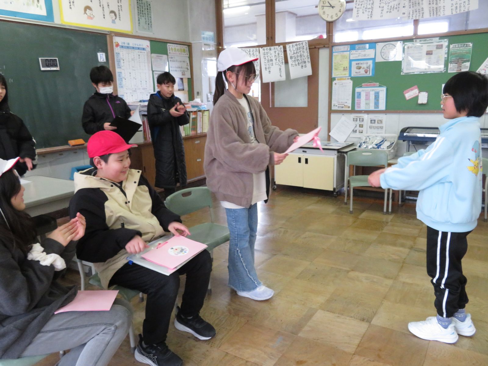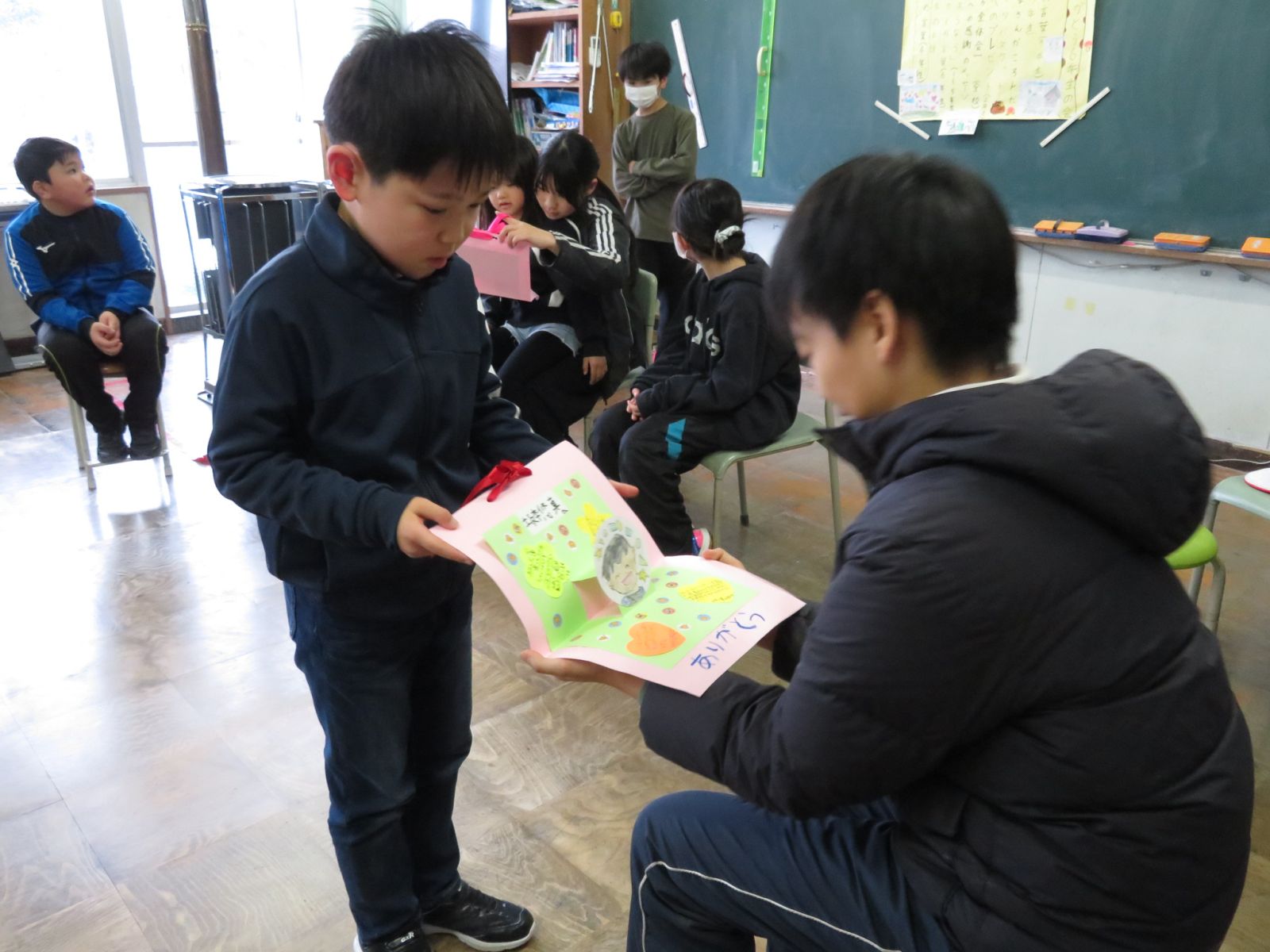 3校時にありがとう6年生の会がありました。たてわり班ごとにいす取りゲームなどをして楽しんだあと,6年生へ感謝のプレゼントを渡しました。どの班も5年生の皆さんがたのもしいリーダーになって会を進めてくれました。6年生はもうすぐ卒業し,この学校をはなれますが,6年生との思い出は下級生の心にいつまでも残ることでしょう。