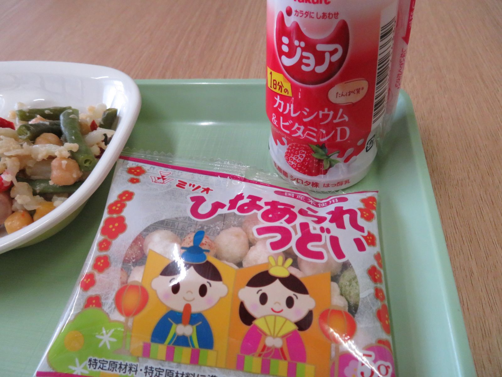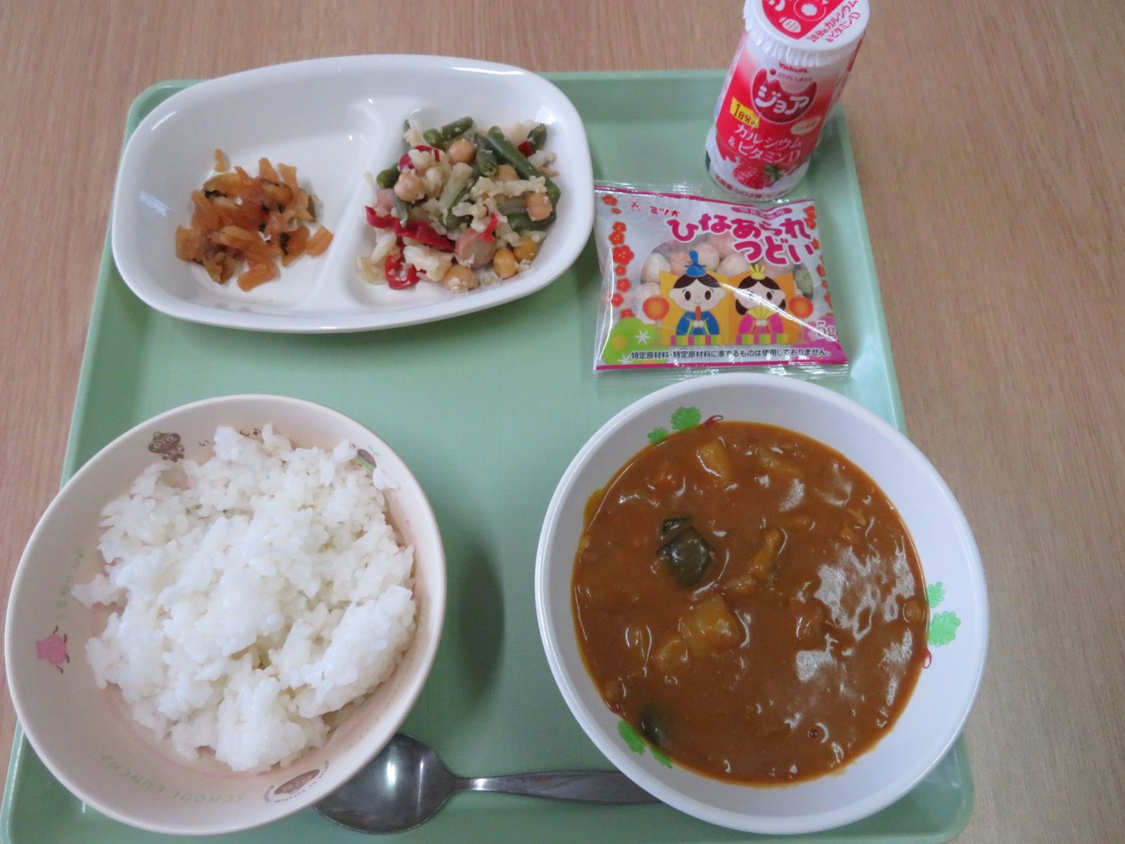 ご飯,ジョア(ストロベリー),ポークカレー,ベジタブルソテー,福神漬け,ひなあられ