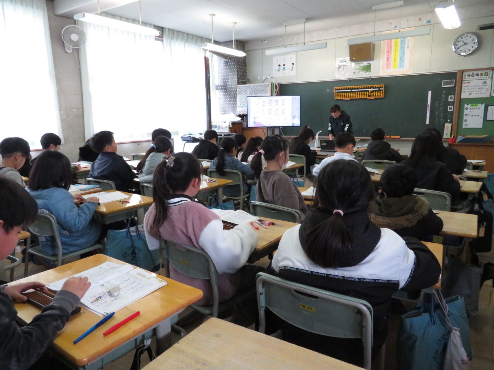 を使ってたし算やひき算をがんばっています。シーンとした中に子どもたちのそろばんをはじくバチバチという音だけが響いていました。3年生がんばっています。
