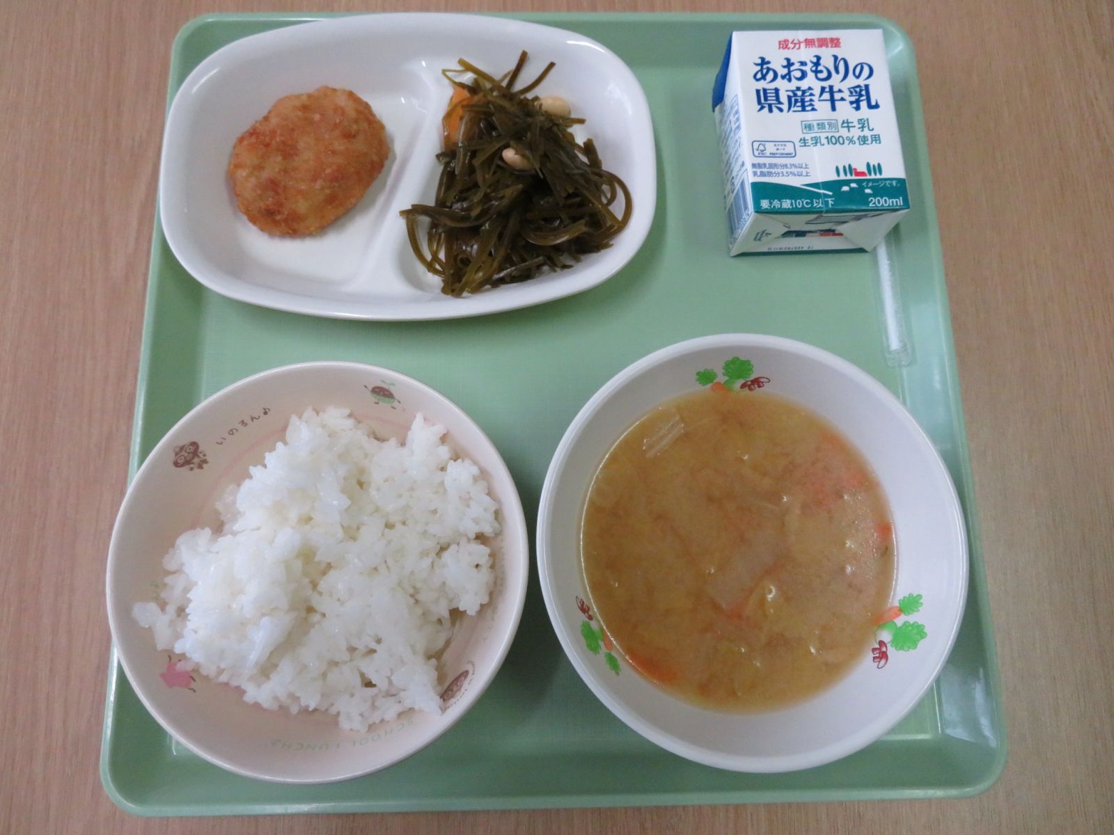 ご飯,牛乳,白菜とエノキタケの味噌汁,タコメンチカツ,ひき昆布の煮つけ