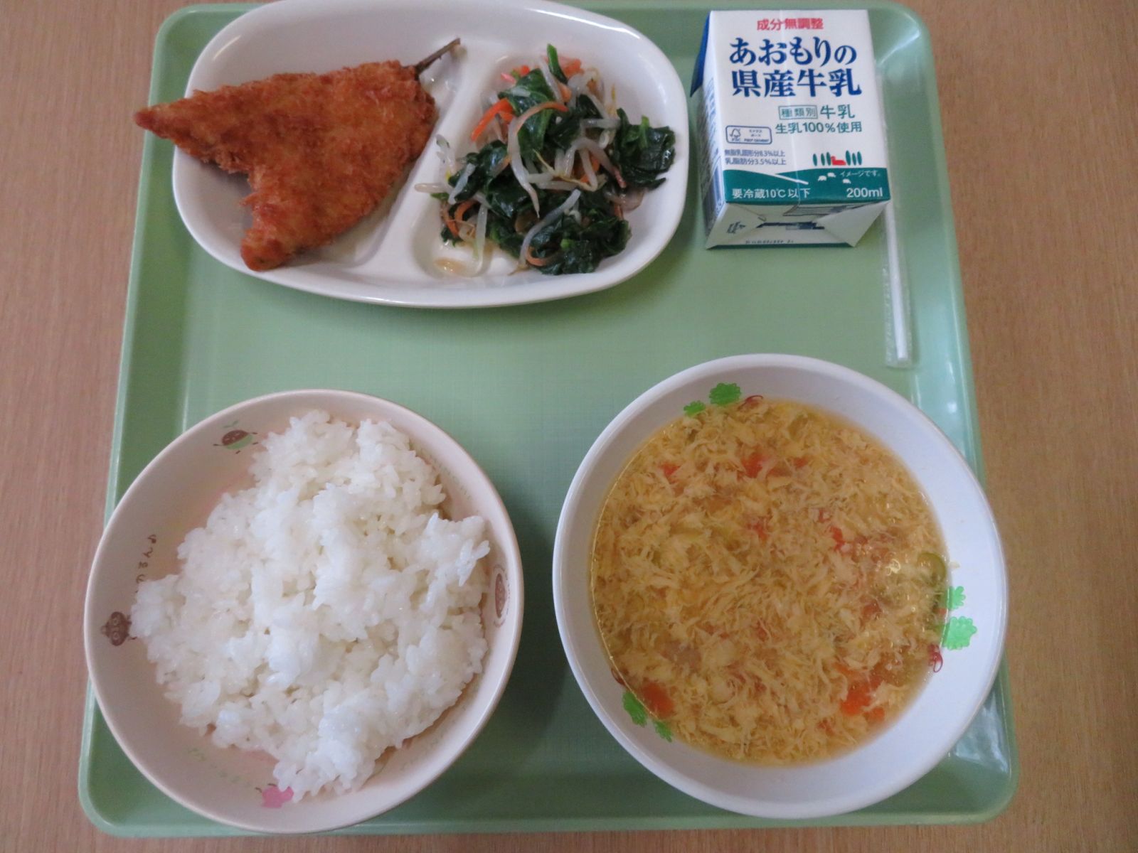 ご飯,牛乳,かきたま汁,アジフライ,韓国風サラダ(ナムルドレッシング)