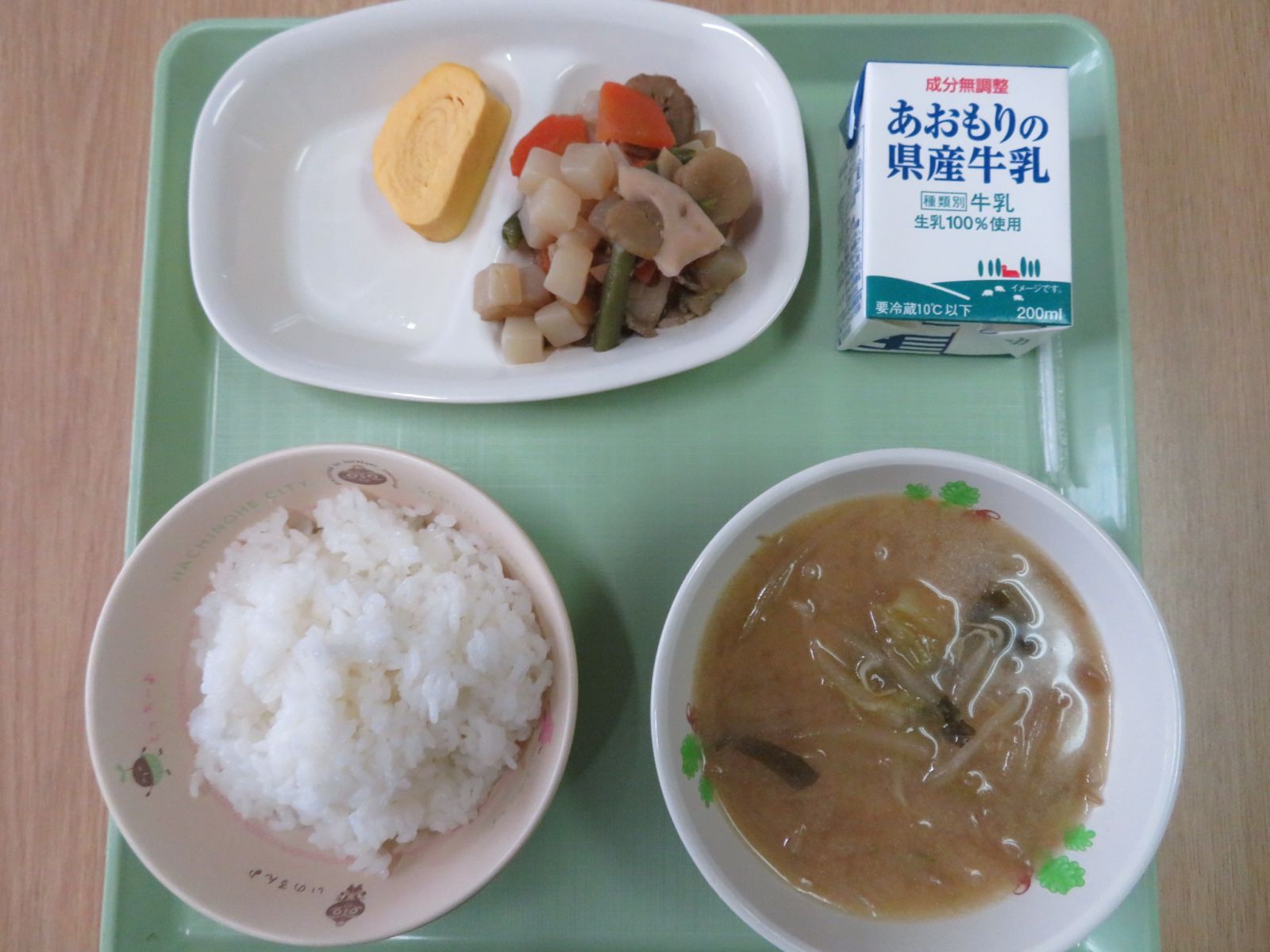 ご飯,牛乳,もやしと生揚げの味噌汁,筑前煮,だし巻きたまご