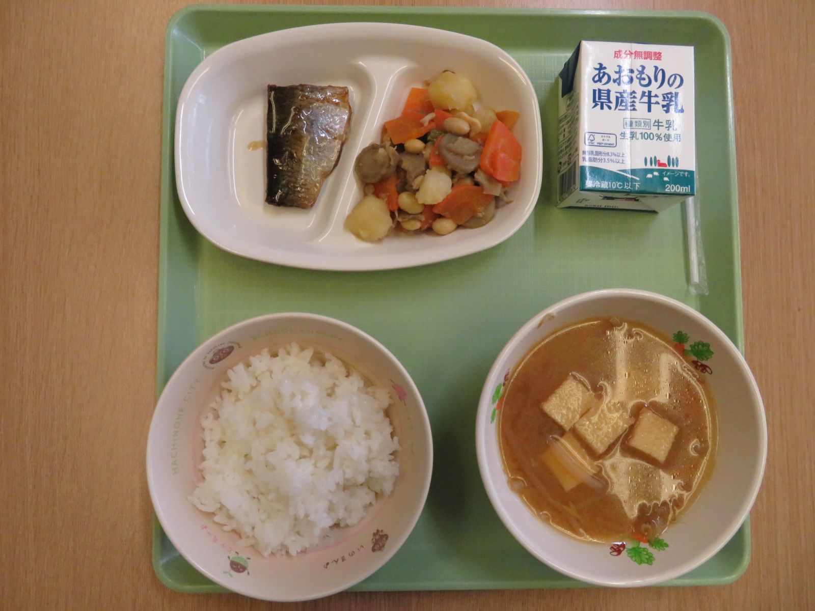 ご飯、牛乳、もやしと生揚げの味噌汁、大豆と鶏肉の甘辛煮、にしん照り焼き