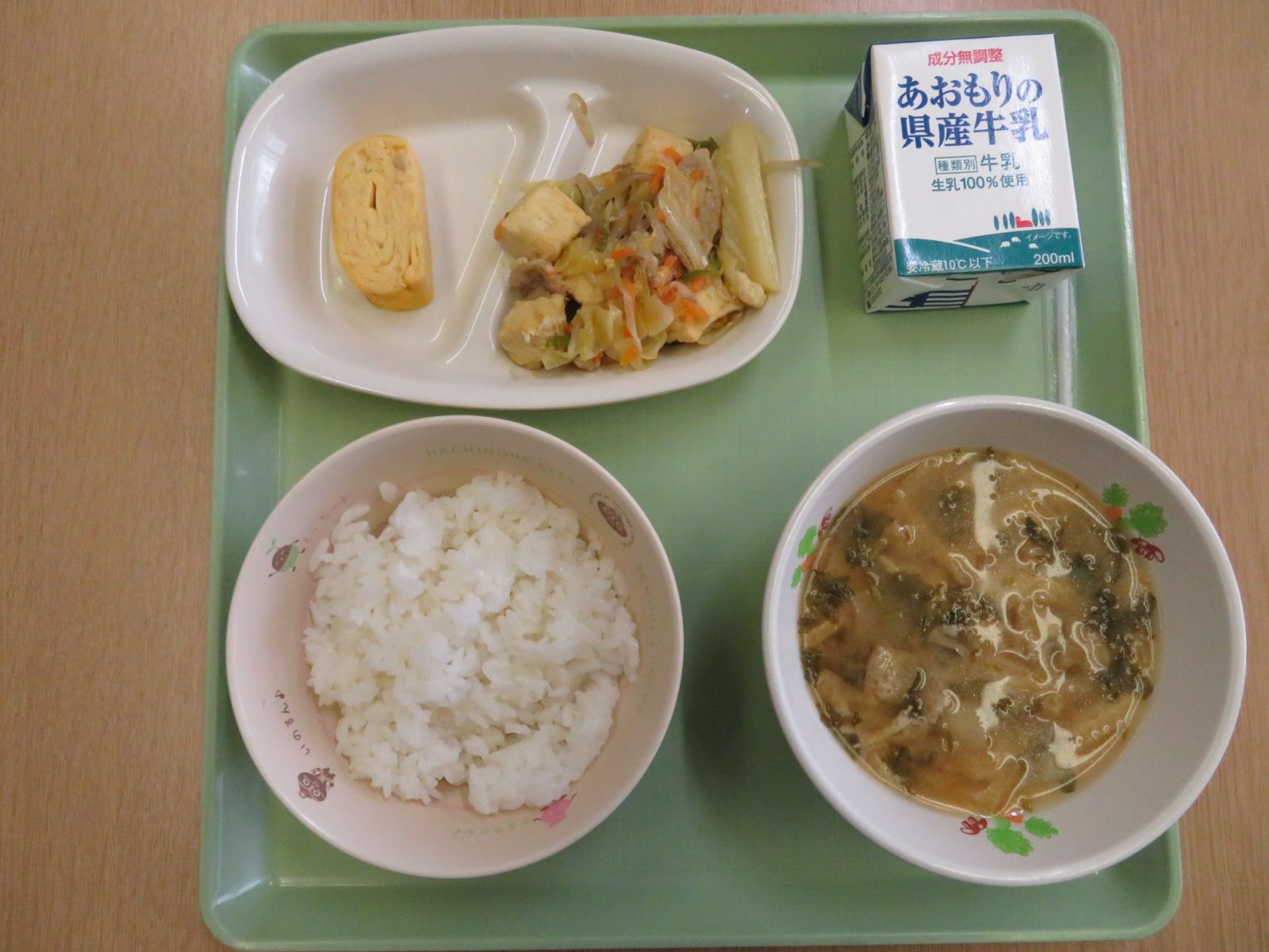 ご飯、牛乳、大根菜とジャガイモの味噌汁、野菜炒め、親子だし巻き卵