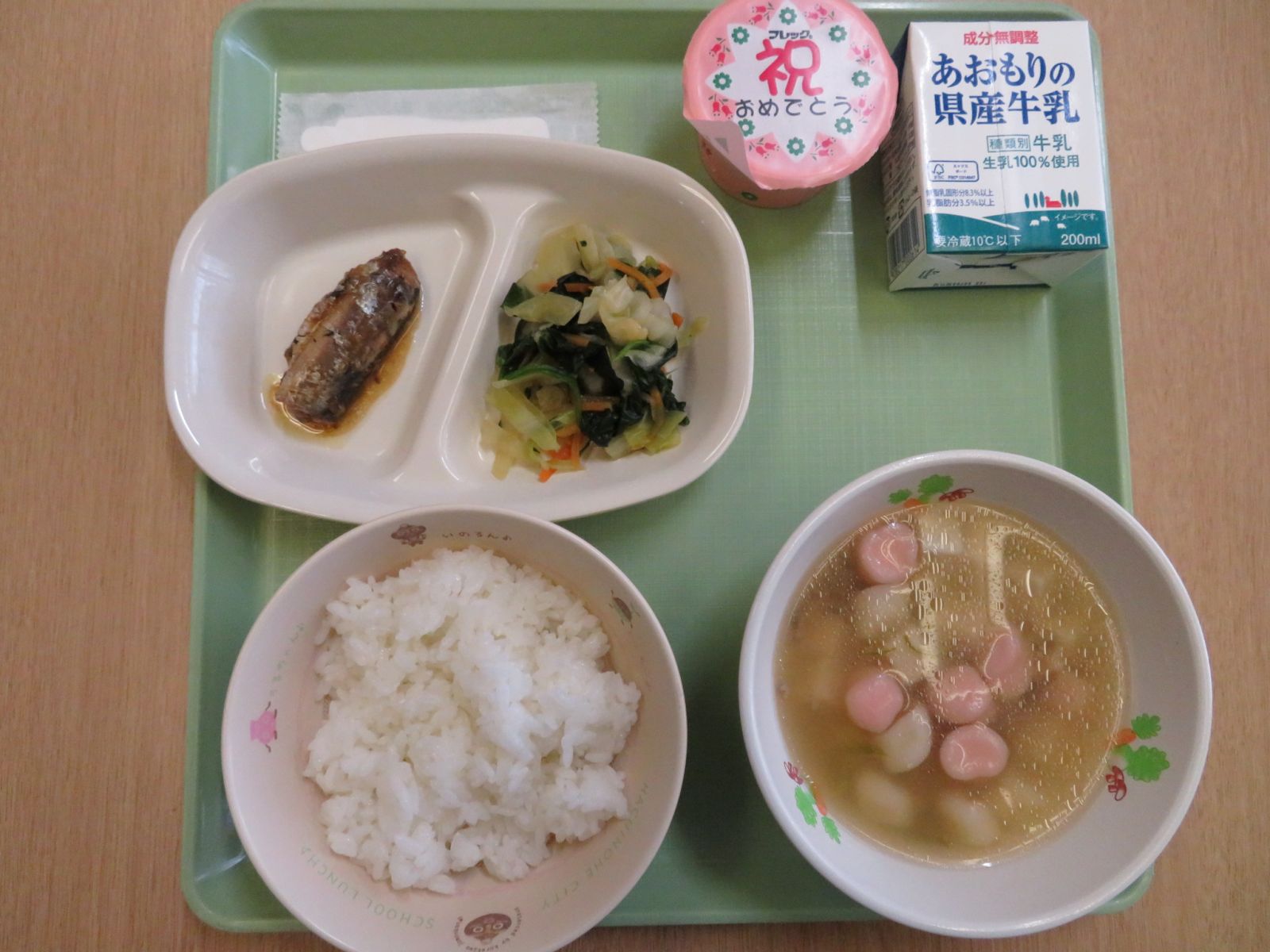 ご飯、牛乳、紅白すまし汁、いわしの味噌煮、若草和え、お祝いゼリー