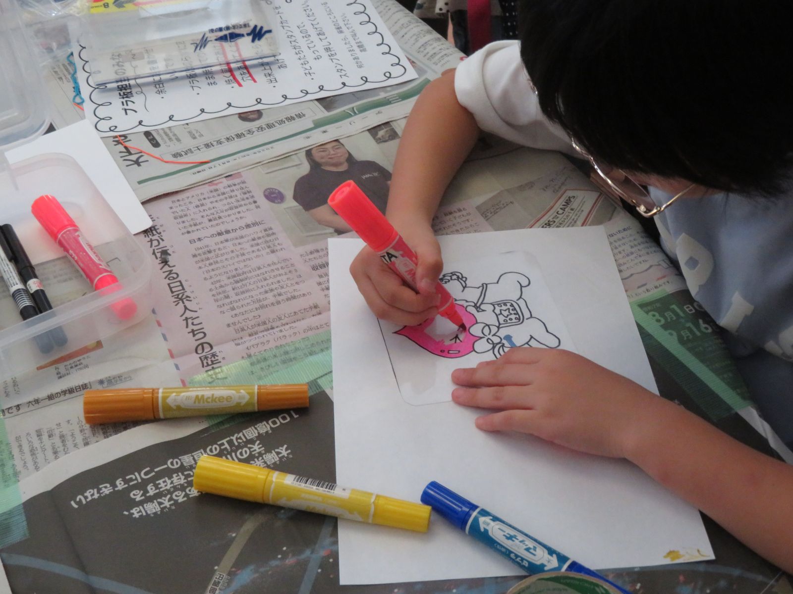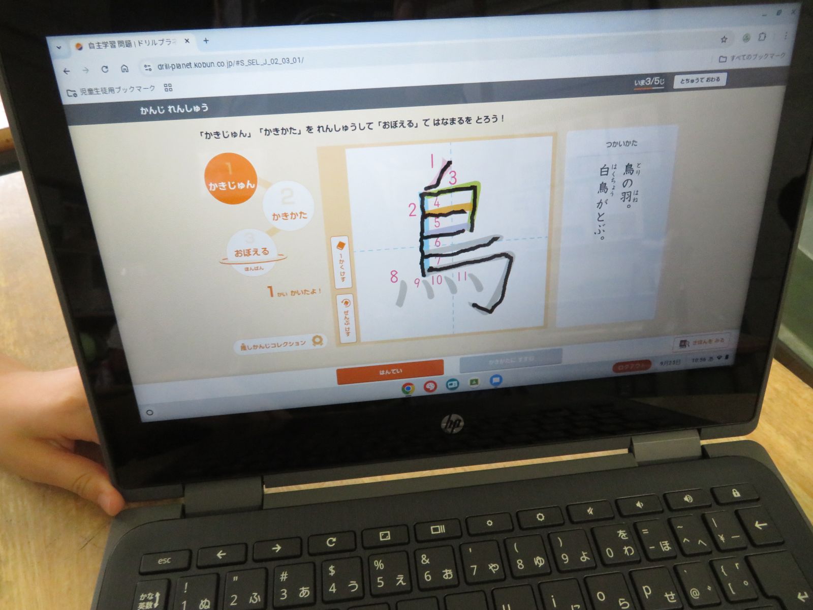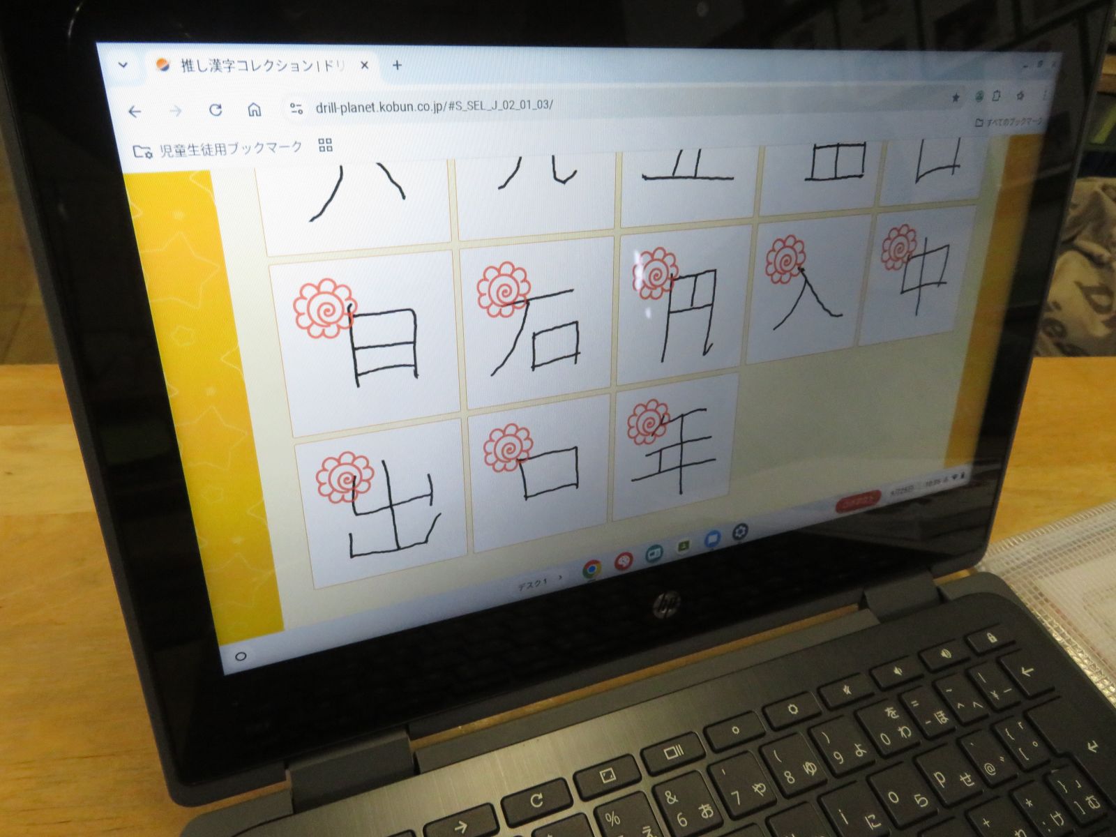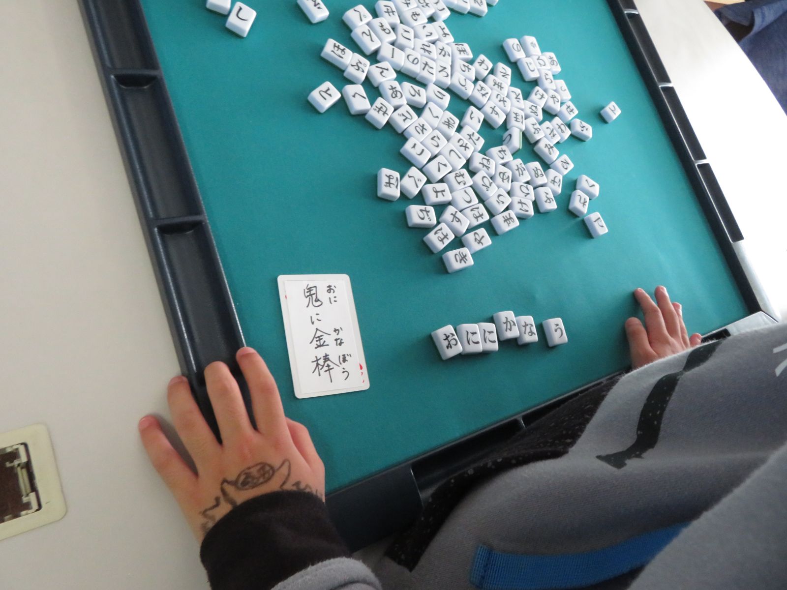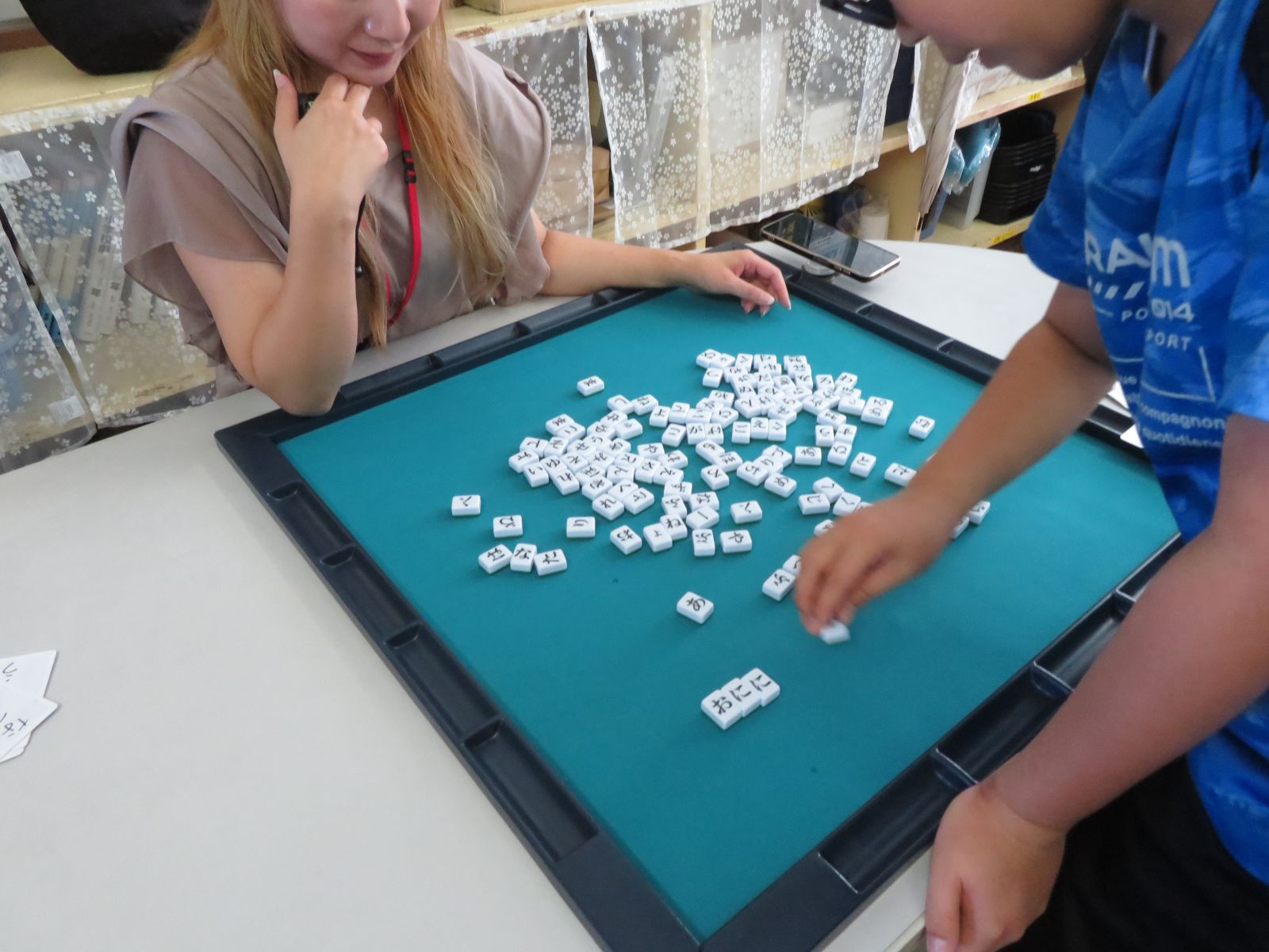 ひらがなチャレンジコーナーの様子です。ひらがなを並べていろいろな言葉を作っています。おににかなぼうと並べています。