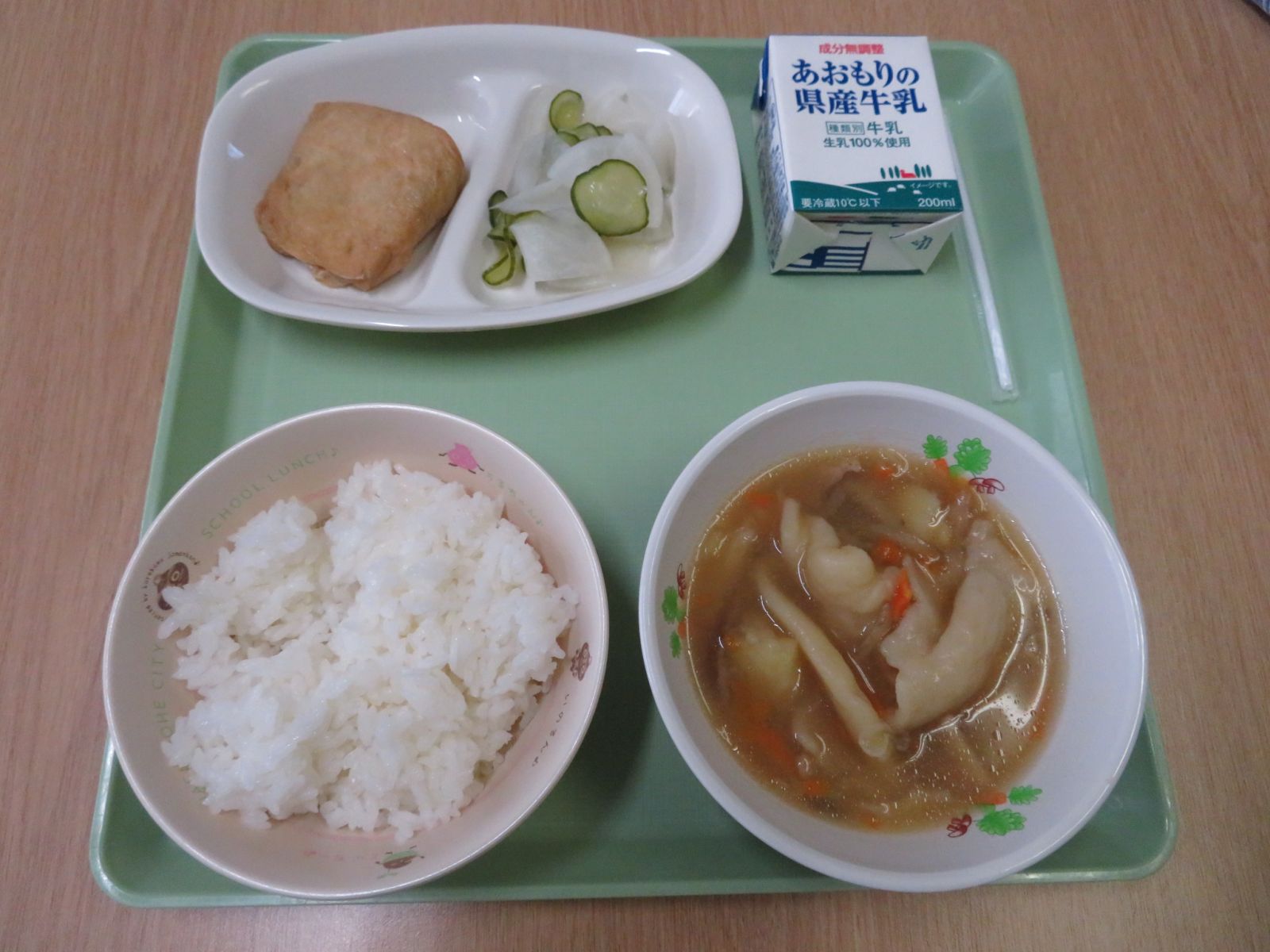 ご飯,牛乳,ひっつみ,信田煮,カブとキュウリのだし酢和え