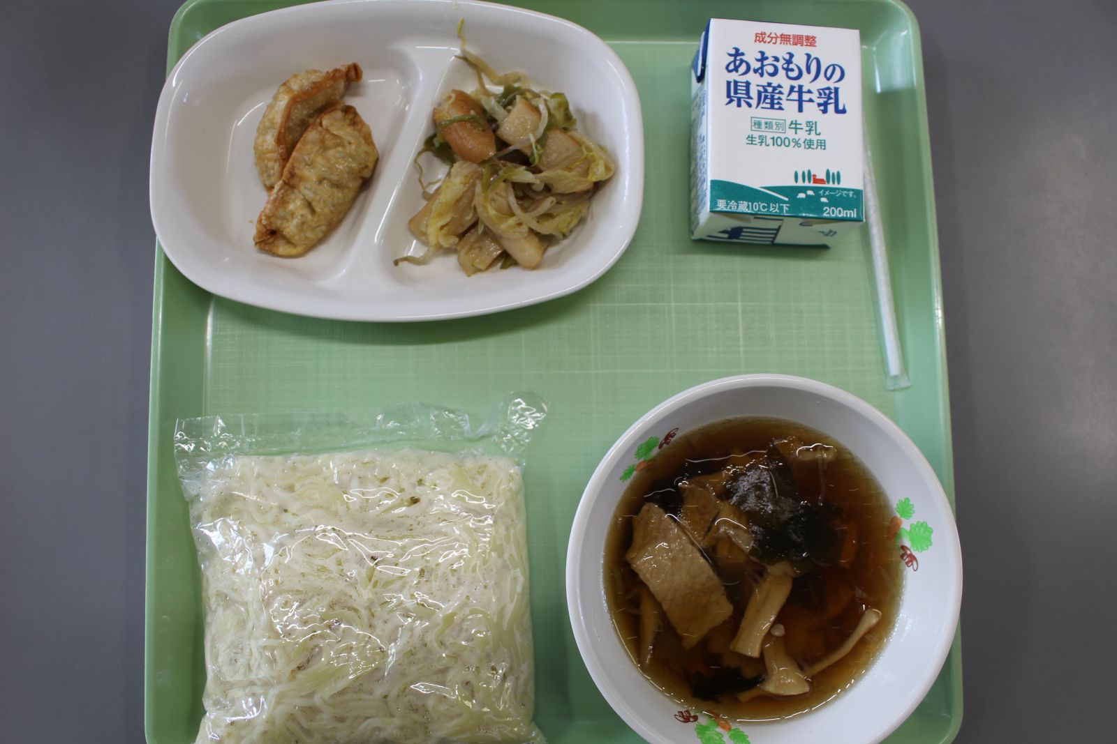 今日の献立は、中華そば、牛乳、揚げ餃子、もやしとさつまあげの炒め物 です。