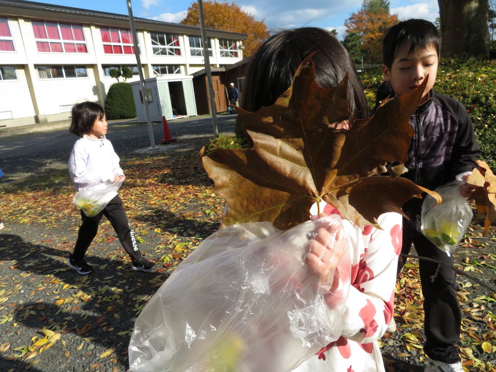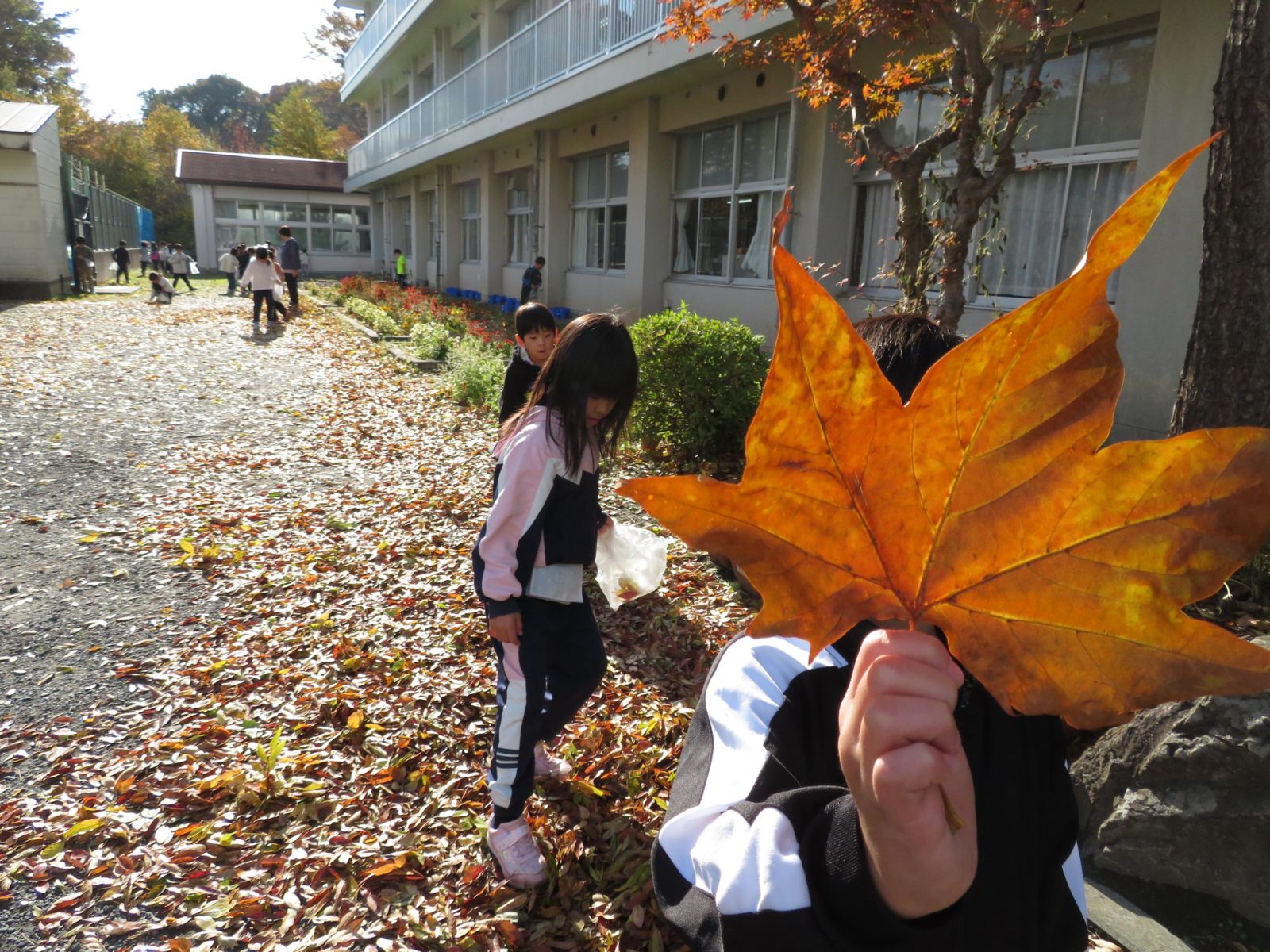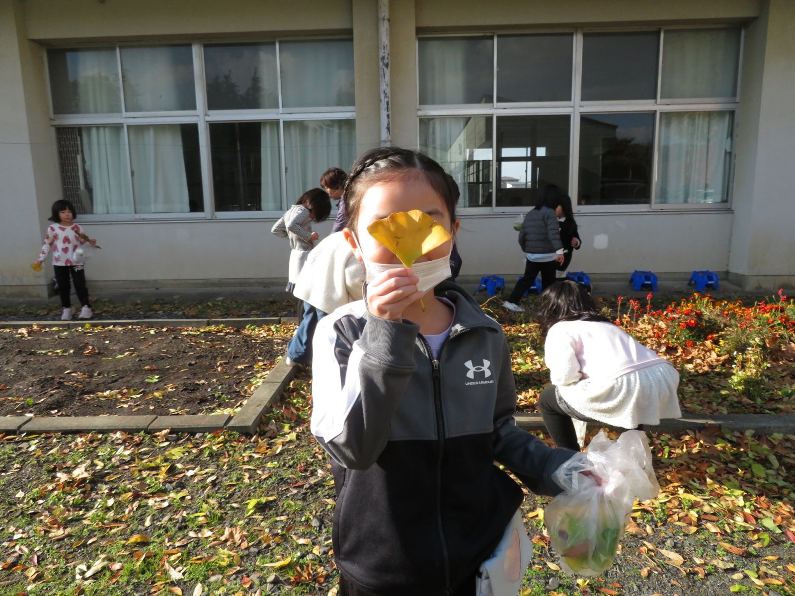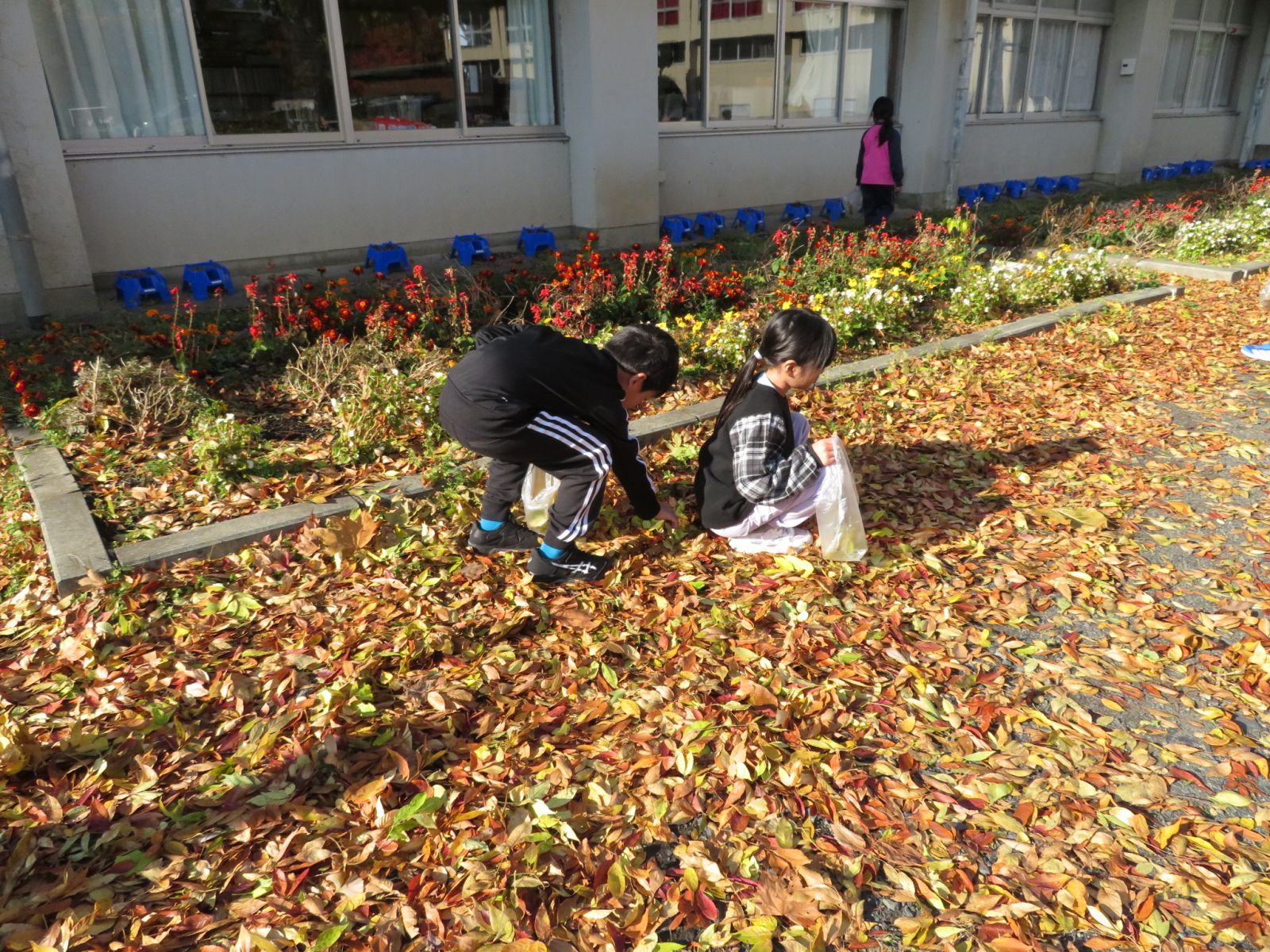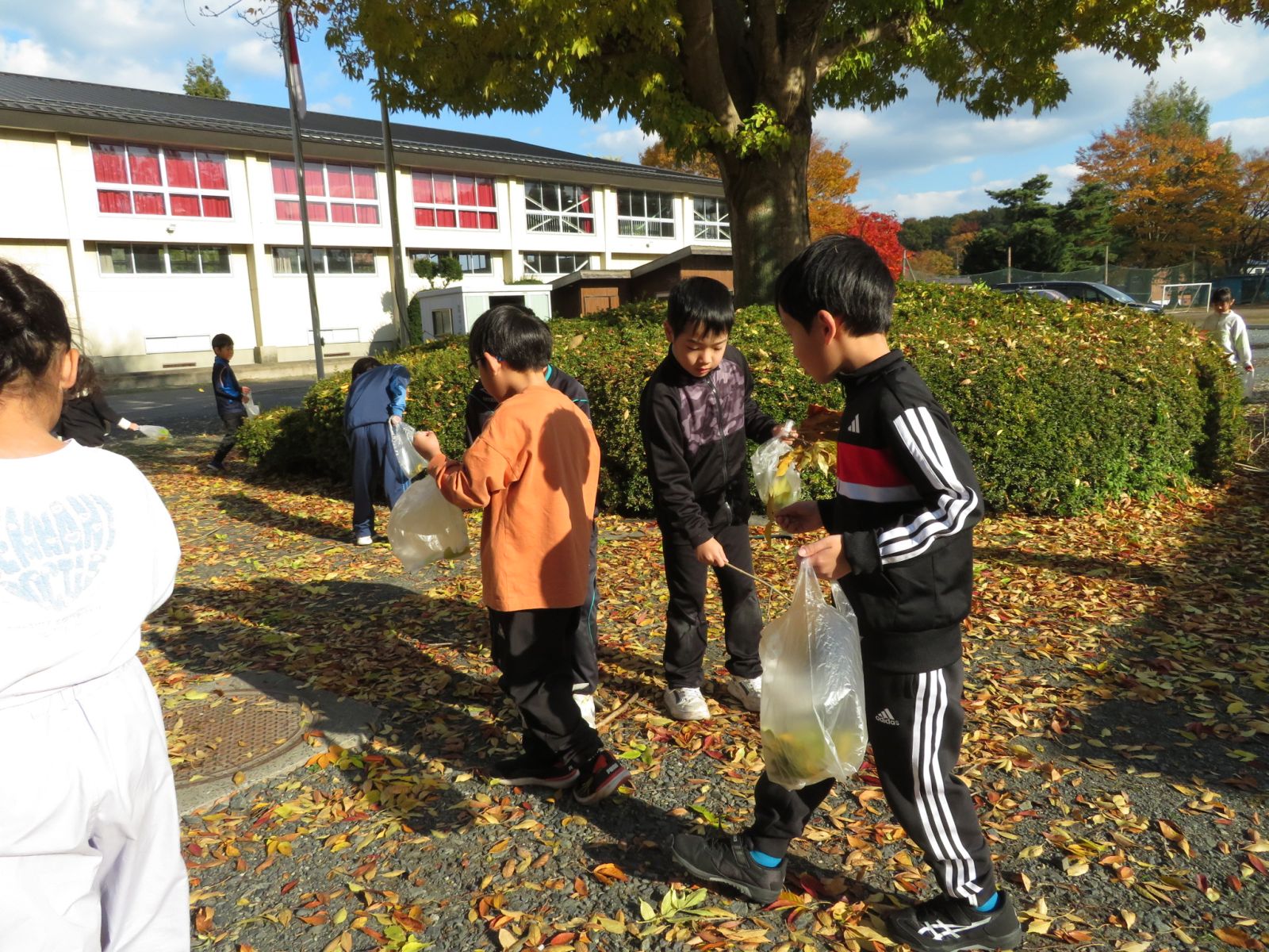 5時間目の1年生の様子です。外で落ち葉を拾っています。土曜日の風と雨の影響で落ち葉がたくさん落ちています。