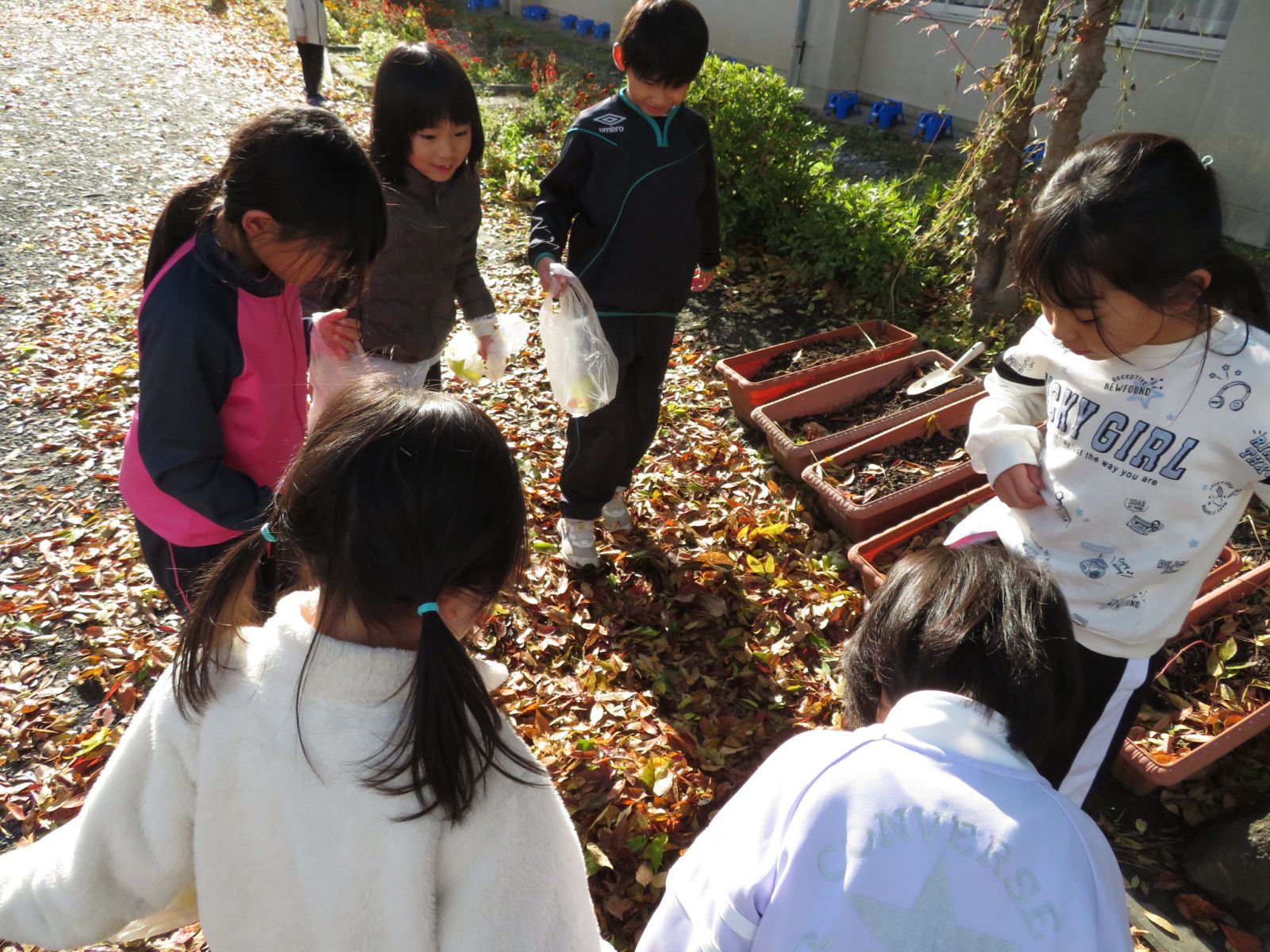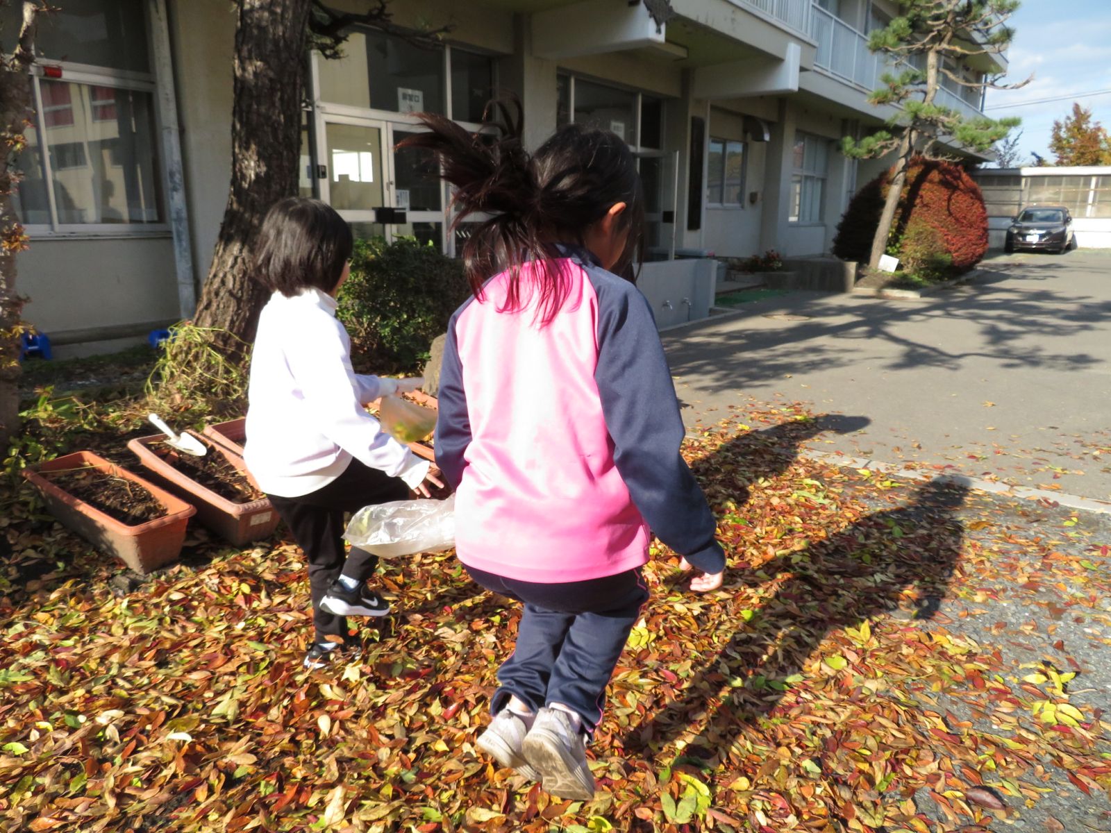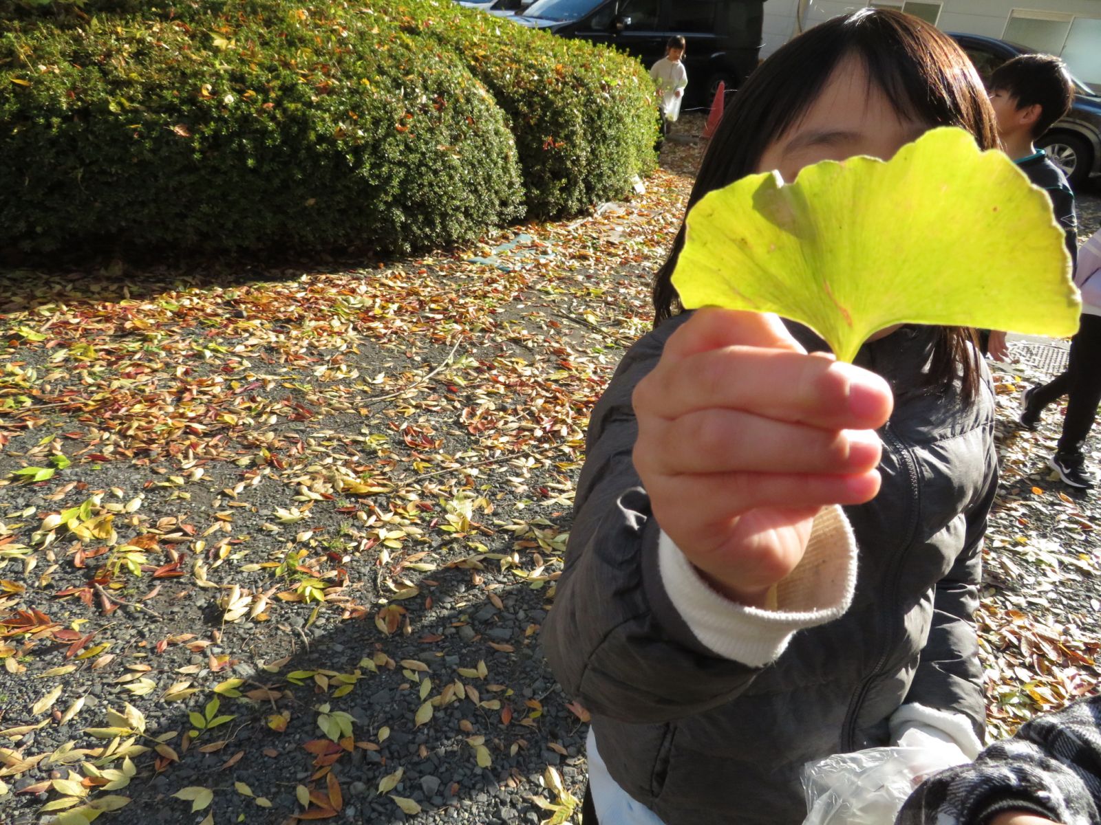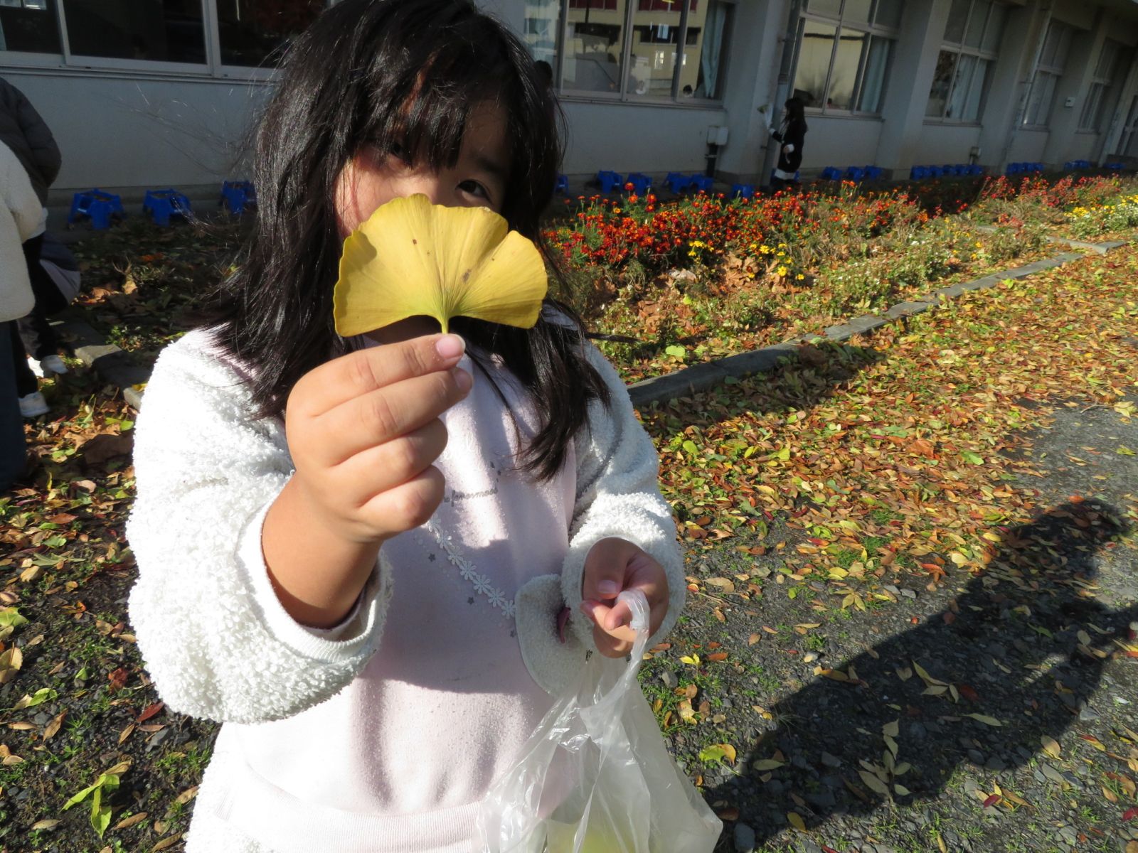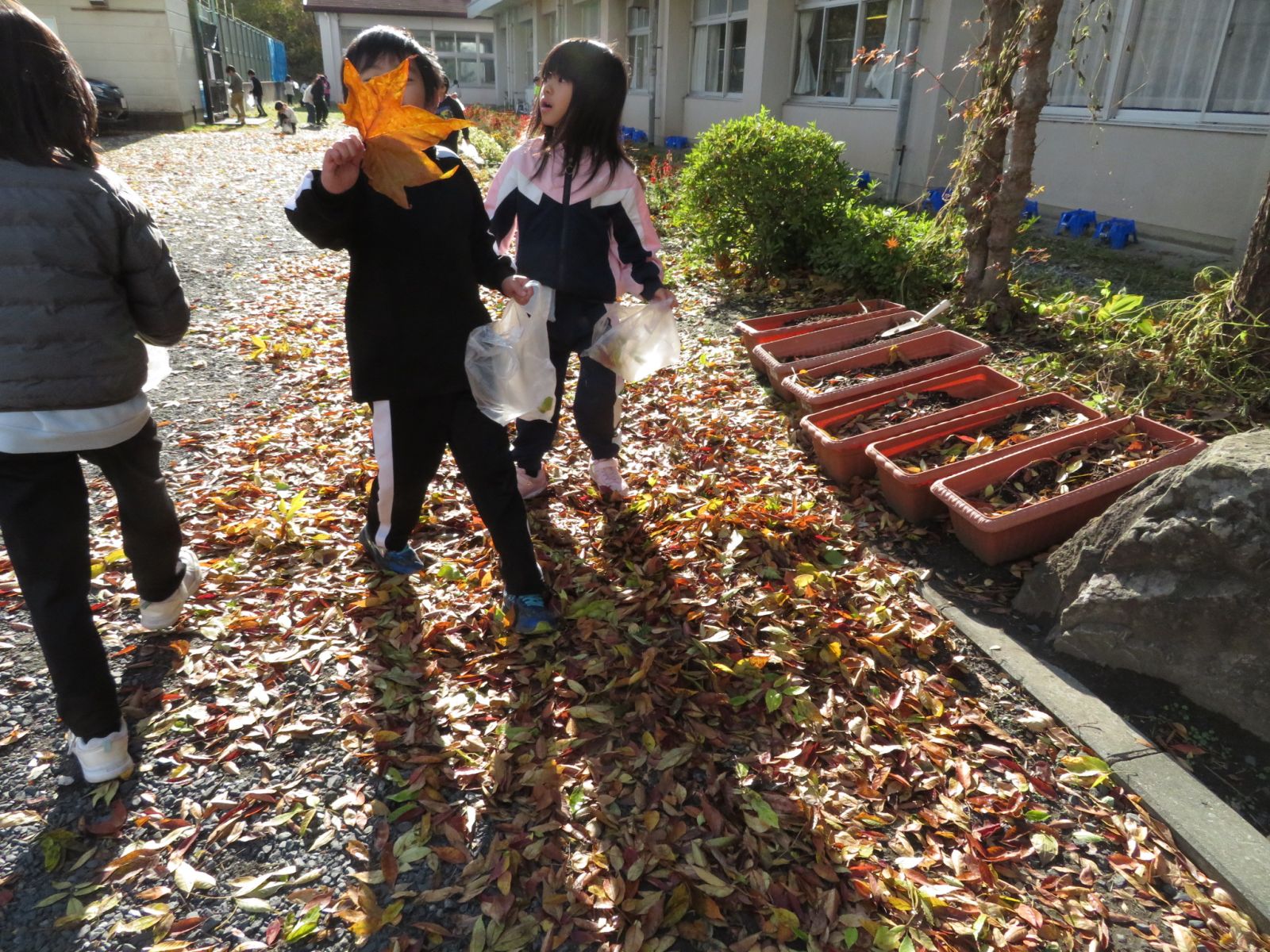 5時間目の1年生の様子です。外で落ち葉を拾っています。土曜日の風と雨の影響で落ち葉がたくさん落ちています。