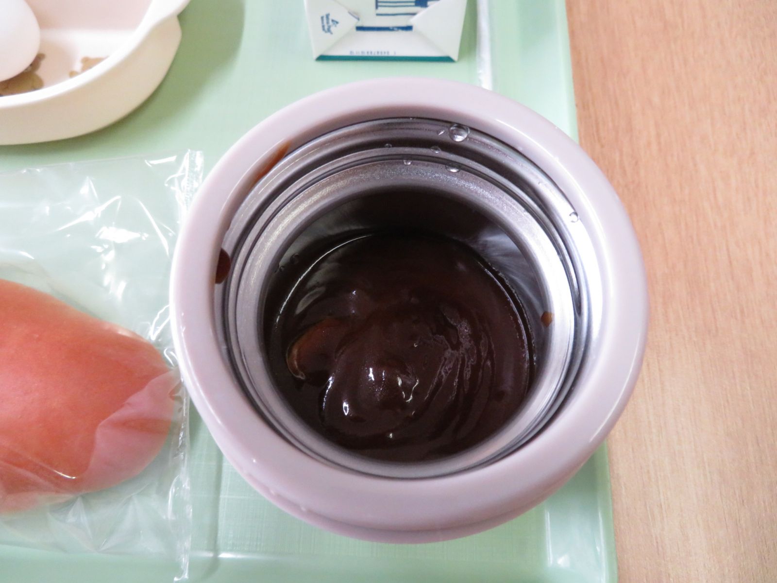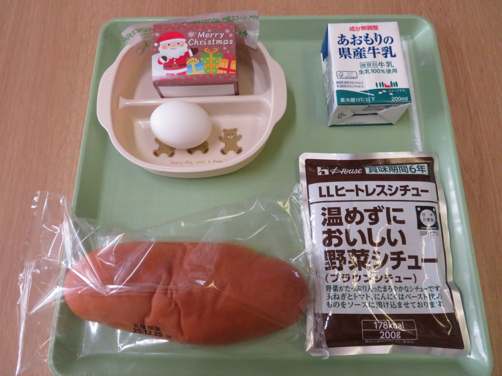 今日の給食は,コッペパン(1・2年生は丸パン),牛乳,野菜シチュー,ゆでたまご,クリスマスケーキ(チョコレート)でした。野菜シチューはヒートレスのブラウンシチューで子どもたちからも「おいしかったよ。」という声がたくさん聞かれました。