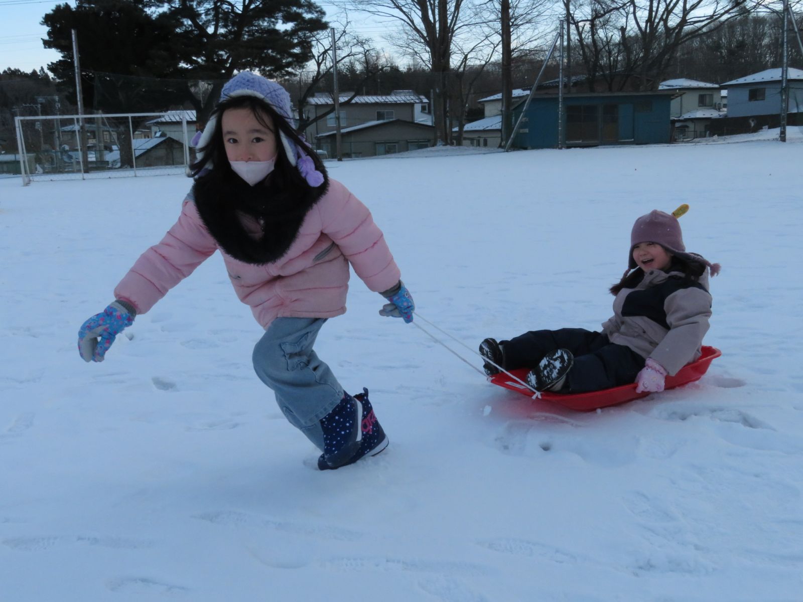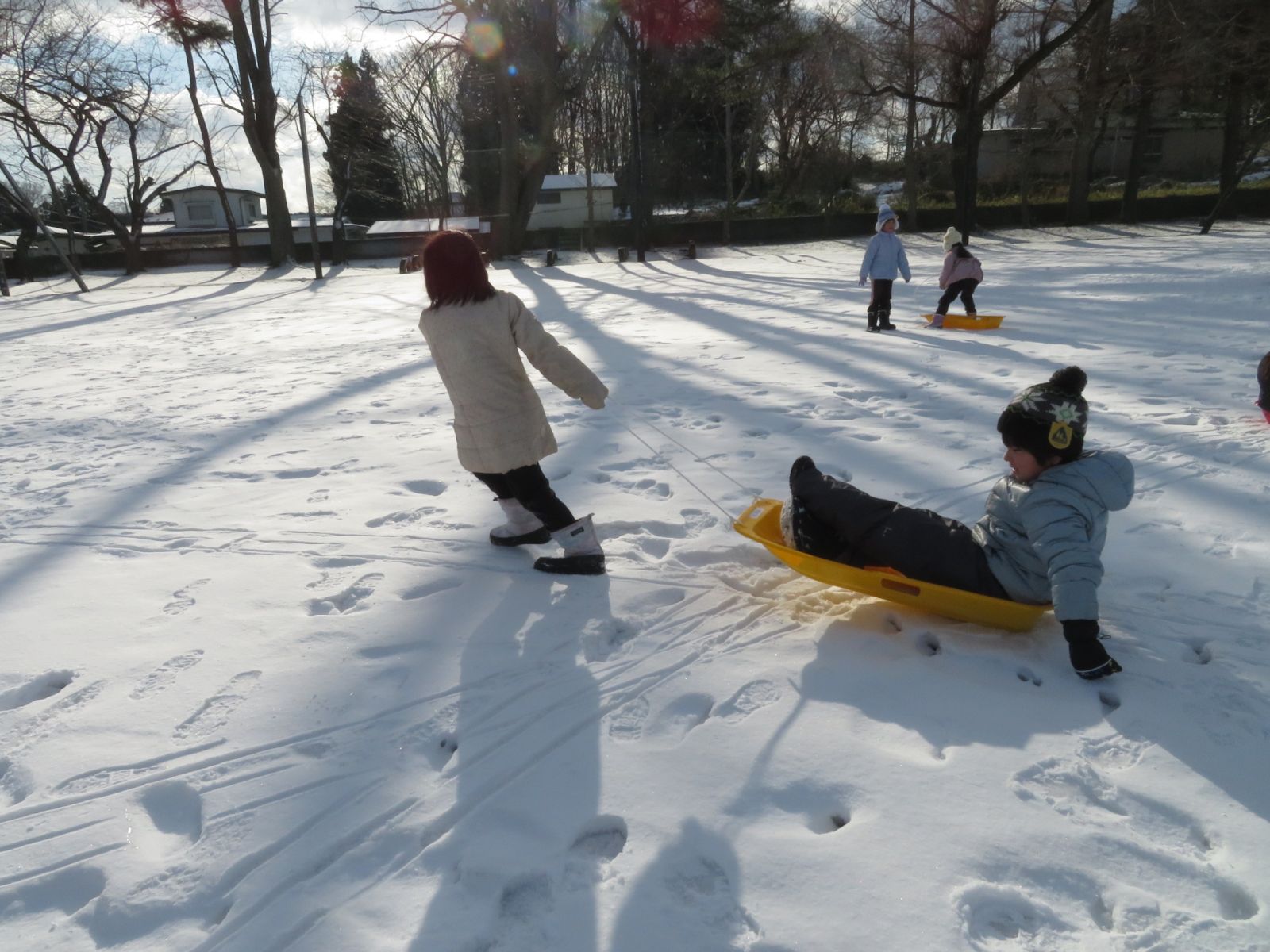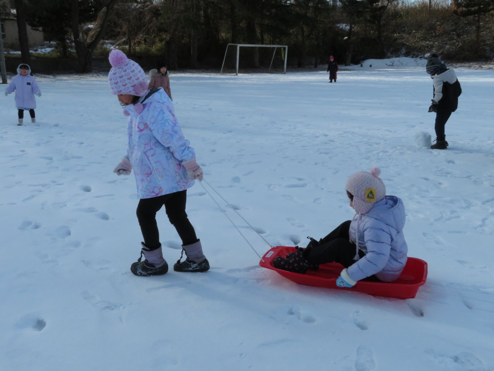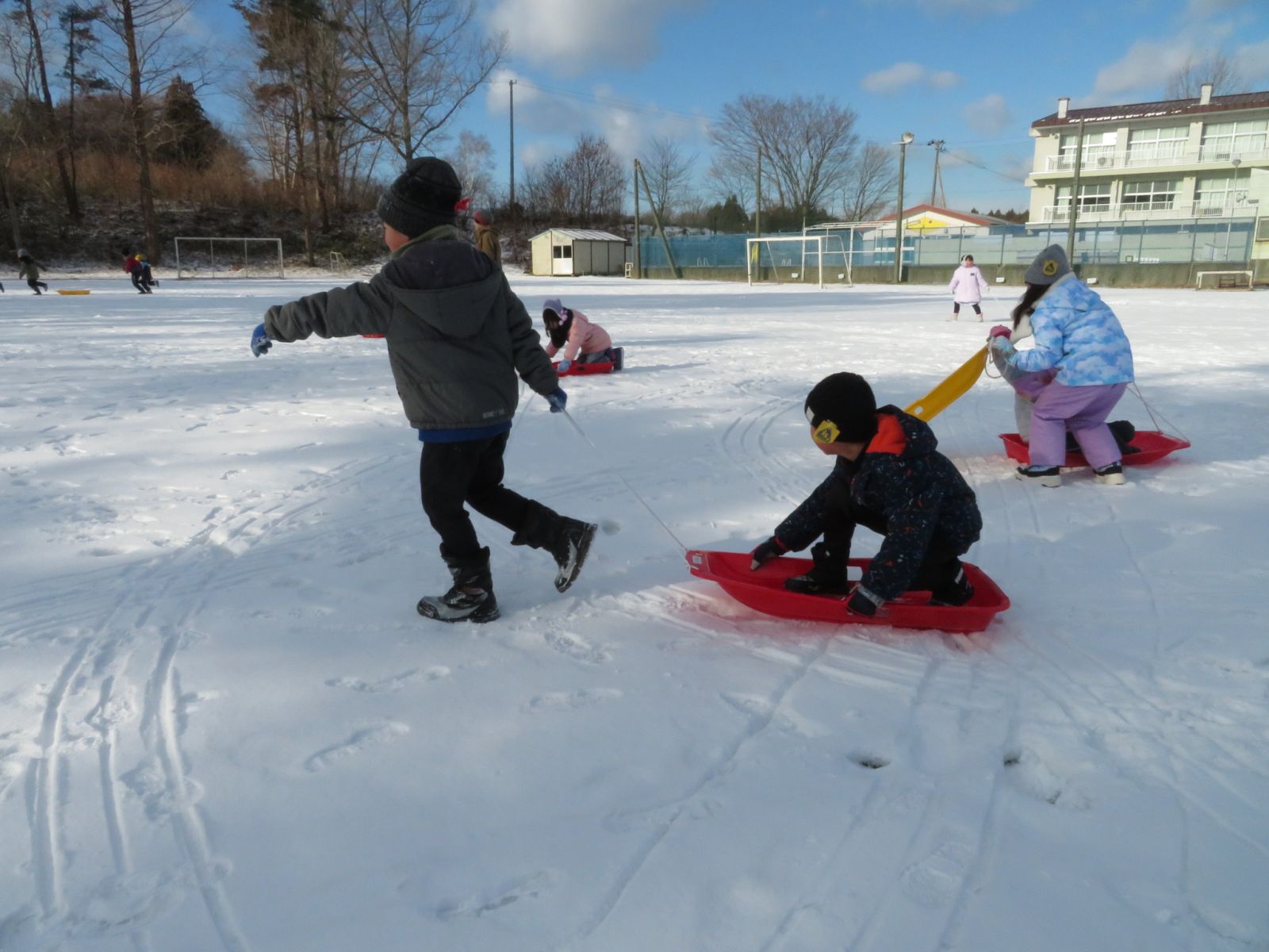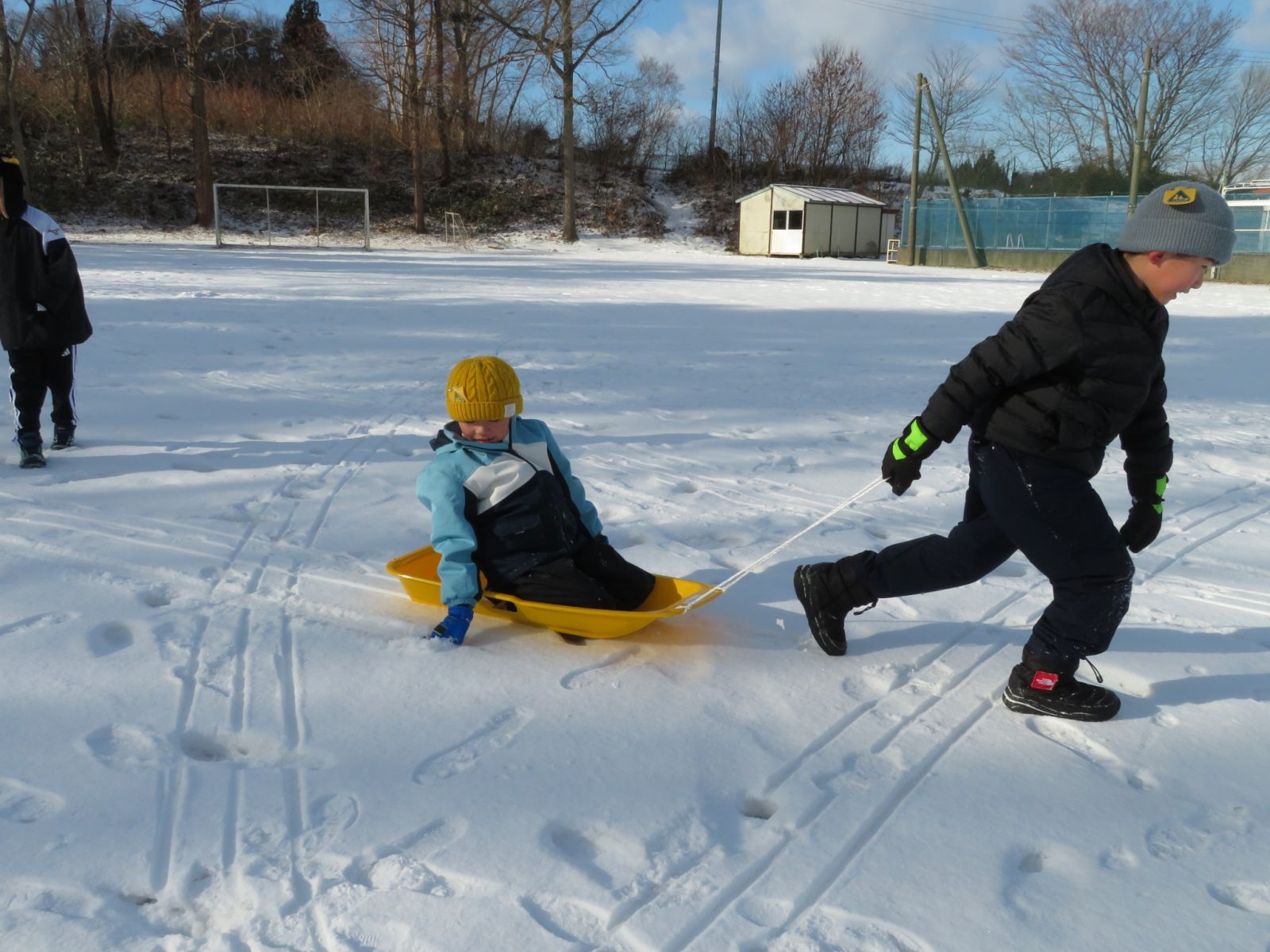 を作ったりして楽しみました。校庭に雪が積もるといろいろな遊びができて楽しくなりますね。たくさんのそりが校庭を走り回っていました。