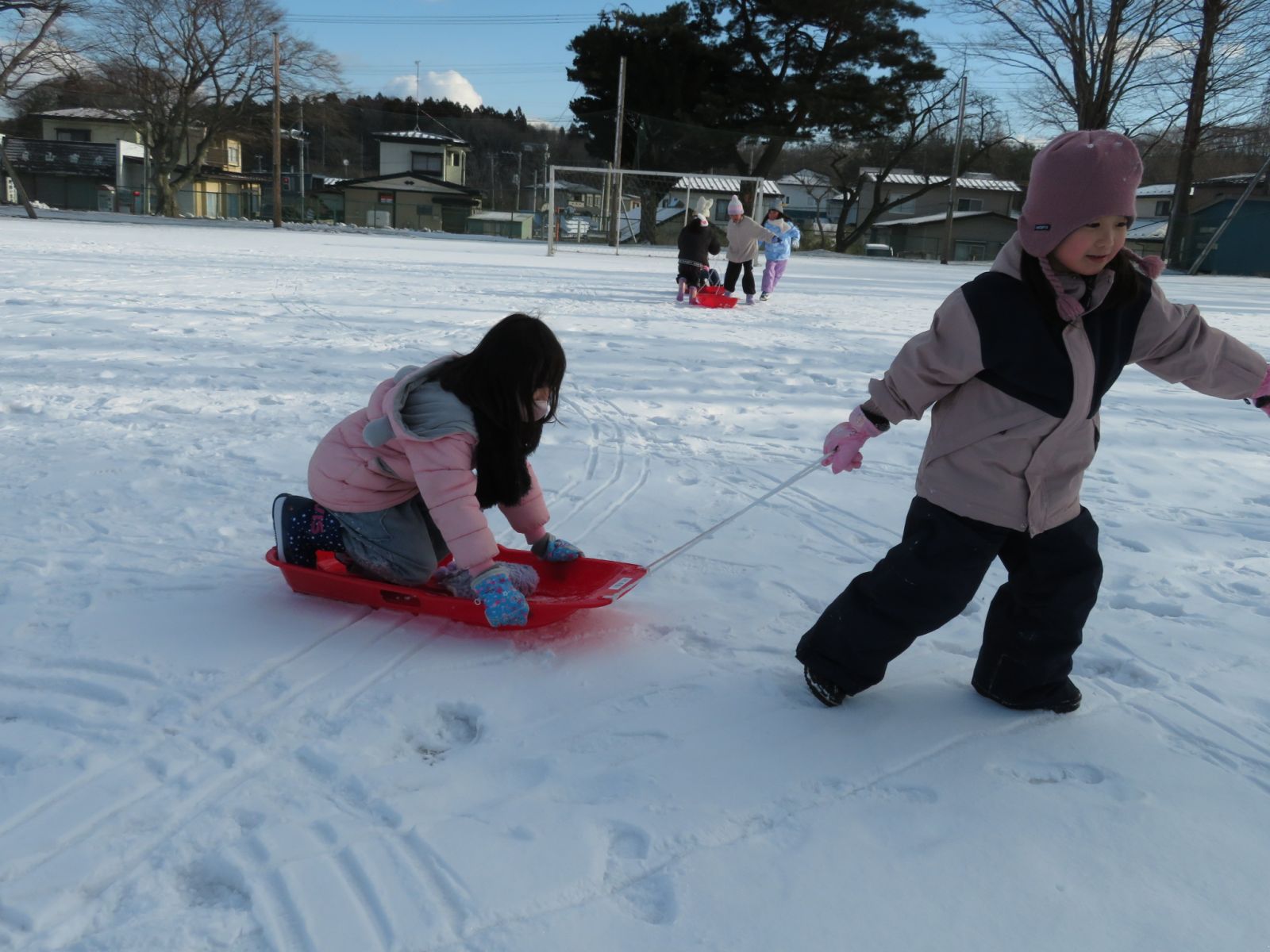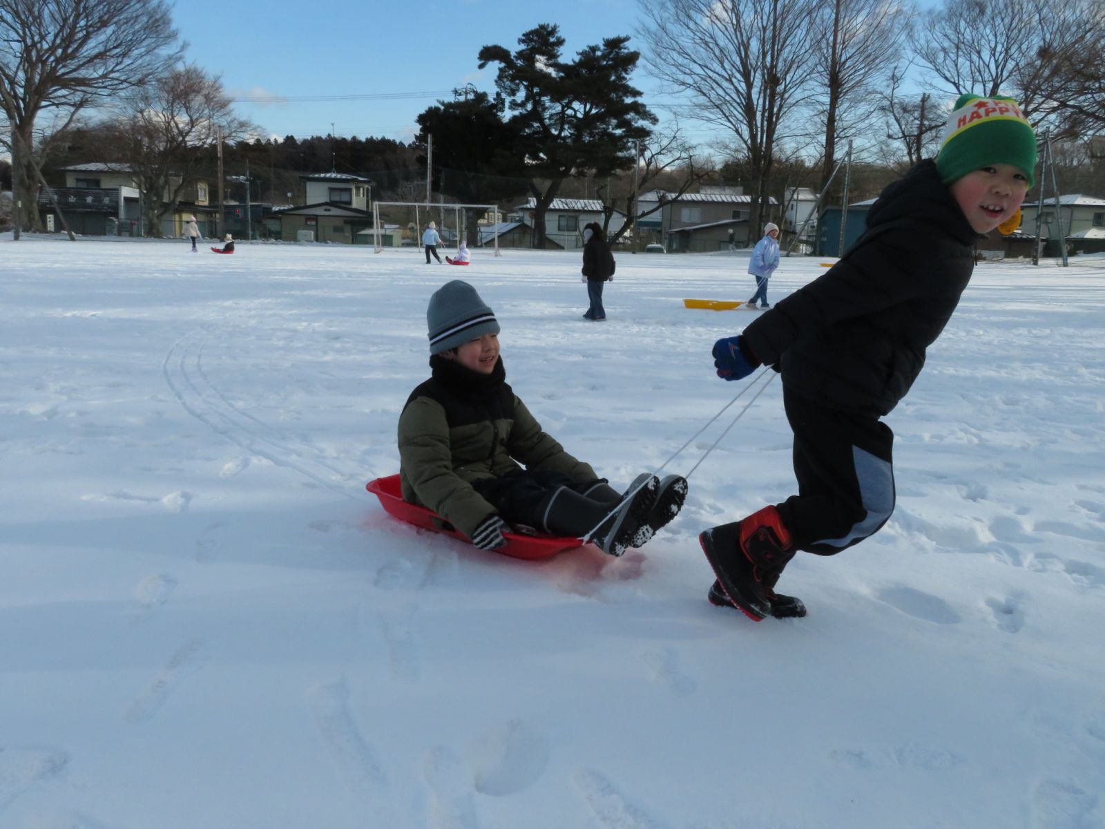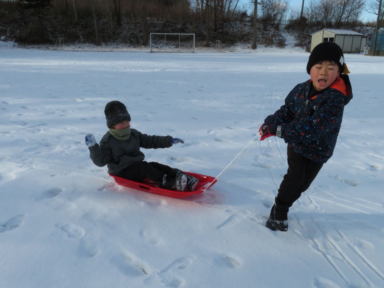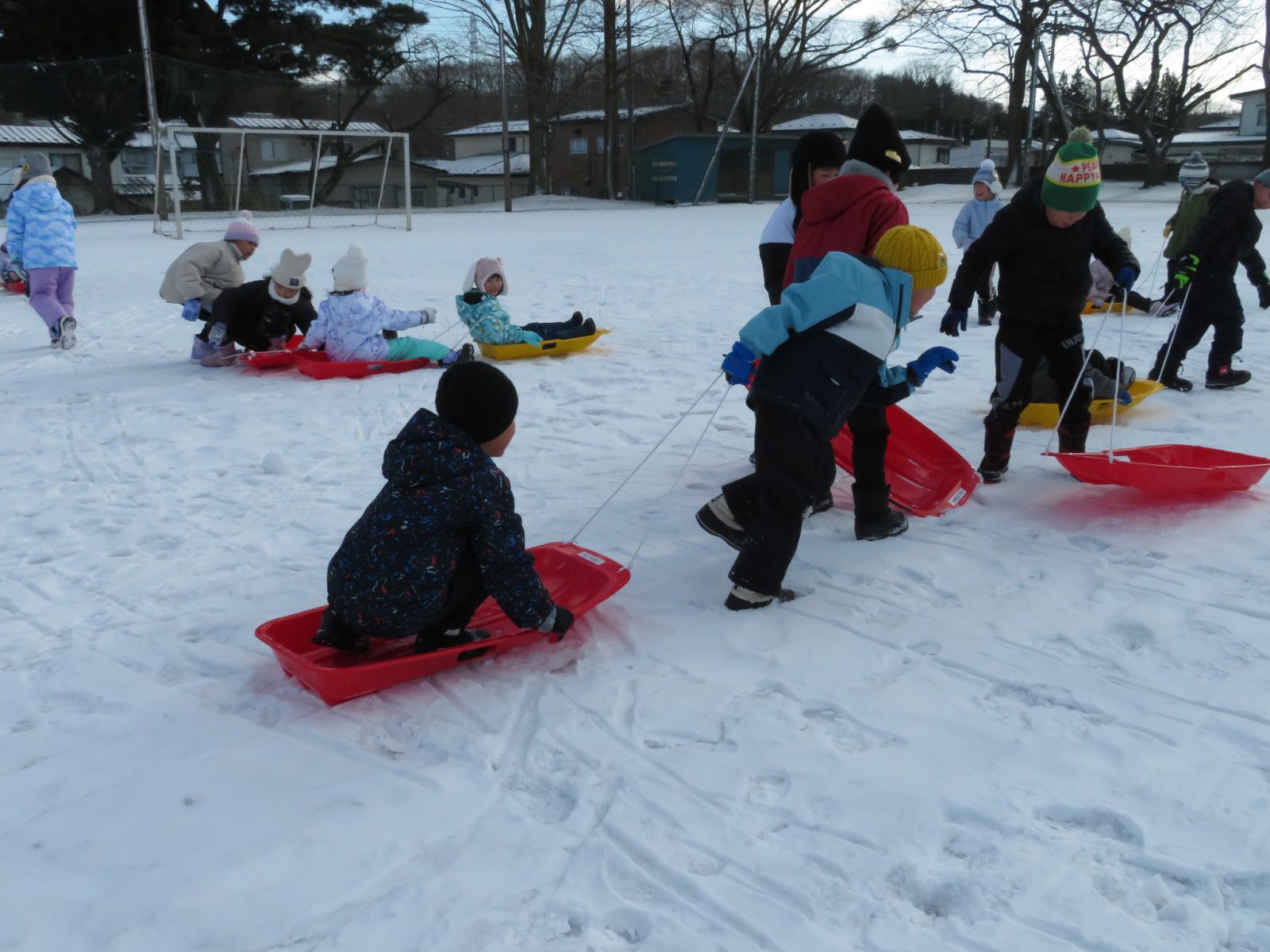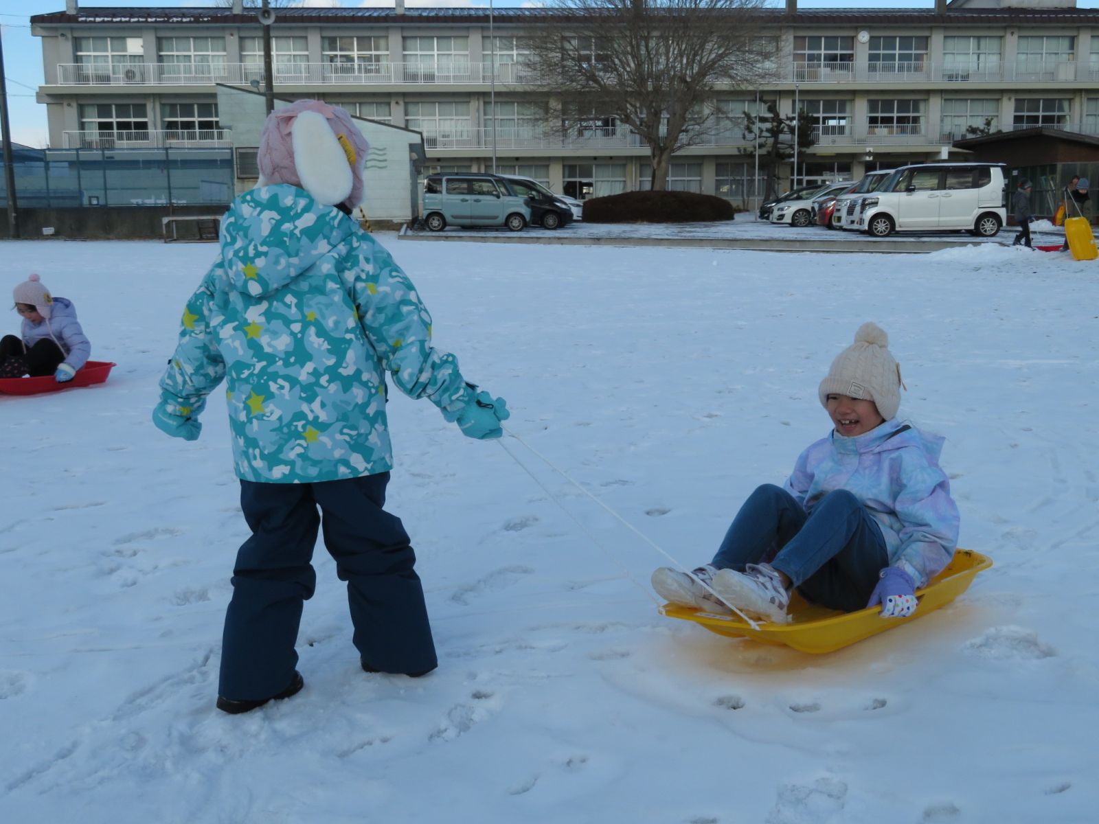 を作ったりして楽しみました。校庭に雪が積もるといろいろな遊びができて楽しくなりますね。たくさんのそりが校庭を走り回っていました。