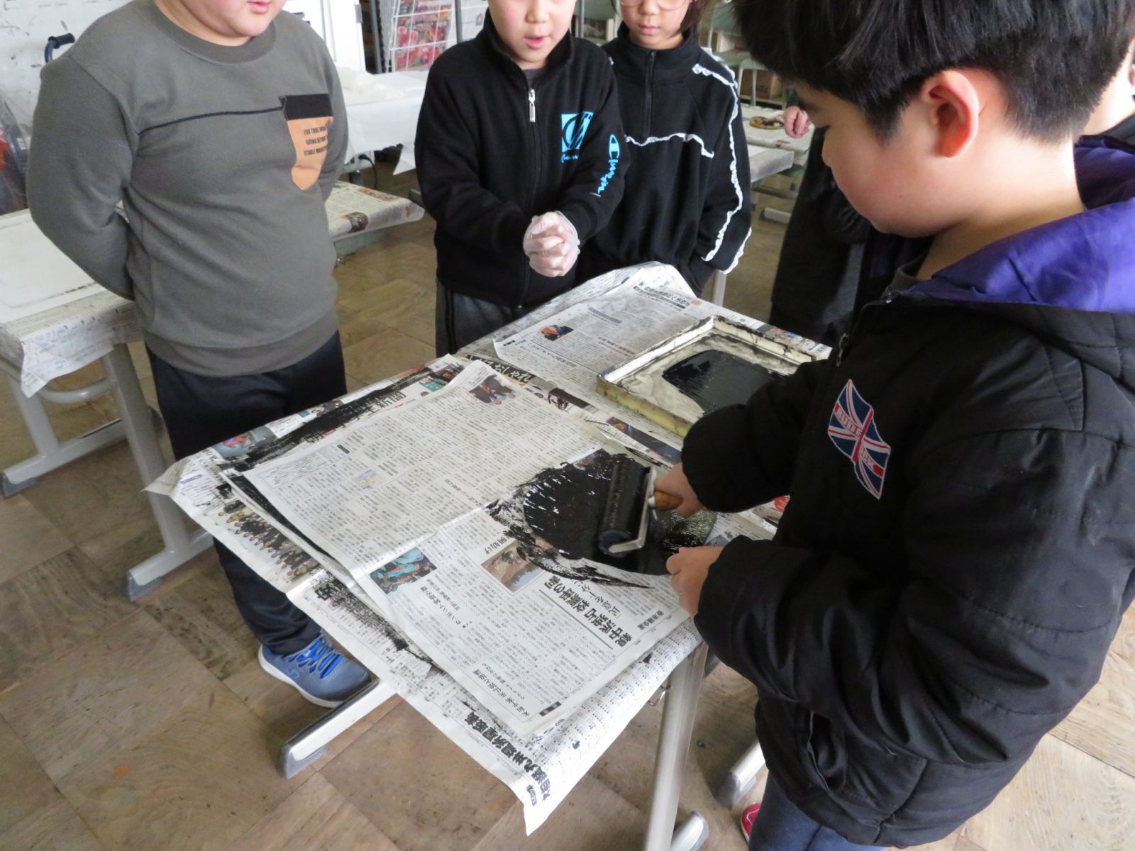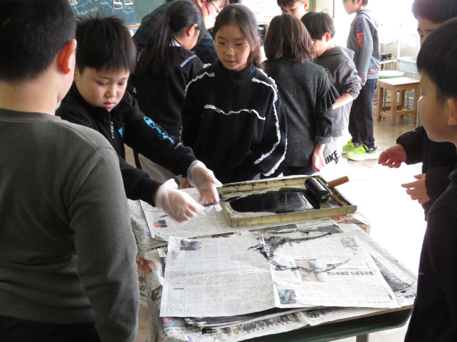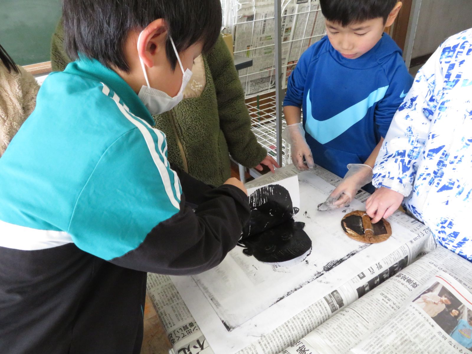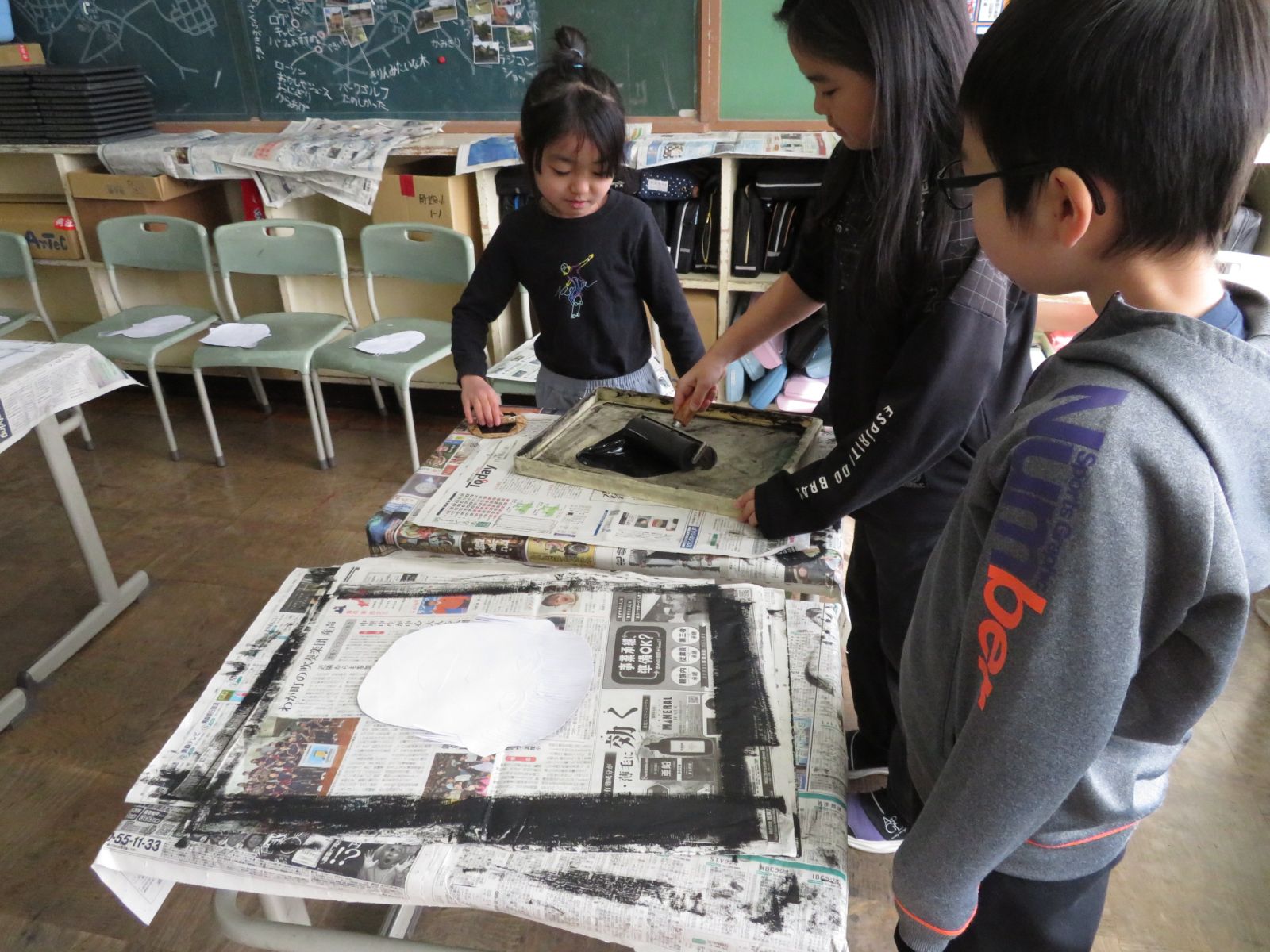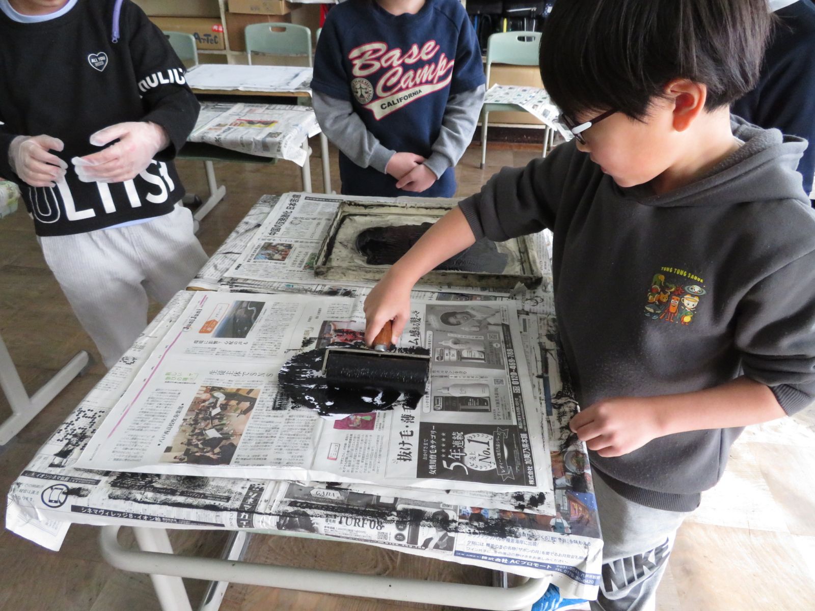「つけすぎちゃだめだよ。」,「ツルツルが下だよ。」などと声をかけ合いながら版画をすっています。どんな作品になるのかな。完成がとても楽しみです。