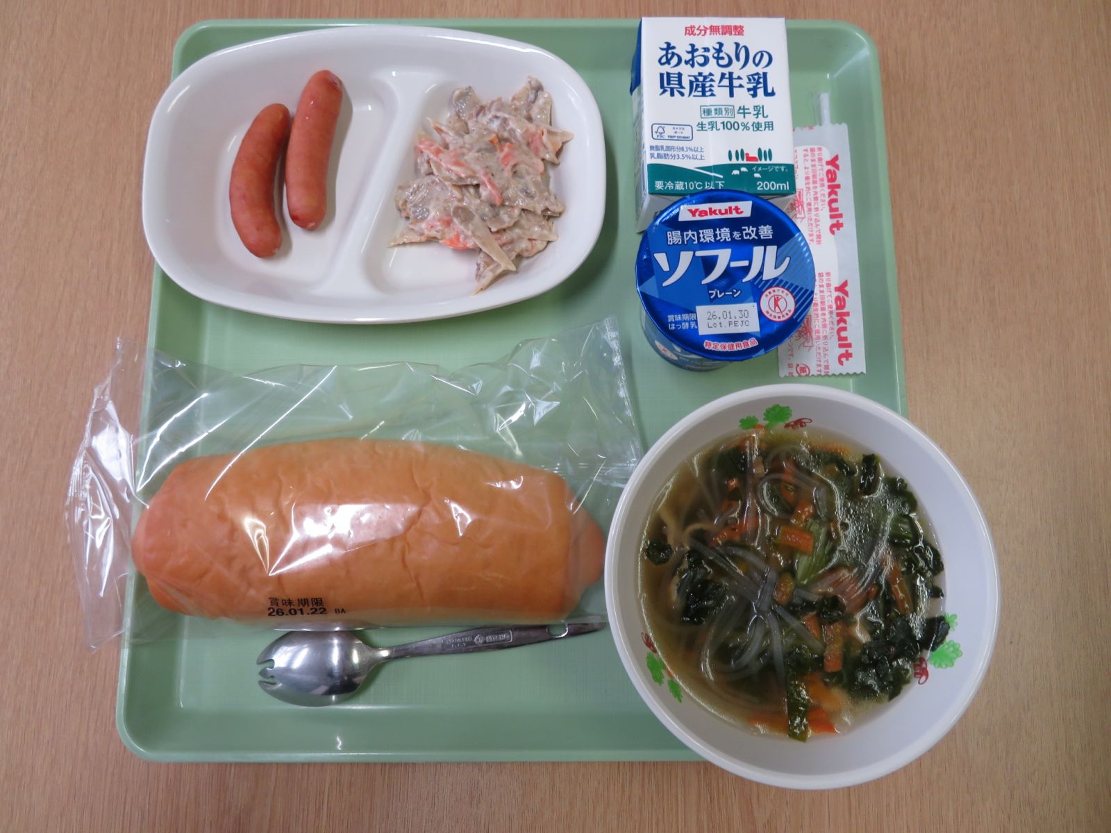 コッペパン(1・2年生は丸パン),牛乳,チンゲン菜スープ,ボイルドウインナー,ごまごぼうサラダ,ヨーグルト