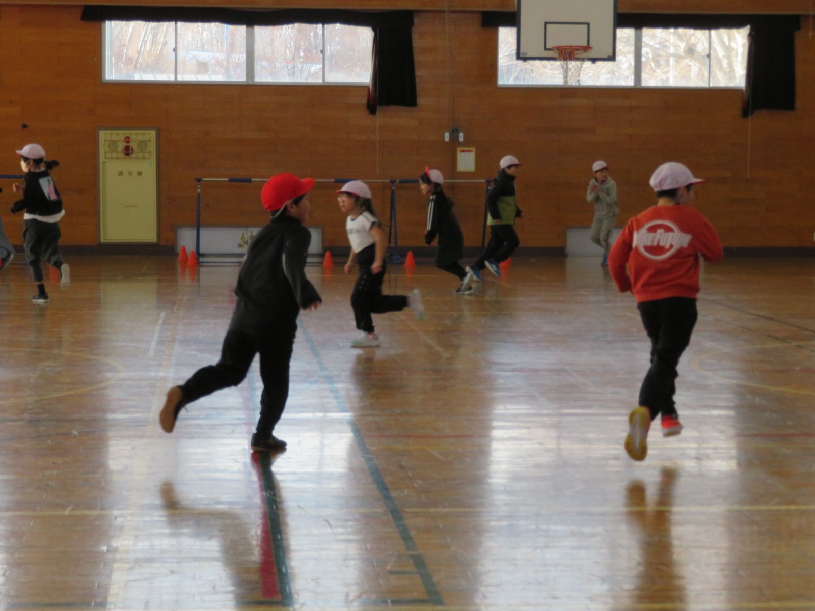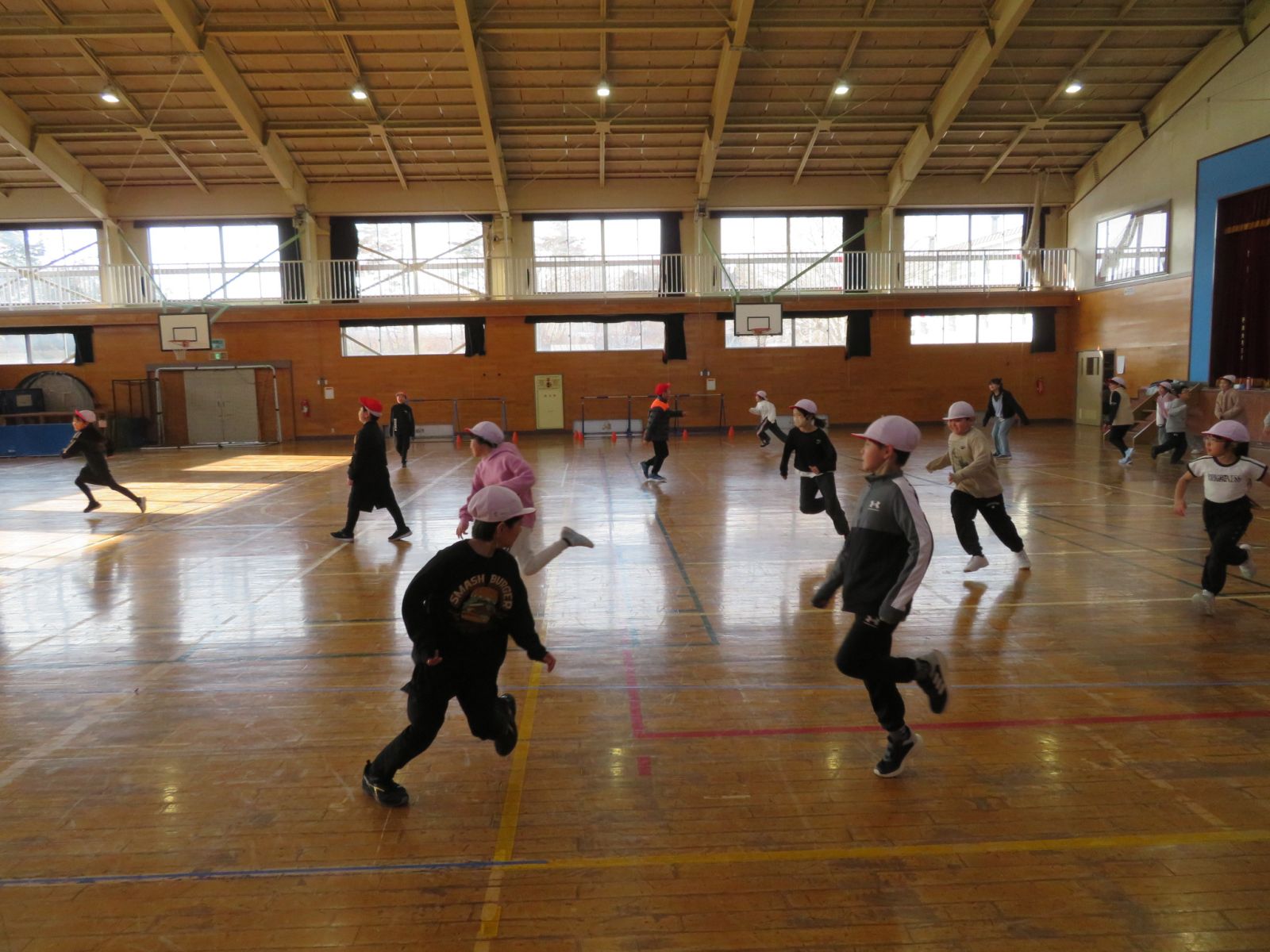 をして体をあたためています。今日は体育館の中がかなり冷え込んでいますが,元気な3年生の熱気が体育館いっぱいに広がっていました。